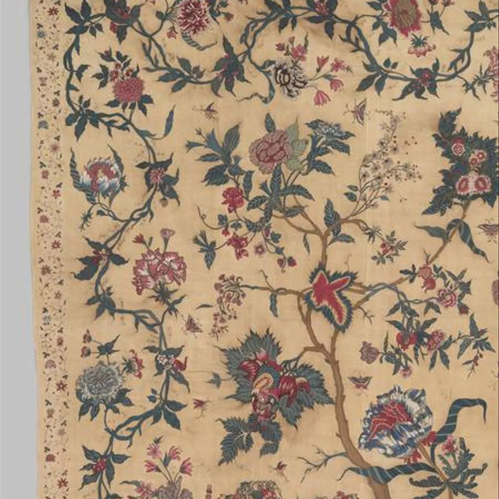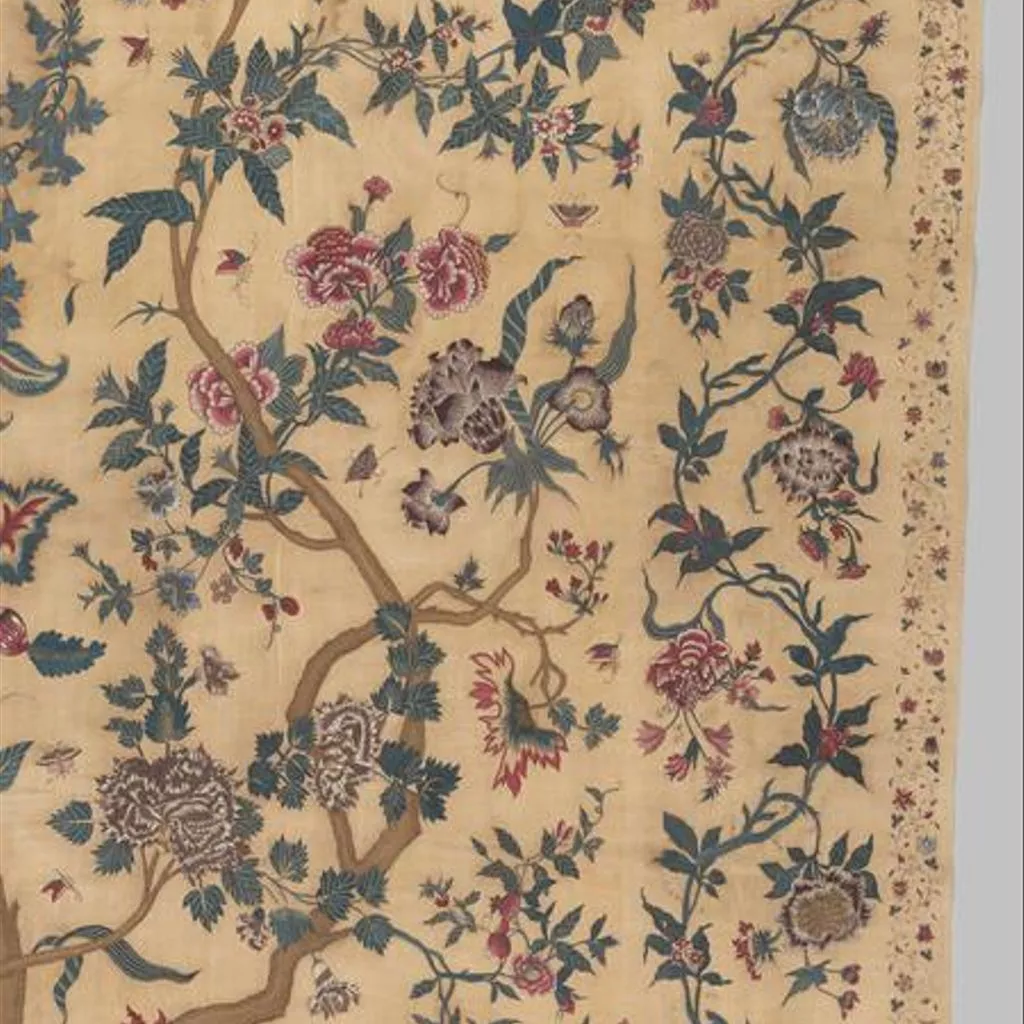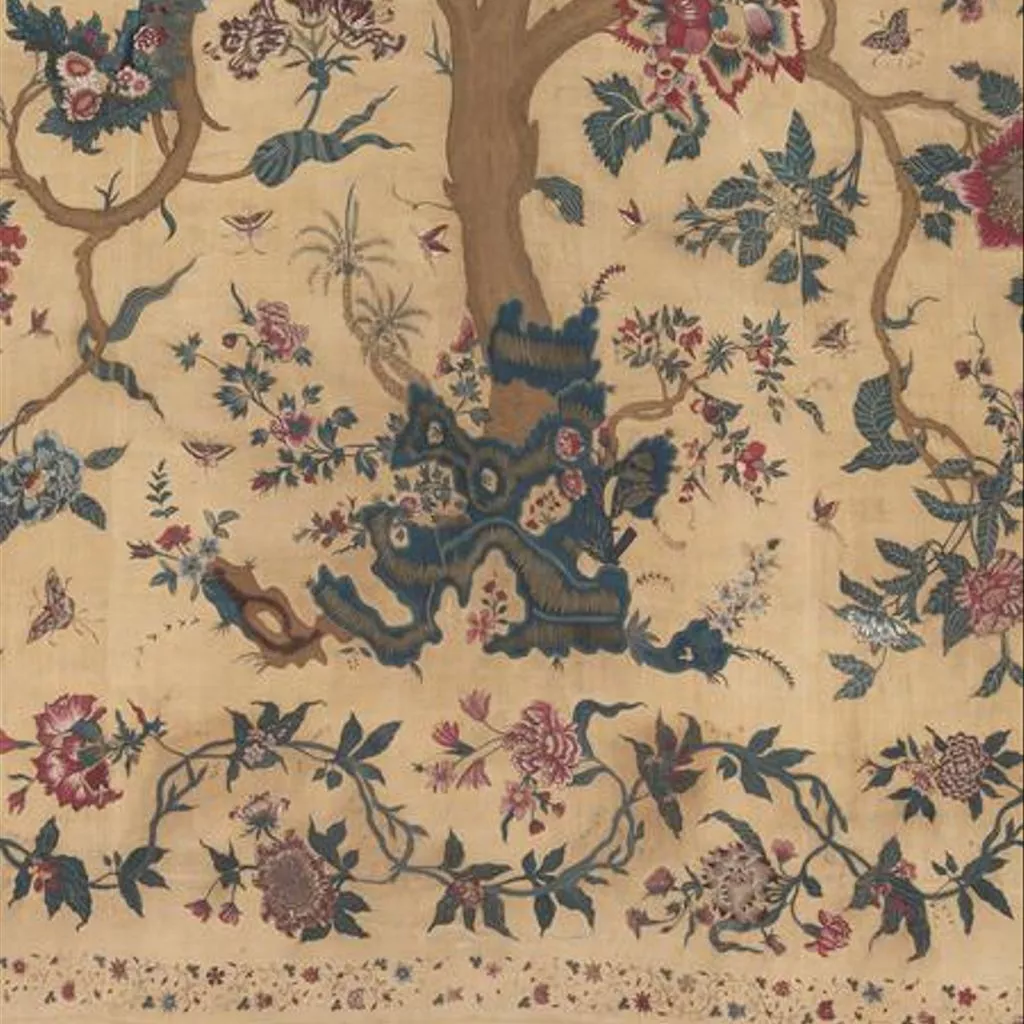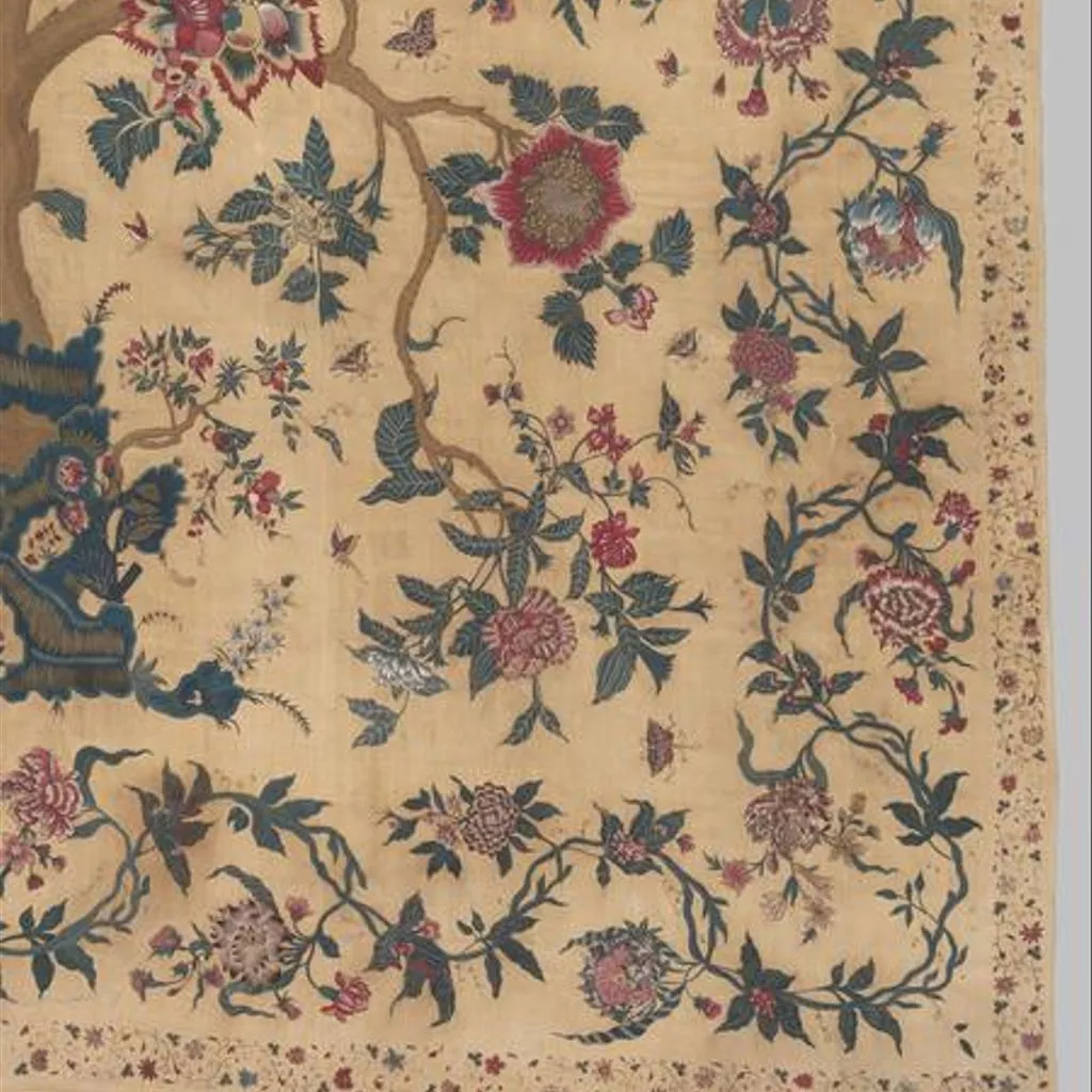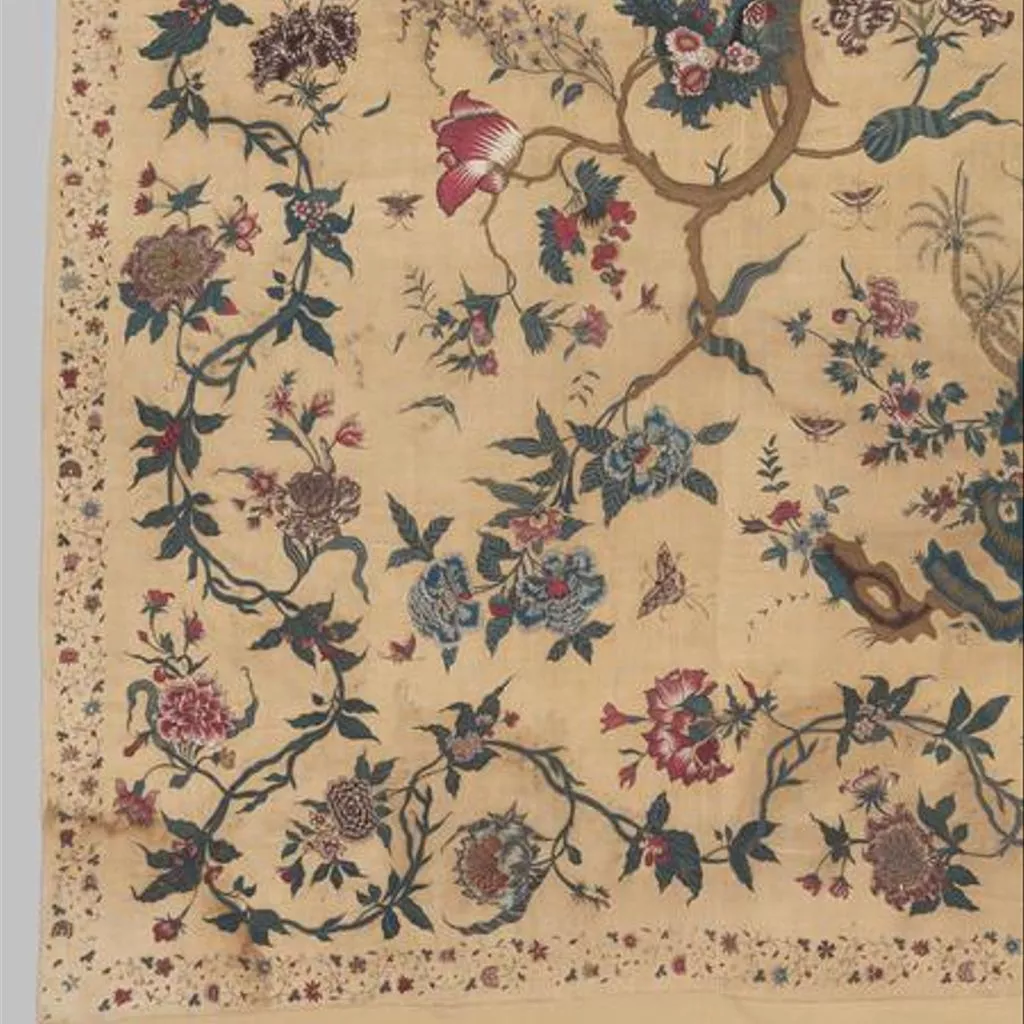 Painted cotton chintz bedcovers and hangings ('palampores') with tree designs were widely used in Britain and Holland in the 18th century, and they were also made in embroidered versions, like this one. Embroidered palampores were particularly popular in Holland.