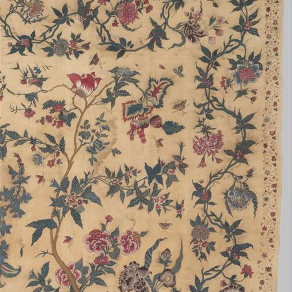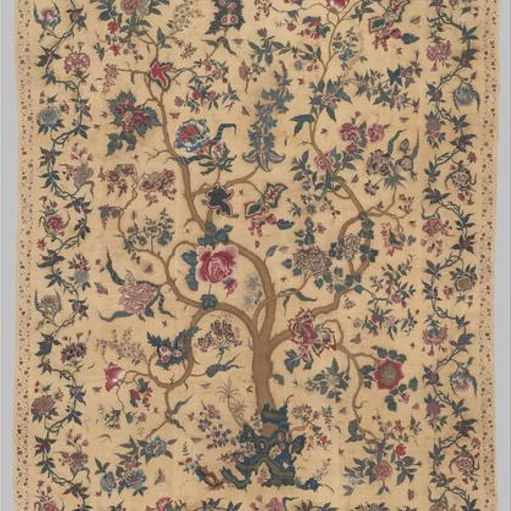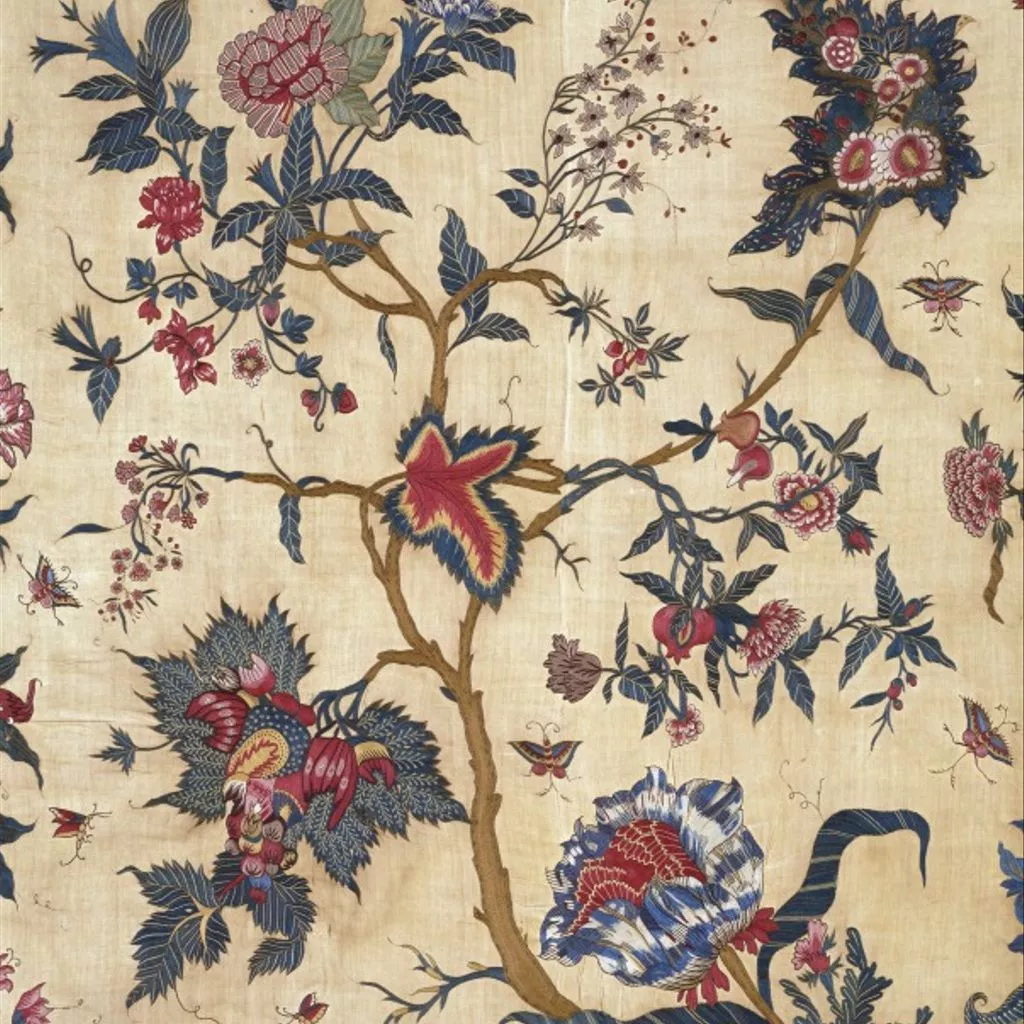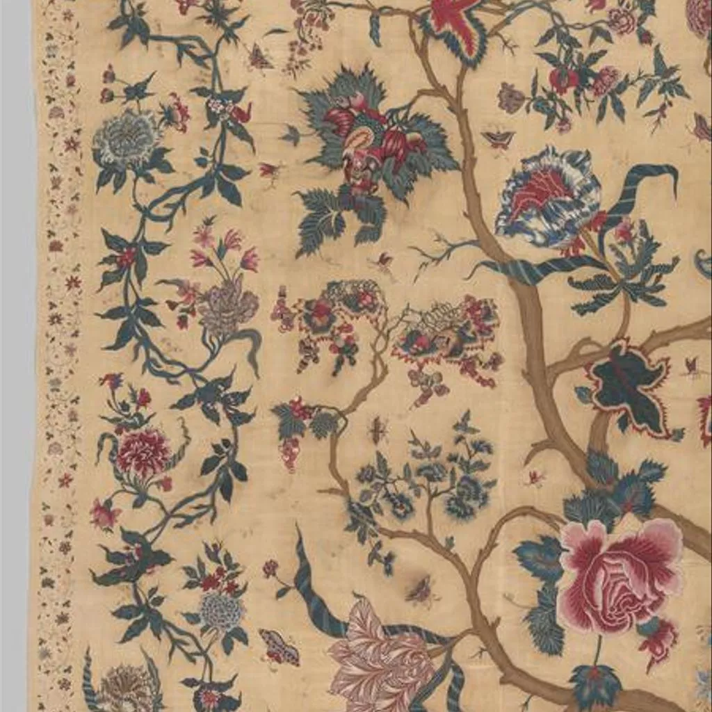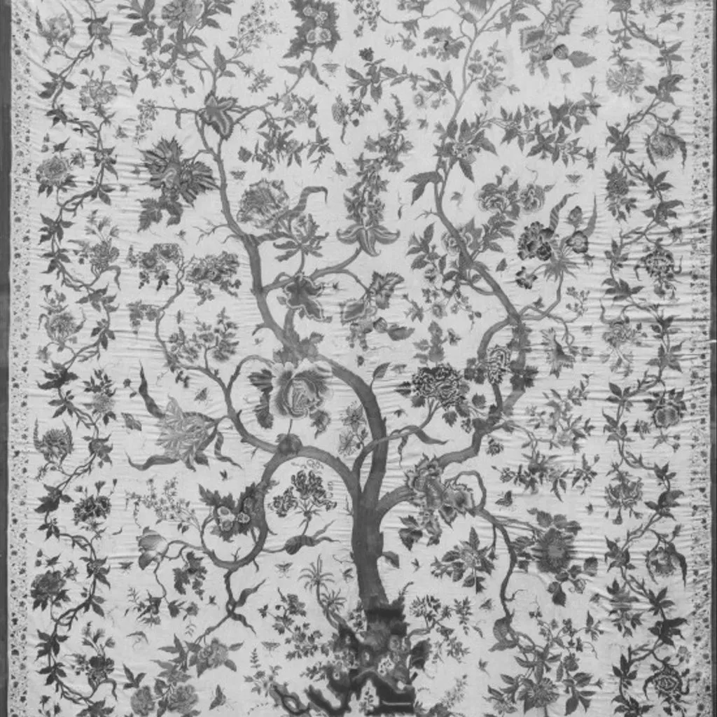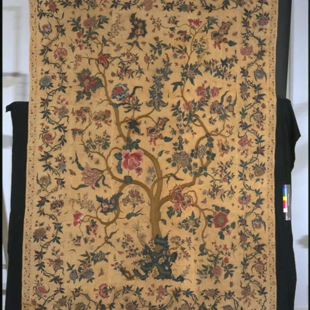 Painted cotton chintz bedcovers and hangings ('palampores') with tree designs were widely used in Britain and Holland in the 18th century, and they were also made in embroidered versions, like this one. Embroidered palampores were particularly popular in Holland.