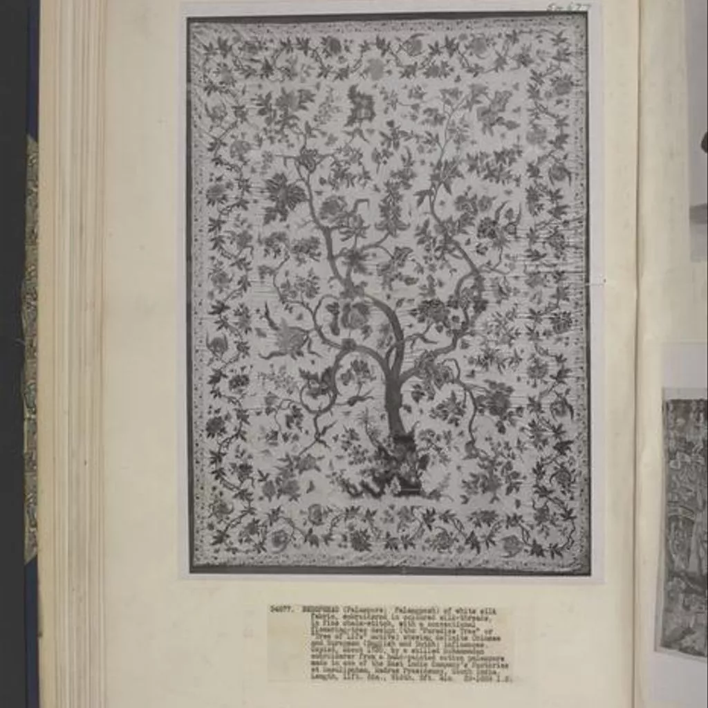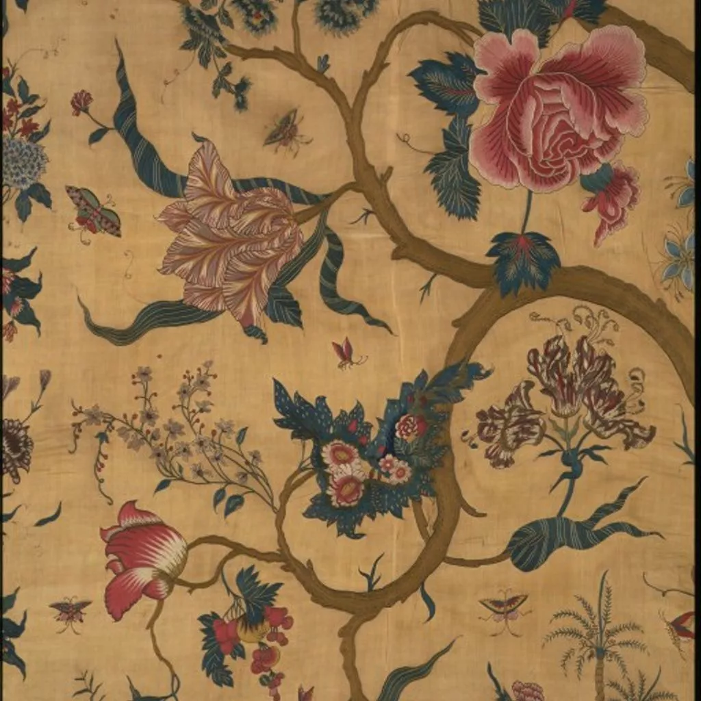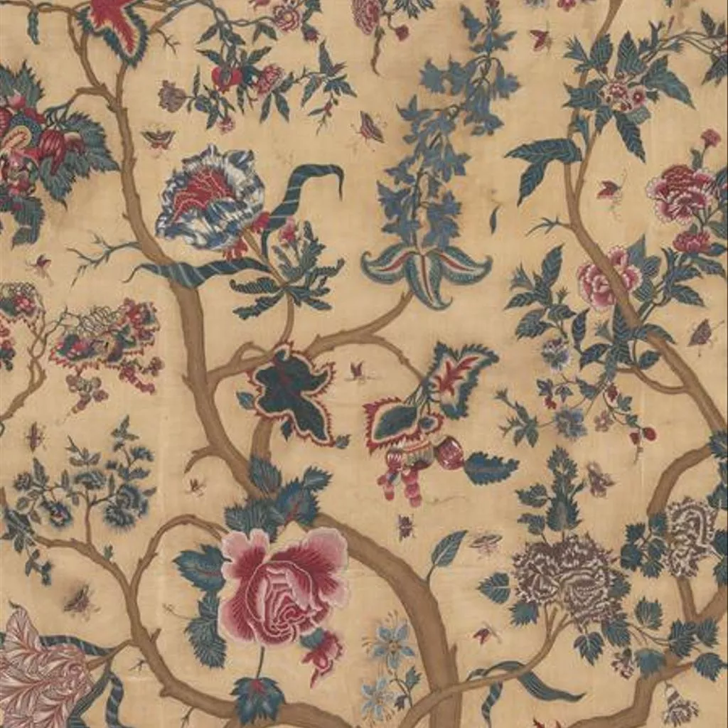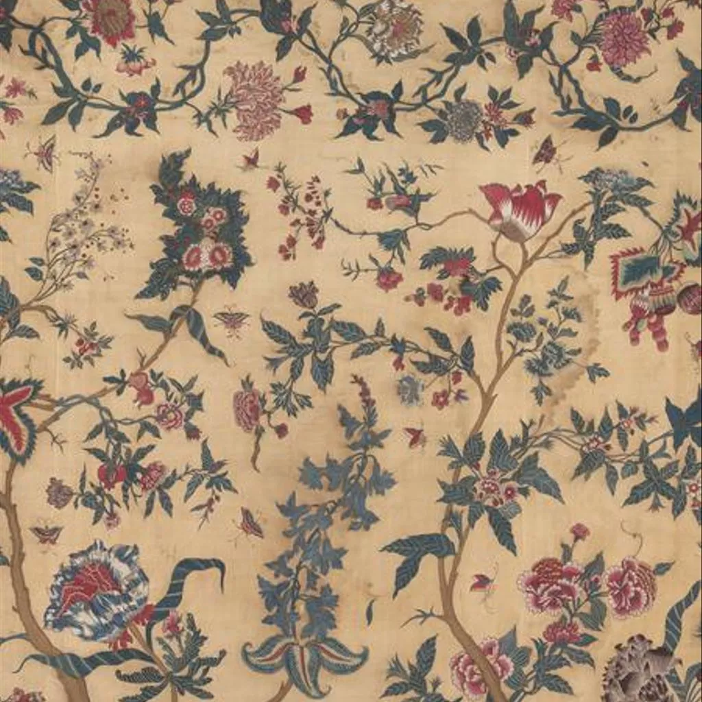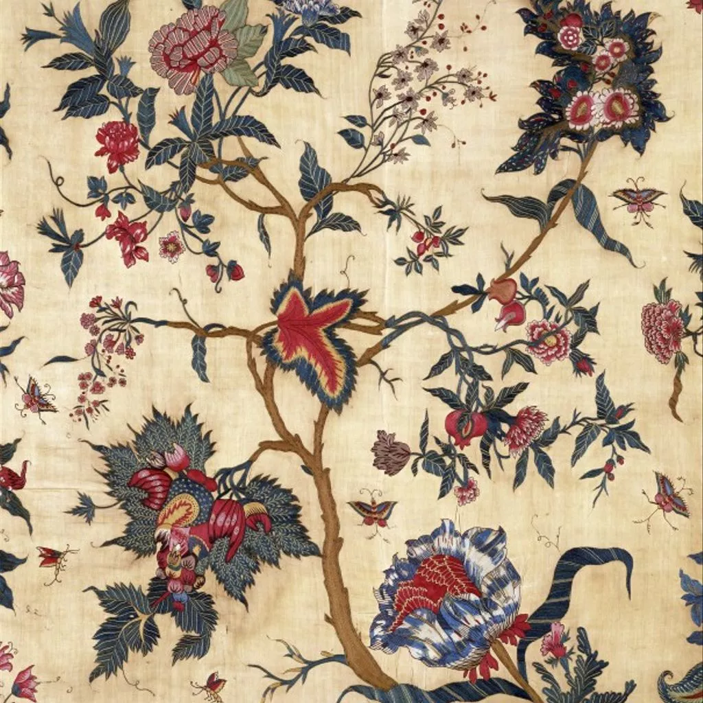 Painted cotton chintz bedcovers and hangings ('palampores') with tree designs were widely used in Britain and Holland in the 18th century, and they were also made in embroidered versions, like this one. Embroidered palampores were particularly popular in Holland.