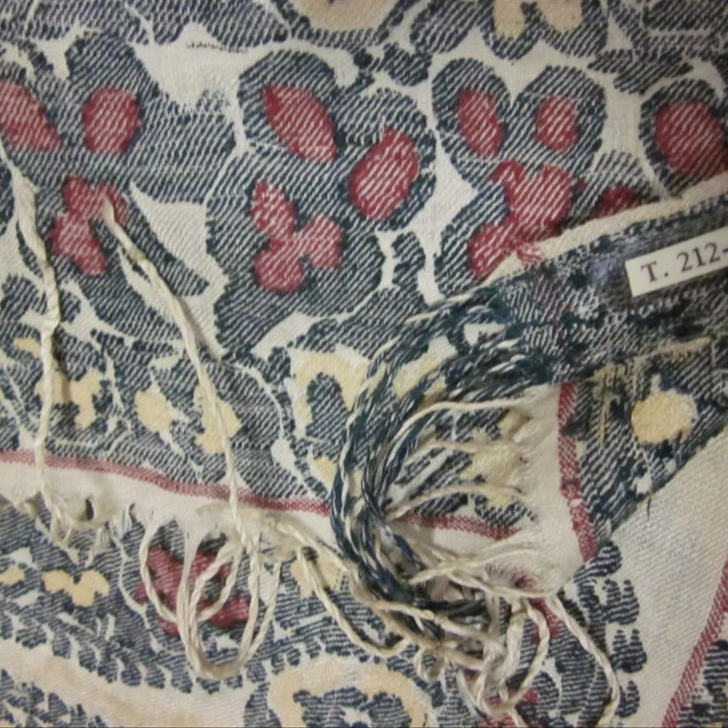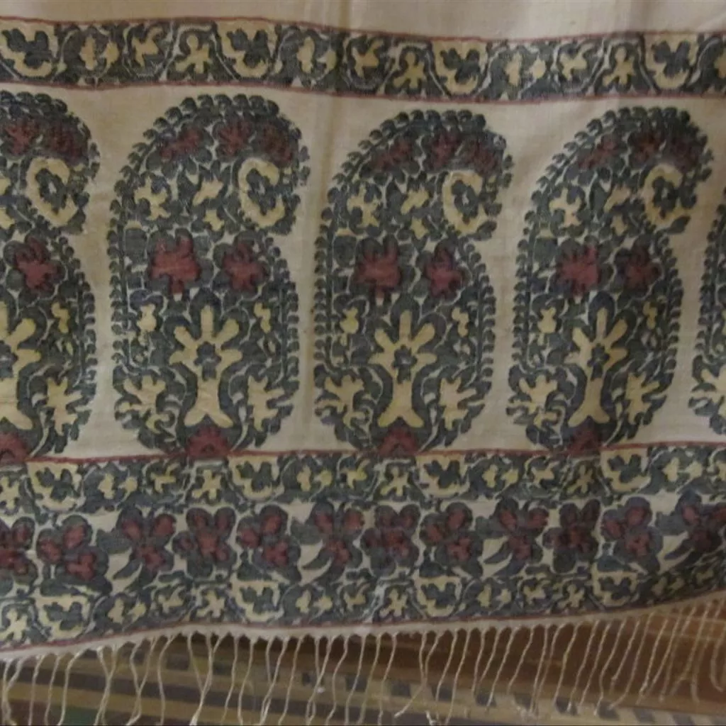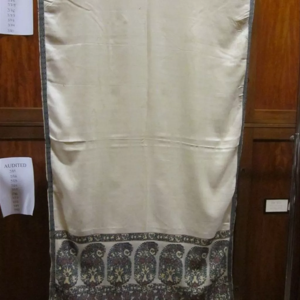 Silk scarf, Paisley, Scotland, ca. 1810-1815 Scarf of white woven silk with a decorative side edging formed by dark green and white silk warp threads. The scarf is long and narrow, and at each end is a row of seven squat and angular cones in the same green, with fillings in cream and magenta silk. A narrow band of decoration above and a wider below the cones are in the same colours. There is a warp fringe, the silk strands twisted, the pairs of twists are then twisted together and knotted at the bottom.