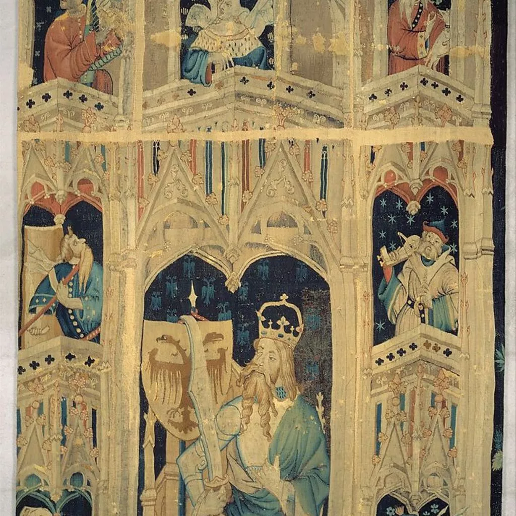 This tapestry is part of four hangings that have been reconstructed from what originally was a set of three tapestries depicting the Nine (or Ten?) Worthies. The heroes depicted included King Arthur, Joshua, David, Hector of Troy, and Julius Caesar, along with various attendants. One of the reconstructed hangings (32.130.2b, 47.101.1, 47.152) shows two of the three Hebrew Worthies in their settings and with nearly all of their attendant figures. Another represents King Arthur (32.130.2a, 47.101.4), one of the three or possibly four figures that appeared in the original tapestry devoted to the Christian Worthies, together with some attendant figures. The third and fourth pieces represent respectively Hector of Troy (47.101.2) and Julius Caesar (47.101.3), with attendant, taken from a third tapestry that depicted the three Pagan Worthies. Other fragments (47.101.5 and 49.123), showing architectural elements, bits of landscape, and the incomplete figures of three cardinals and a bishop, all apparently unconnected to those parts of the three original hangings that survive, are preserved separately in the Metropolitan Museum.