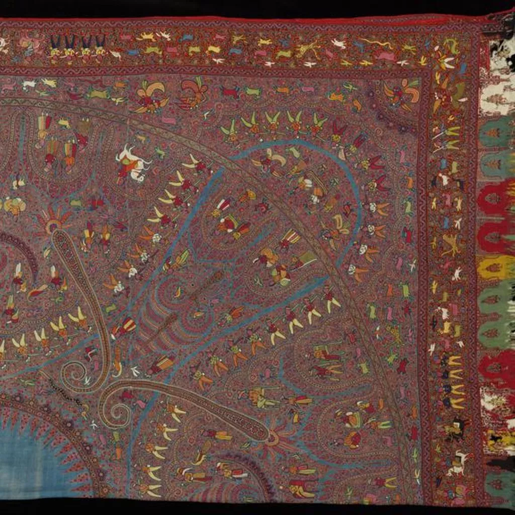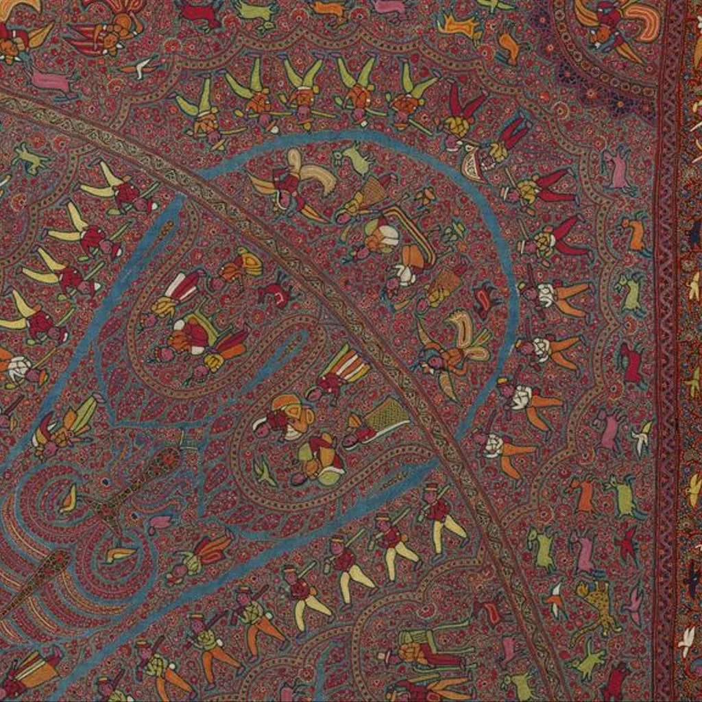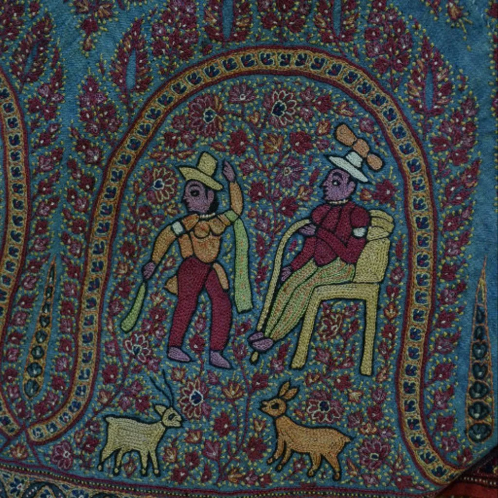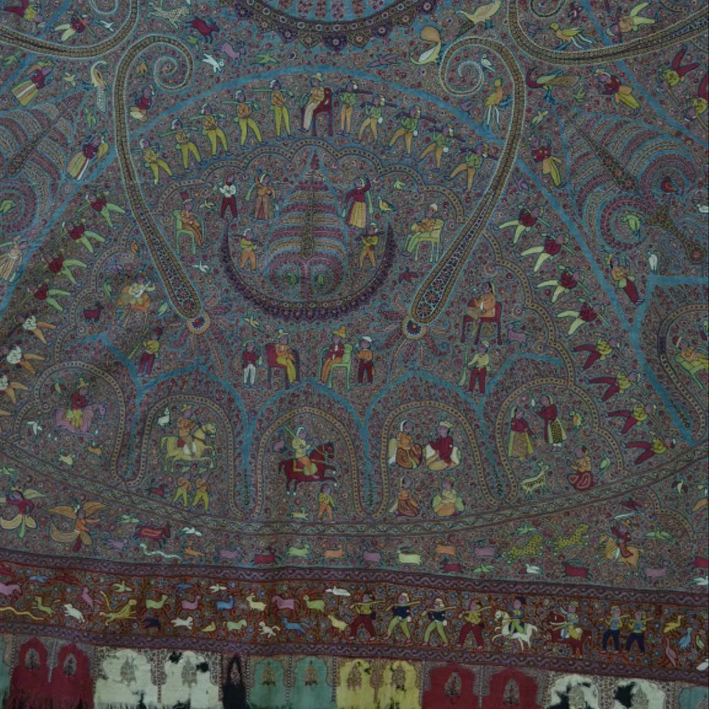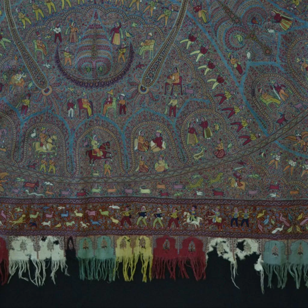 Textile, table cover, woven wool, silk embroidered, Kashmir, ca. 1855 Table cover, woven wool, blue ground decorated with a blue circle at the centre, surrounded by numerous animals and plants, in silk embroidery. Coloured fringes with niches. Intended for use as a table cover.