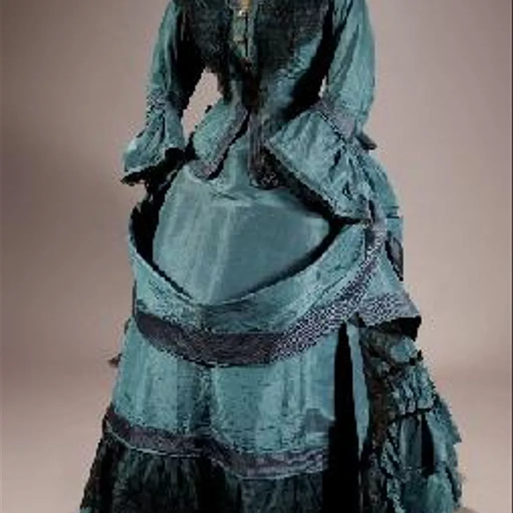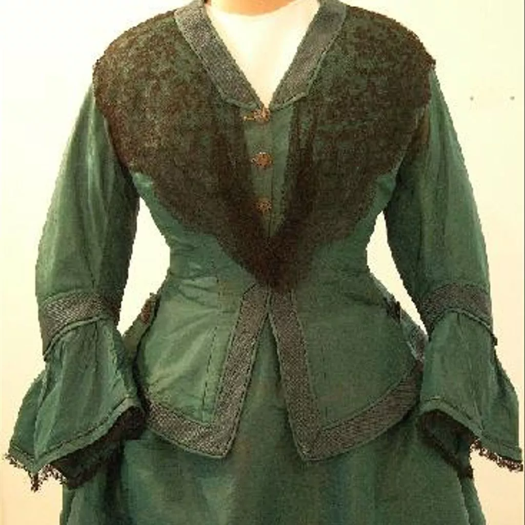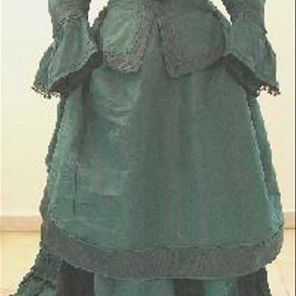 Romanticismo Conjunto de cuerpo y falda en gros de Tours verde . La chaqueta va entallada a la cadera y la manga es larga y curva; por debajo del codo lleva una banda de acanalado y volante de la misma tela con puntilla muy estrecha de encaje negro. El escote es redondo por detrás y en pico por delante, rodeado por un bies de acanalado. La parte delantera va ajustada al talle con pinzas que terminan en el pecho; la abertura central con cierre hasta la cintura con cuatro botones plateados y ojales. La trasera se ajusta con costuras en los costadillos y termina en dos haldetas superpuestas tableadas y ribeteadas con cinta de acanalado. El forro interior es en algodón marrón y las costuras van armadas con ballenas. La falda lleva, en la parte delantera, el vuelo distribuido en tablas cogidas en la cintura. Va adornada con guardillas de encaje negro de Chantilly mecánico a los lados y volante en el bajo con una banda de acanalado y guarnecido con el mismo encaje. En la parte trasera el vuelo se distribuye con tablas y fruncido, terminando en una pequeña cola adornada con banda bullonada del mismo tejido y dos volantes de capa. Se completa con delantal con banda de acanalado, y polisón cogido al talle con cintas de algodón. El interior lleva un ruedo azul y otro marrón en tafetán de lino.