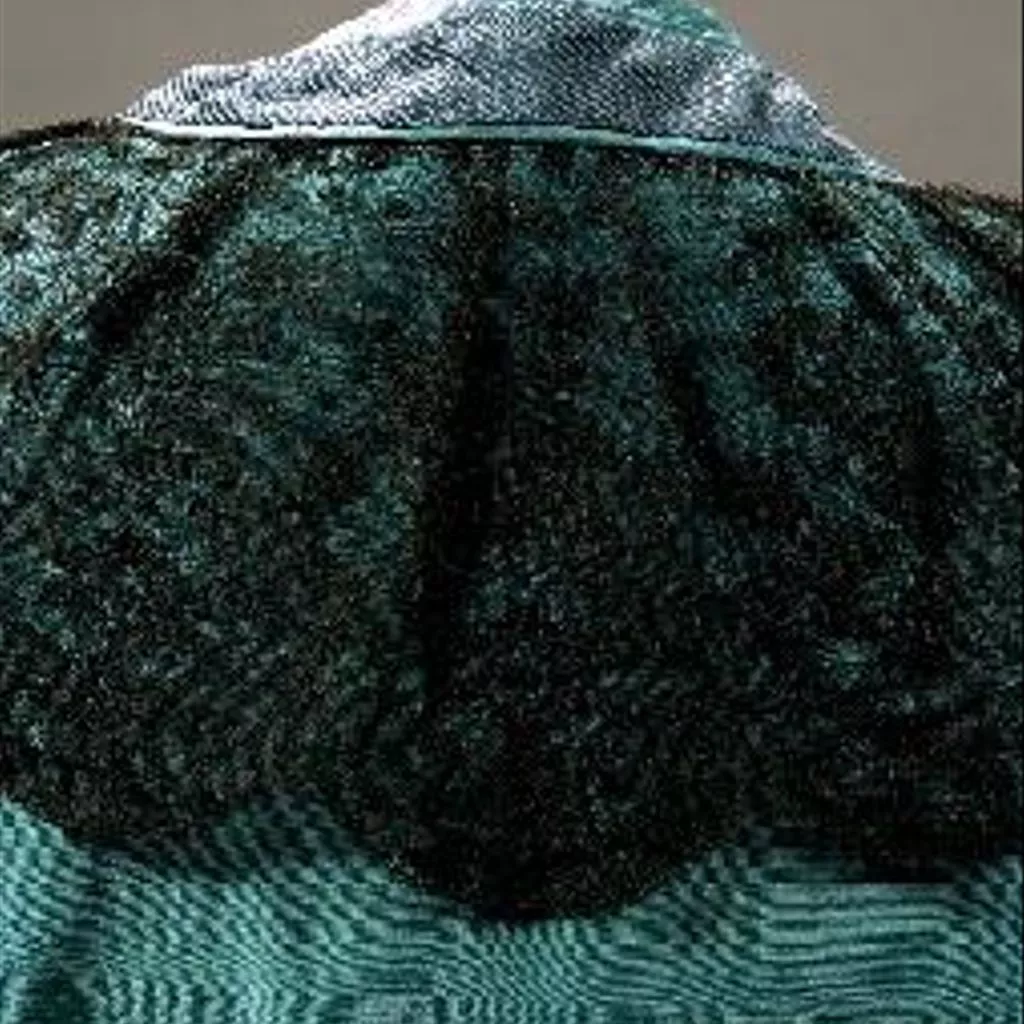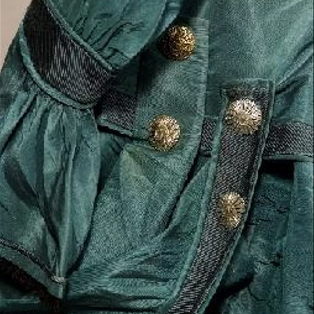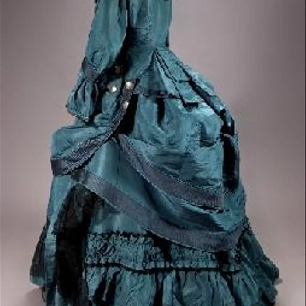 Romanticismo Conjunto de cuerpo y falda en gros de Tours verde . La chaqueta va entallada a la cadera y la manga es larga y curva; por debajo del codo lleva una banda de acanalado y volante de la misma tela con puntilla muy estrecha de encaje negro. El escote es redondo por detrás y en pico por delante, rodeado por un bies de acanalado. La parte delantera va ajustada al talle con pinzas que terminan en el pecho; la abertura central con cierre hasta la cintura con cuatro botones plateados y ojales. La trasera se ajusta con costuras en los costadillos y termina en dos haldetas superpuestas tableadas y ribeteadas con cinta de acanalado. El forro interior es en algodón marrón y las costuras van armadas con ballenas. La falda lleva, en la parte delantera, el vuelo distribuido en tablas cogidas en la cintura. Va adornada con guardillas de encaje negro de Chantilly mecánico a los lados y volante en el bajo con una banda de acanalado y guarnecido con el mismo encaje. En la parte trasera el vuelo se distribuye con tablas y fruncido, terminando en una pequeña cola adornada con banda bullonada del mismo tejido y dos volantes de capa. Se completa con delantal con banda de acanalado, y polisón cogido al talle con cintas de algodón. El interior lleva un ruedo azul y otro marrón en tafetán de lino.