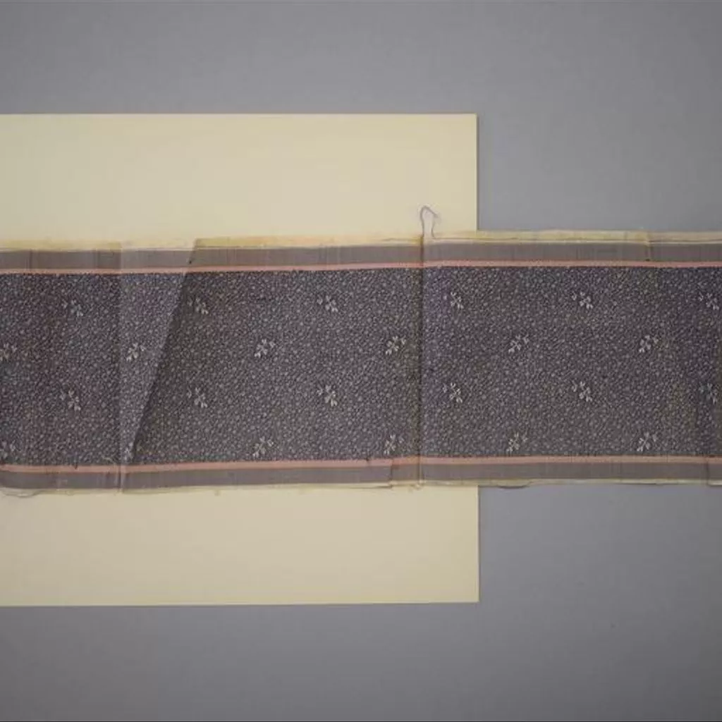 Textile sample of Jacquard-woven silk, Derby, 1830 Textile sample of Jacquard-woven silk. The centre panel has a design of cream-coloured sprigs and dots on a mauve ground in a twill weave. The side panels are striped in a plain weave with the outer stripe in grayish-mauve and the inner stripe in pink.