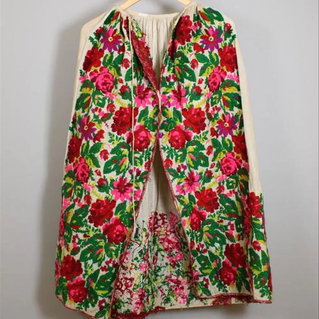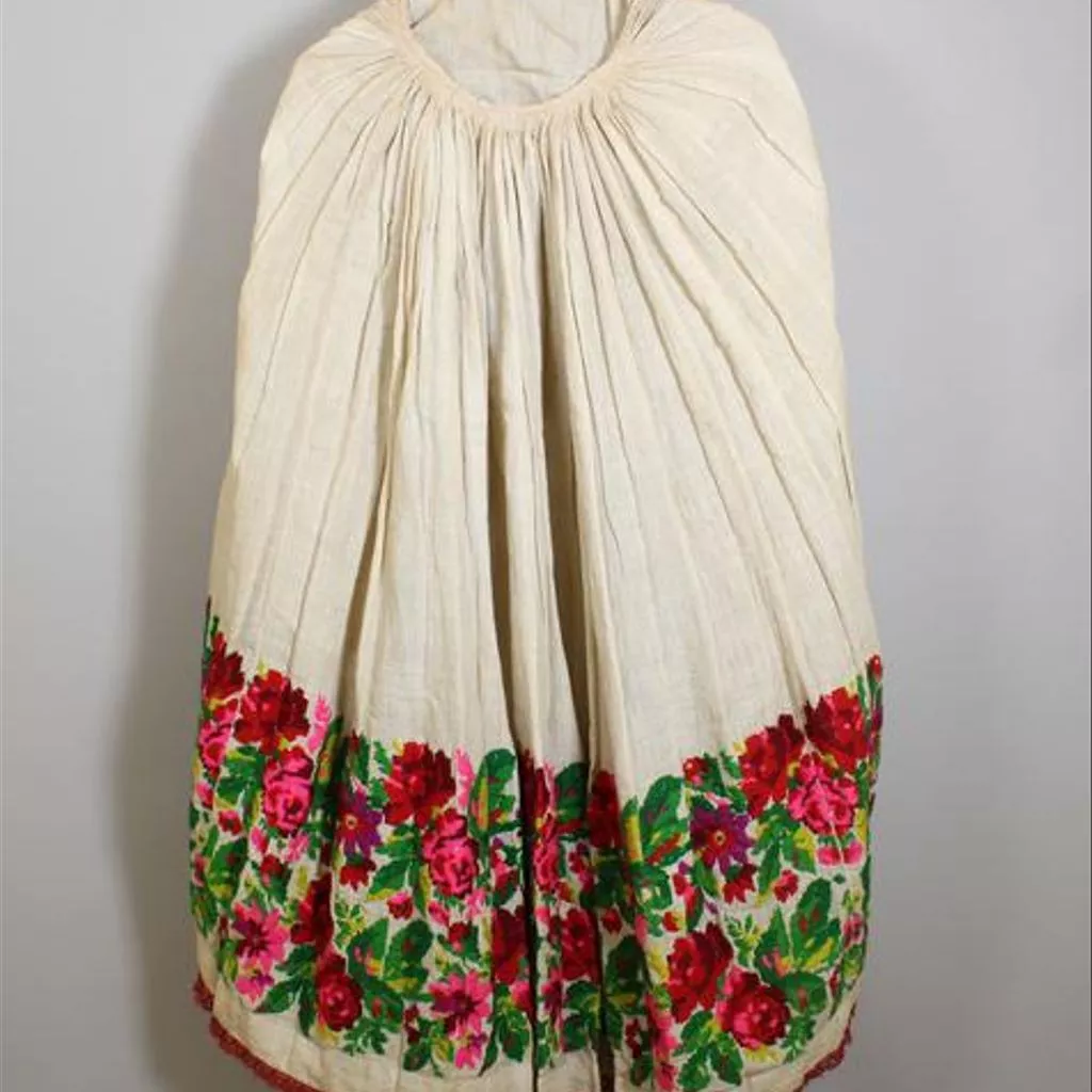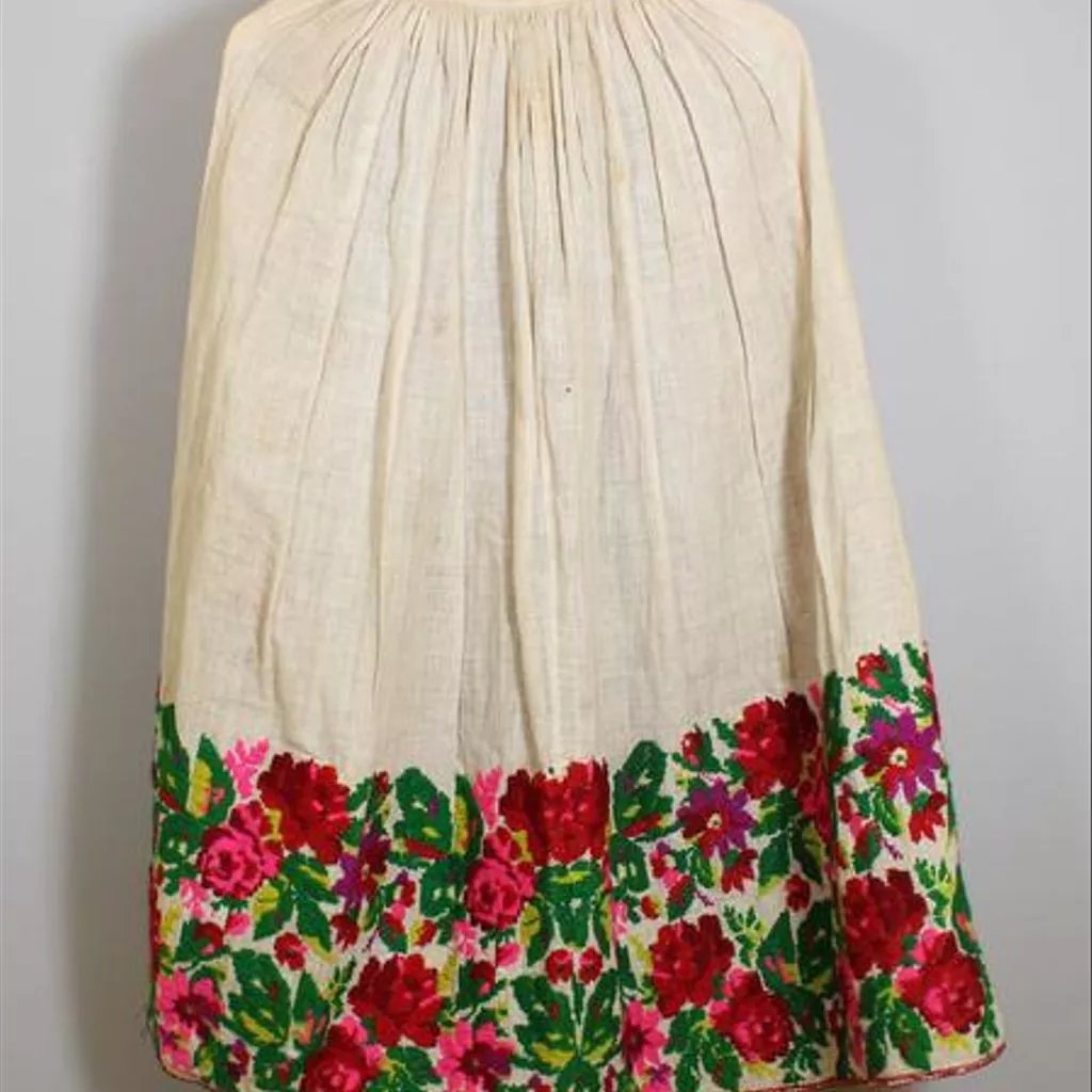 Blouse, skirt and apron of brocaded wool, Croatia, 19th century Blouse, skirt and apron of brocaded wool. The blouse is waist length, pleated and gathered to a high round neck which is faced with red and white printed cotton. Fastens with buttons and press studs at the centre front. The sleeves are full and gathered at the shoulder and wrist where there is a small frilled cuff. Loom-work embroidery in wools with a floral design in shades of red, purple and green cover the sleeves and forms a band down the centre front. The skirt is ankle length and ties with tapes on either side of the waist. Tightly gathered at the back. At the bottom is a band of floral loom-work embroidery in wools, similar to that on the blouse. Finished at the hem with a band of red wool braid. Hand and machine-stitched. The apron is bordered on three sides with matching embroidery to that on the skirt. Trimmed around the edge with red machine-made silk braid. Gathered onto a cord at the waist.