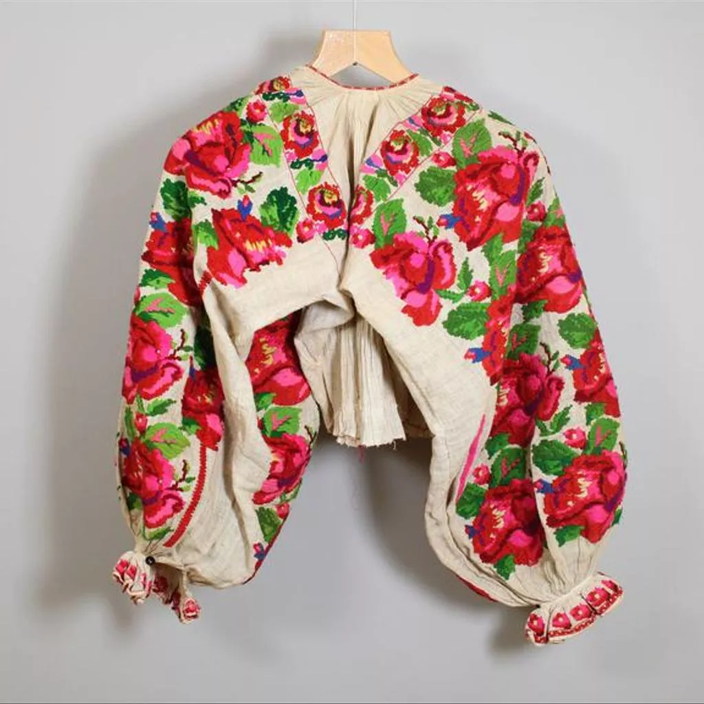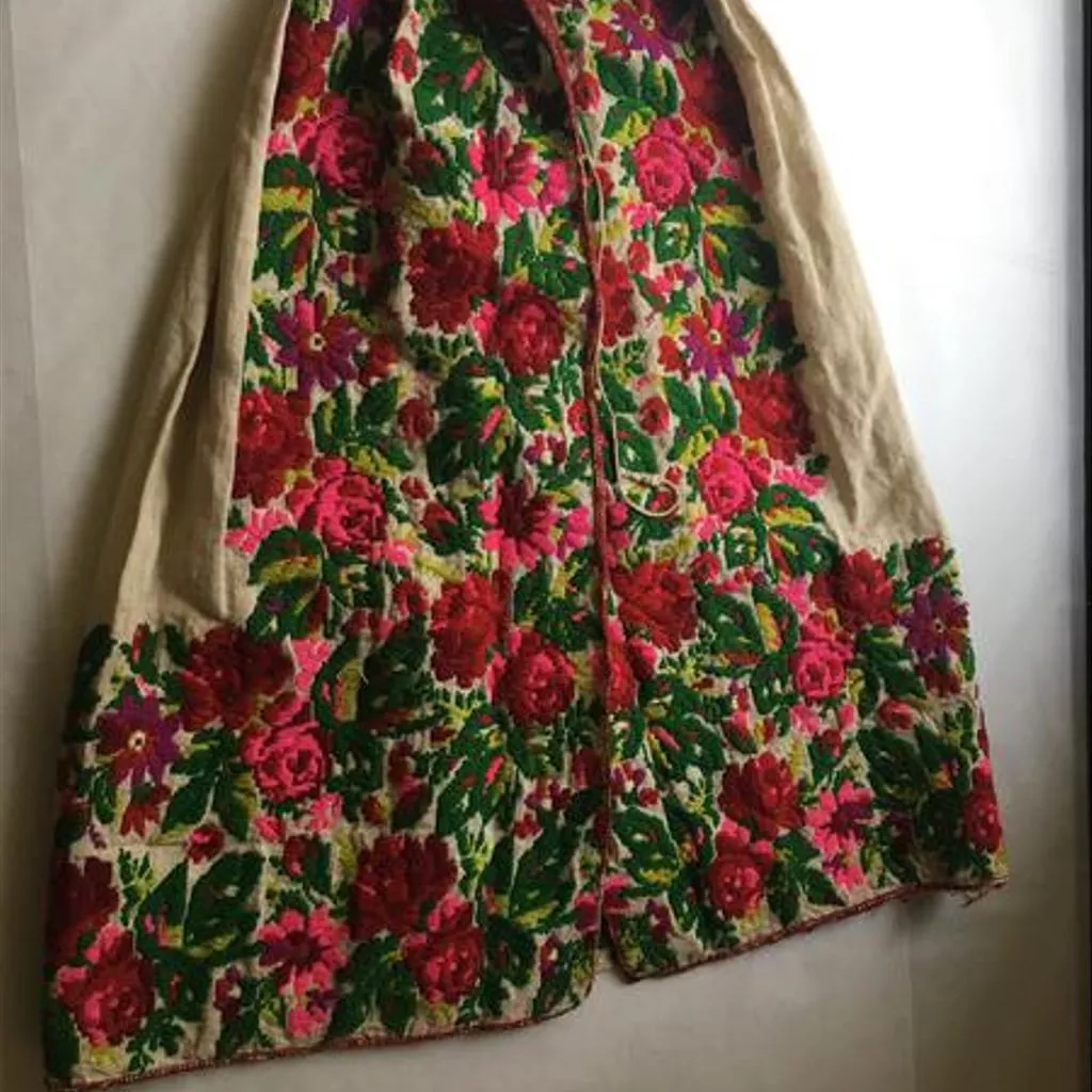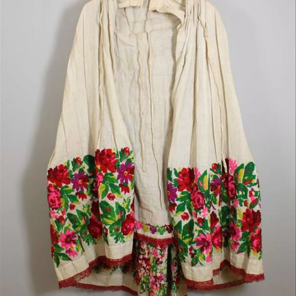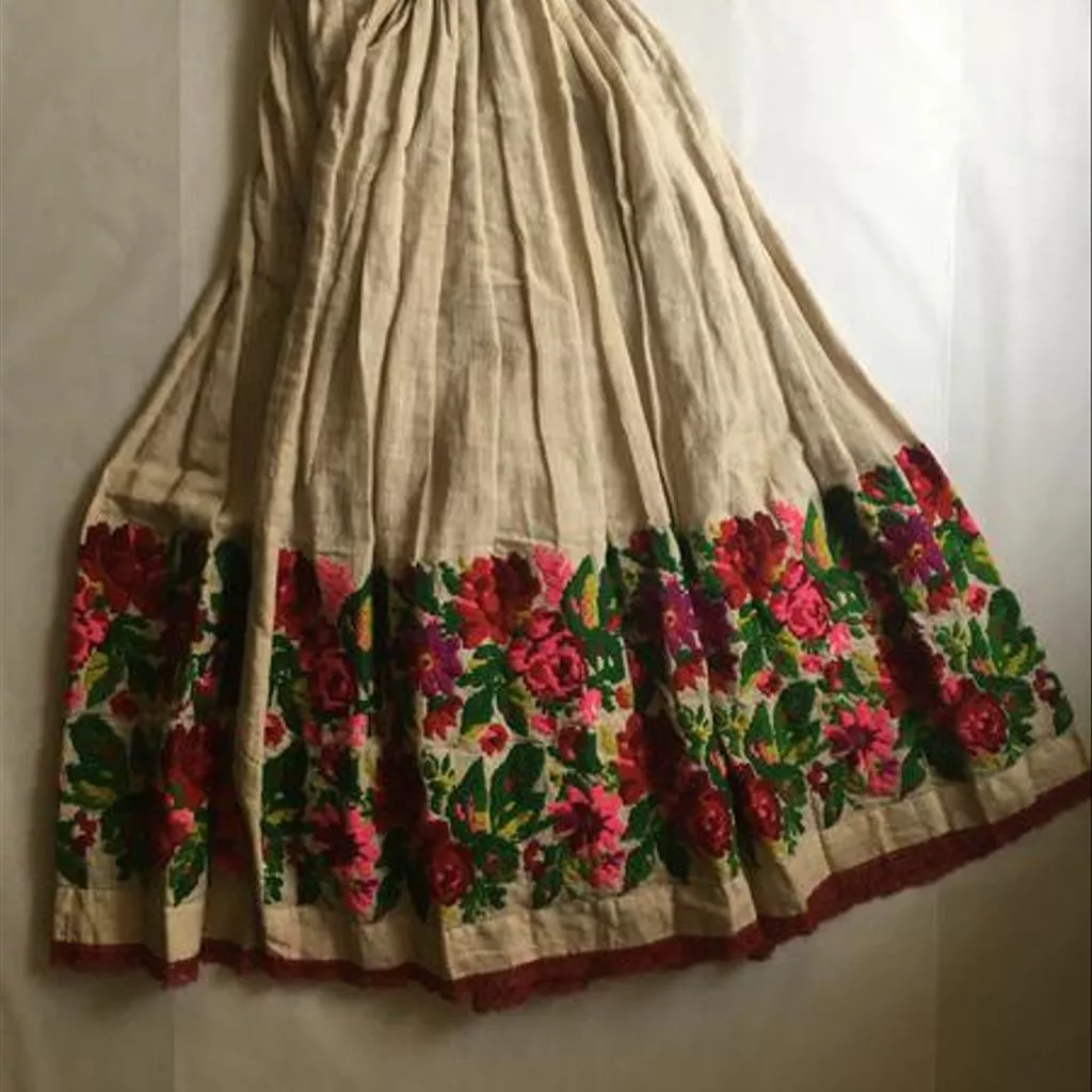 Blouse, skirt and apron of brocaded wool, Croatia, 19th century Blouse, skirt and apron of brocaded wool. The blouse is waist length, pleated and gathered to a high round neck which is faced with red and white printed cotton. Fastens with buttons and press studs at the centre front. The sleeves are full and gathered at the shoulder and wrist where there is a small frilled cuff. Loom-work embroidery in wools with a floral design in shades of red, purple and green cover the sleeves and forms a band down the centre front. The skirt is ankle length and ties with tapes on either side of the waist. Tightly gathered at the back. At the bottom is a band of floral loom-work embroidery in wools, similar to that on the blouse. Finished at the hem with a band of red wool braid. Hand and machine-stitched. The apron is bordered on three sides with matching embroidery to that on the skirt. Trimmed around the edge with red machine-made silk braid. Gathered onto a cord at the waist.