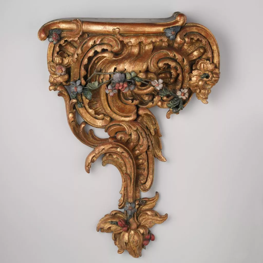 Four of these brackets, each fitted with a vase-shaped top, originally hung in the trelliswork garden room of the Franckenstein Pavillion at Schloss Seehof, near Bamberg.