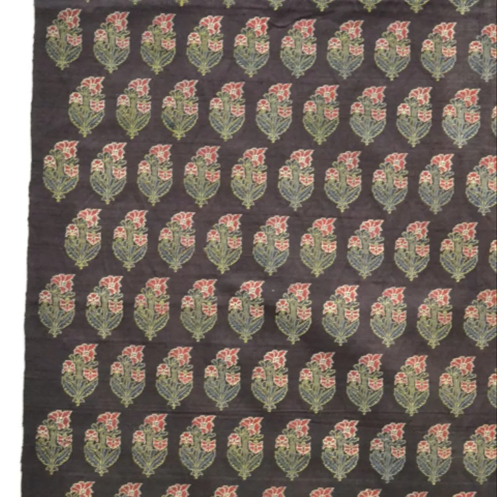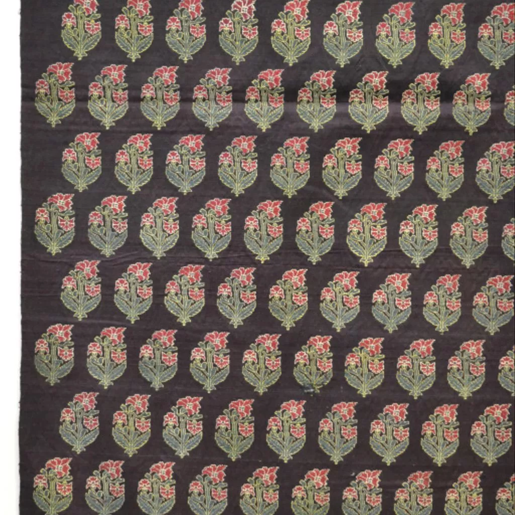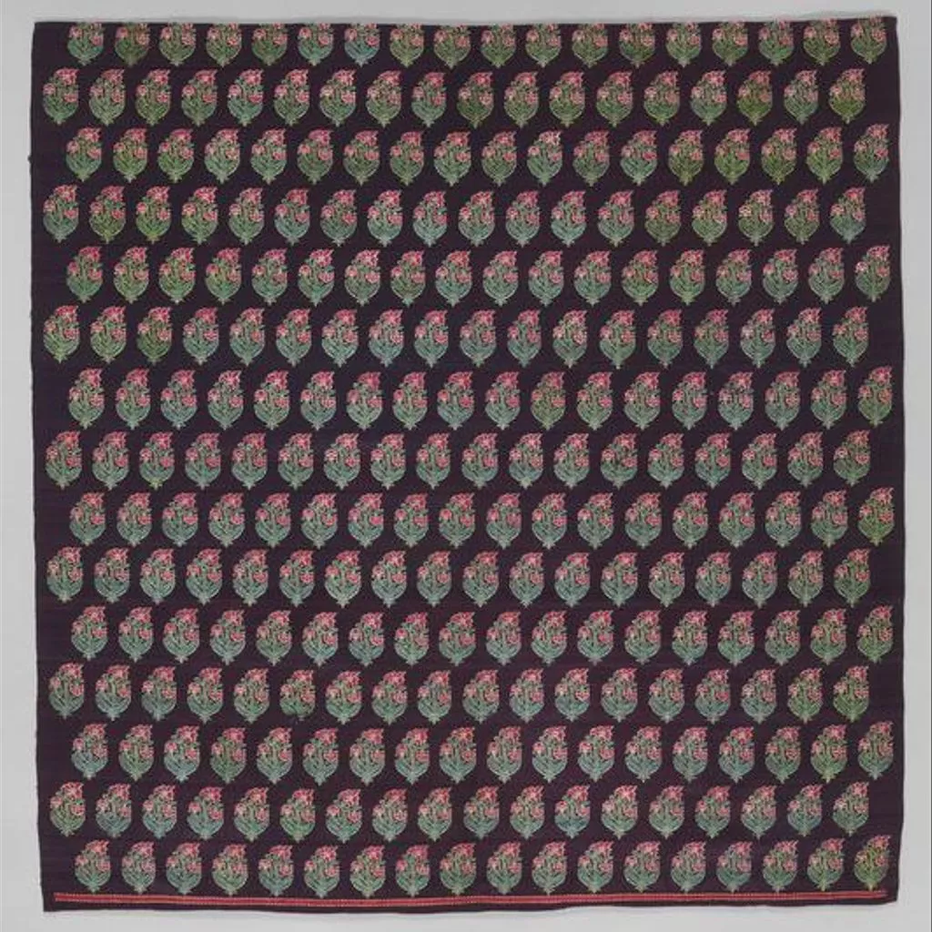 Textile in two fragments, woven cotton and silk (mashru), dark purple ground with small flowers in green and red, Aurangabad, c. 1851; Textiles