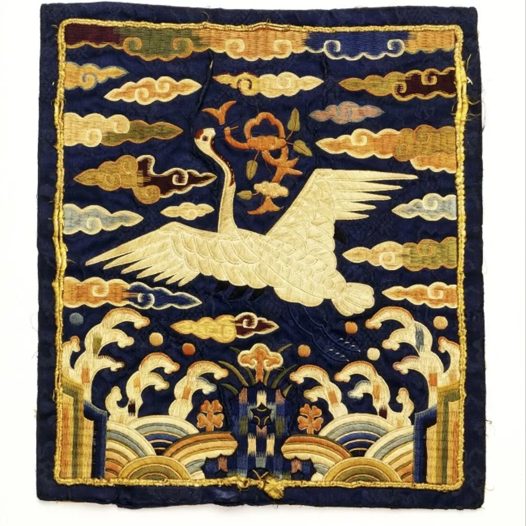 Silk damask rank badge, one of a set of two. Embroidered with coloured silks with some couched gold thread showing a a single crane holding the plant of eternal youth amongst stylized clouds, rocks and surging waves.