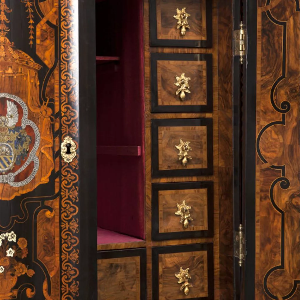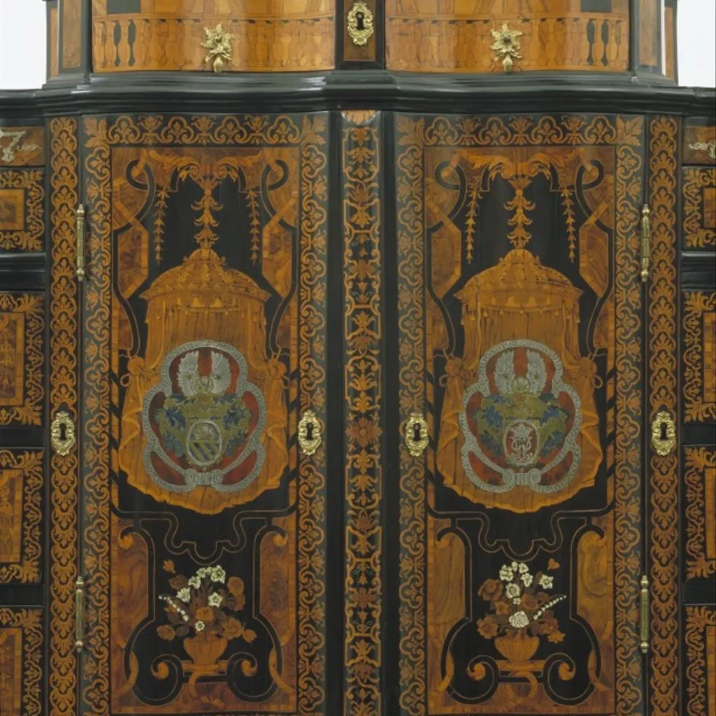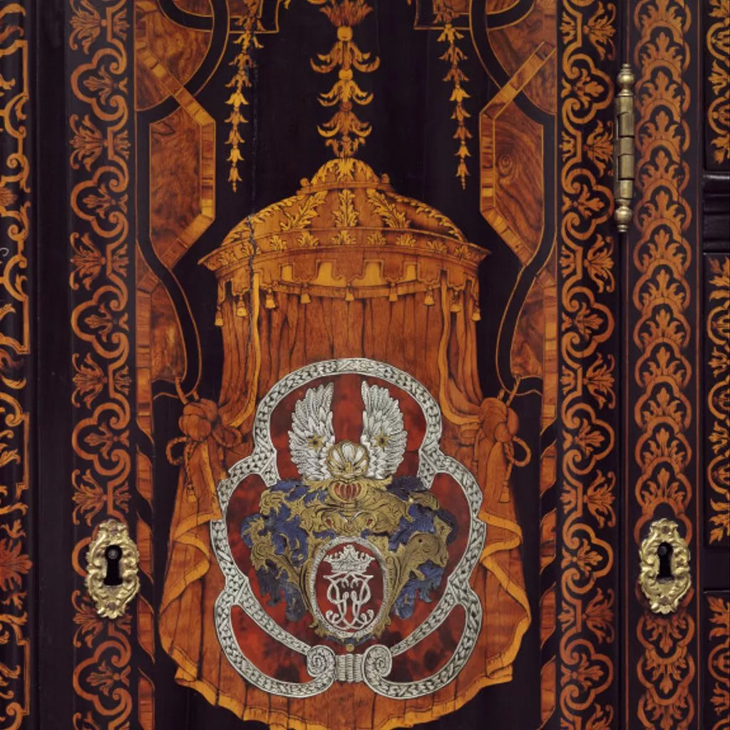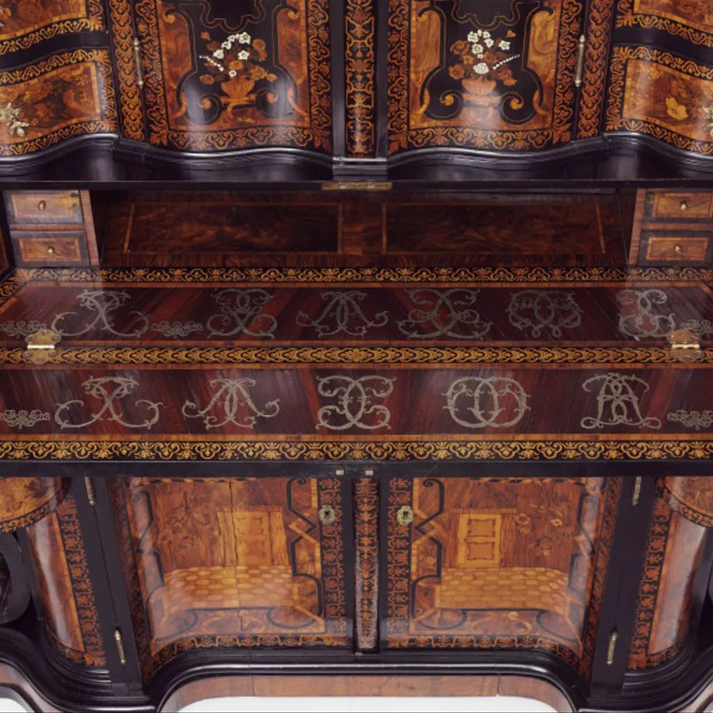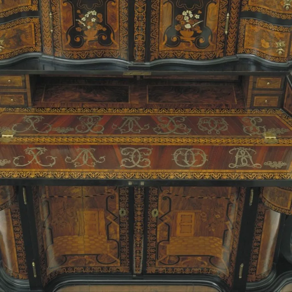 Writing-cabinets were fashionable furnishings for a library or study. They implied that their owner was both wealthy and educated, a person who needed a special place to house his papers and personal treasures. In Würzburg in Germany, a cabinet of this kind was called a Trisur, a term relating to 'treasure'. In the southern German states they were often decorated with boulle marquetry, which uses both woods and metals in its veneers, and takes its name from André-Charles Boulle, the best-known cabinet maker to Louis XIV in Paris. On this cabinet, a simplified version of the boulle technique is used to create the owner's arms on the main doors, standing out against the more traditional wooden marquetry which shows flowers and scenes of interiors. The rather piecemeal design of the marquetry may have been the result of young craftsmen wishing to demonstrate that they could undertake a variety of work, from floral marquetry and scenes of interiors, to marquetry of birds, and the use of metals and other materials such as horn.