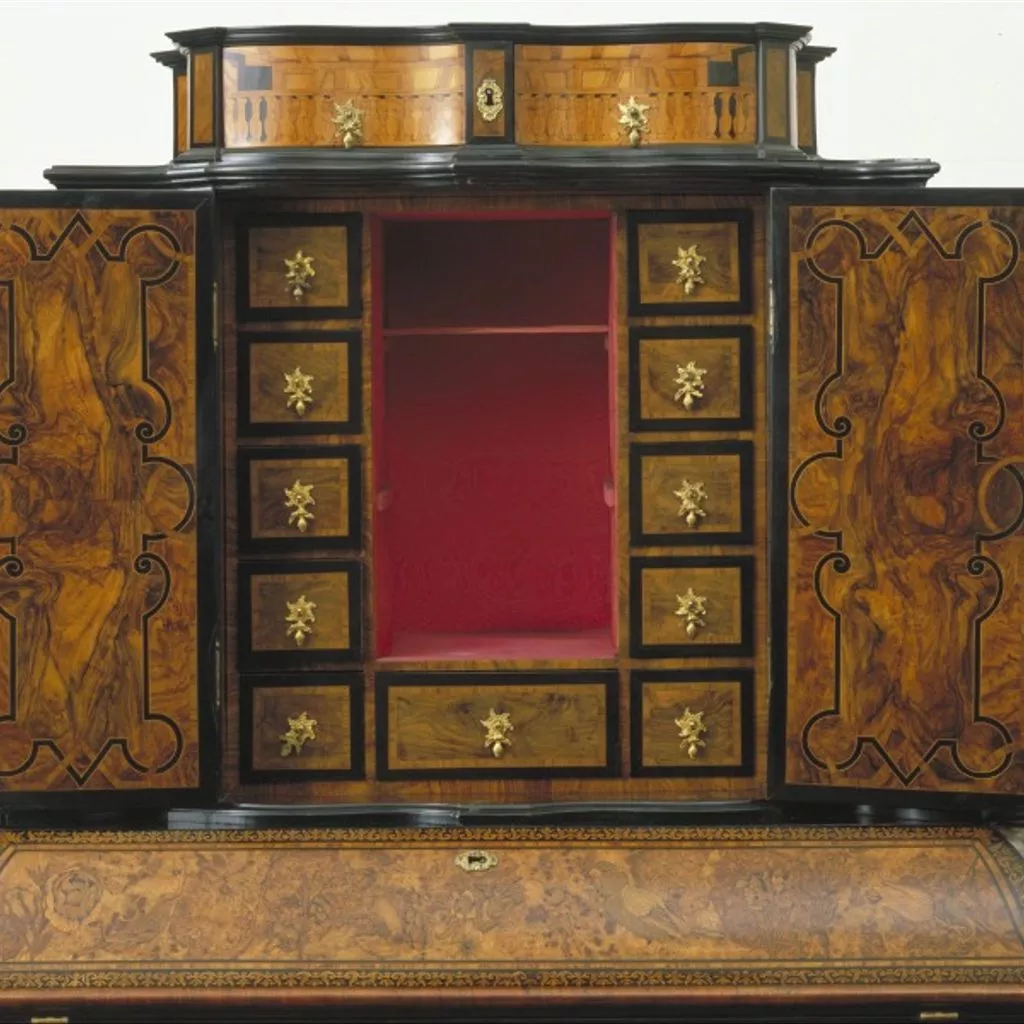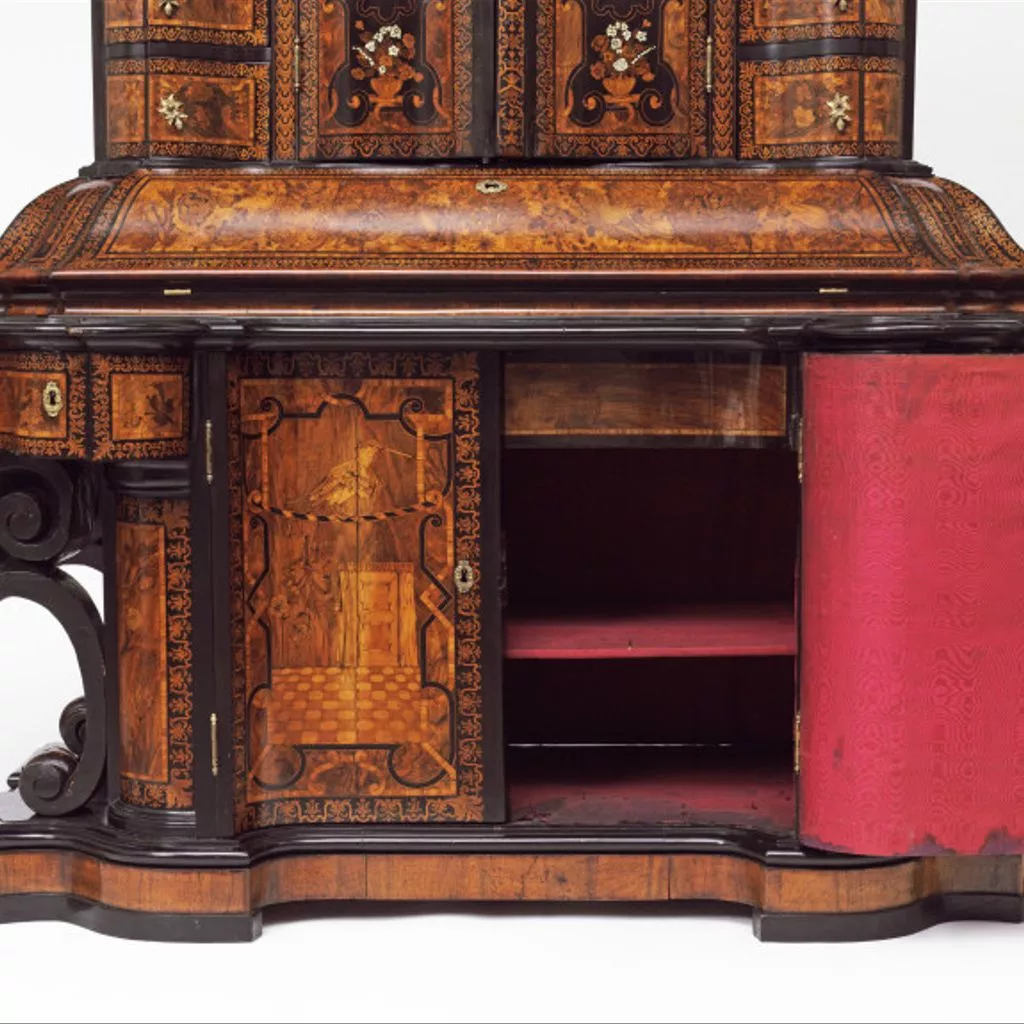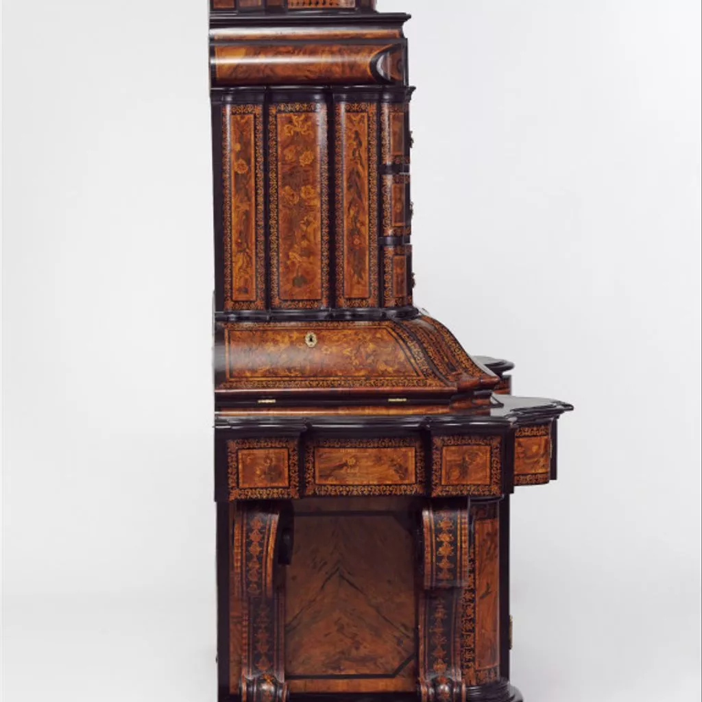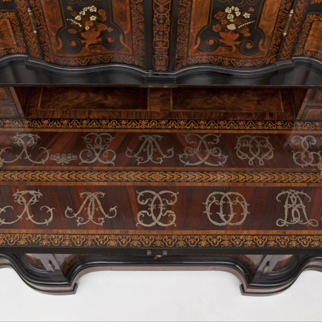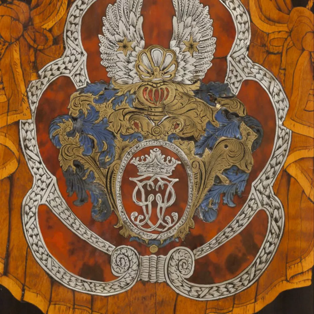 Writing-cabinets were fashionable furnishings for a library or study. They implied that their owner was both wealthy and educated, a person who needed a special place to house his papers and personal treasures. In Würzburg in Germany, a cabinet of this kind was called a Trisur, a term relating to 'treasure'. In the southern German states they were often decorated with boulle marquetry, which uses both woods and metals in its veneers, and takes its name from André-Charles Boulle, the best-known cabinet maker to Louis XIV in Paris. On this cabinet, a simplified version of the boulle technique is used to create the owner's arms on the main doors, standing out against the more traditional wooden marquetry which shows flowers and scenes of interiors. The rather piecemeal design of the marquetry may have been the result of young craftsmen wishing to demonstrate that they could undertake a variety of work, from floral marquetry and scenes of interiors, to marquetry of birds, and the use of metals and other materials such as horn.