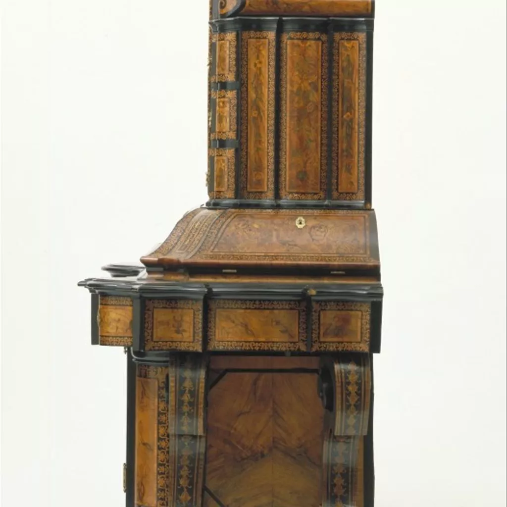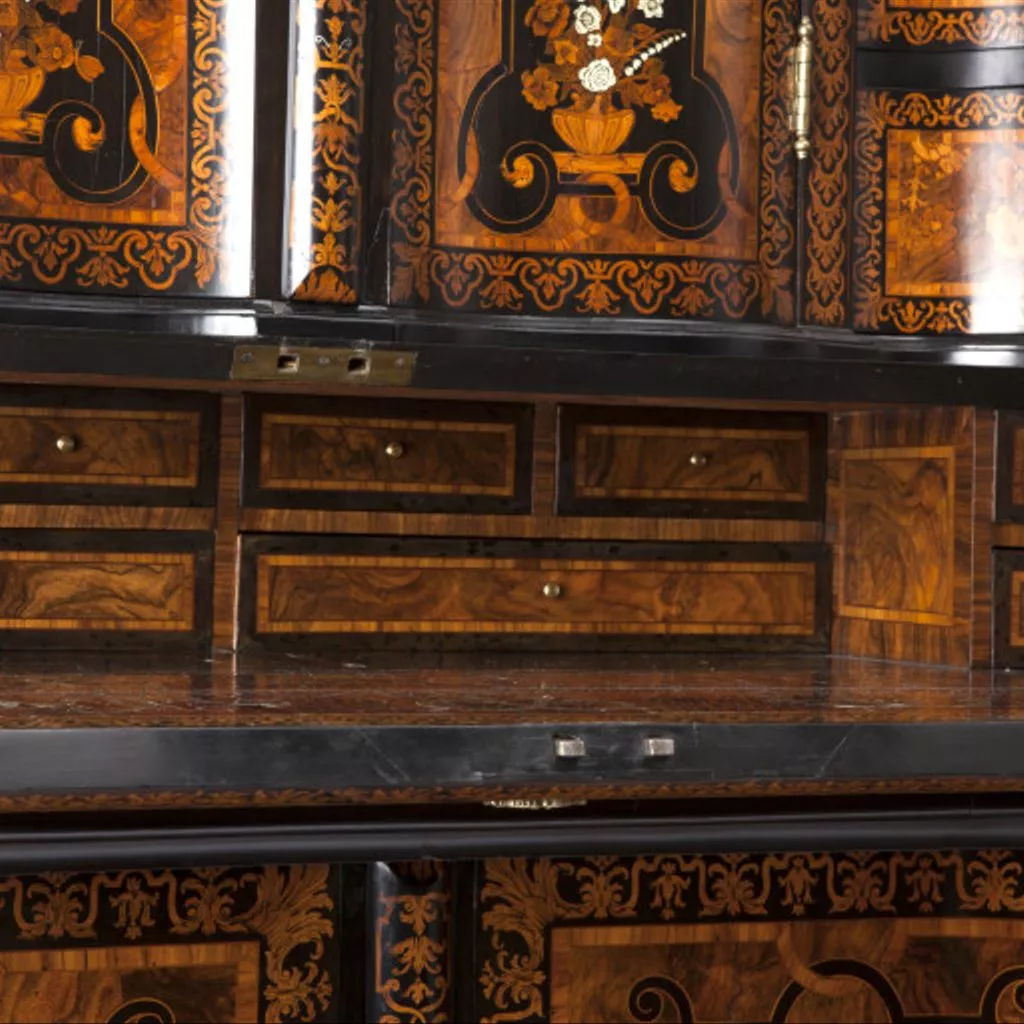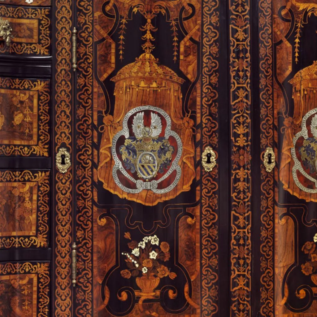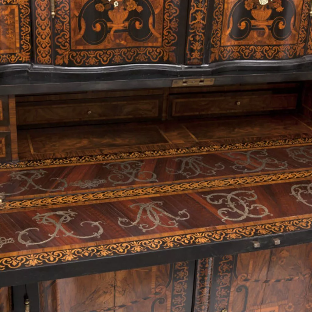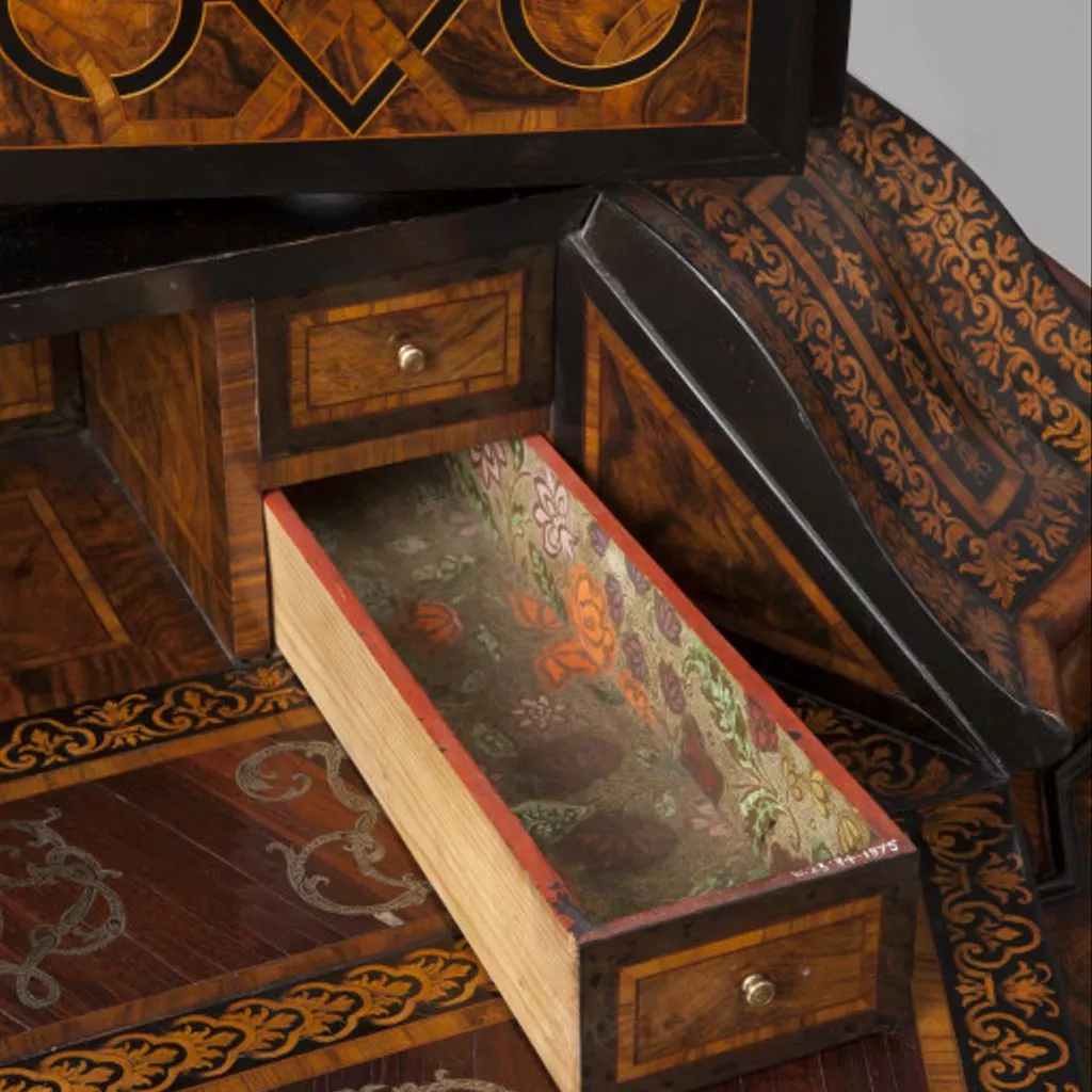 Writing-cabinets were fashionable furnishings for a library or study. They implied that their owner was both wealthy and educated, a person who needed a special place to house his papers and personal treasures. In Würzburg in Germany, a cabinet of this kind was called a Trisur, a term relating to 'treasure'. In the southern German states they were often decorated with boulle marquetry, which uses both woods and metals in its veneers, and takes its name from André-Charles Boulle, the best-known cabinet maker to Louis XIV in Paris. On this cabinet, a simplified version of the boulle technique is used to create the owner's arms on the main doors, standing out against the more traditional wooden marquetry which shows flowers and scenes of interiors. The rather piecemeal design of the marquetry may have been the result of young craftsmen wishing to demonstrate that they could undertake a variety of work, from floral marquetry and scenes of interiors, to marquetry of birds, and the use of metals and other materials such as horn.