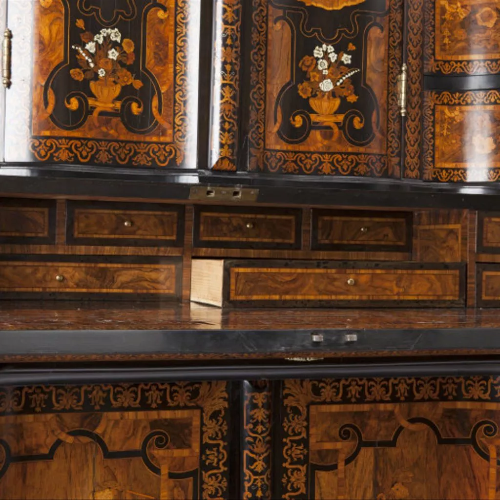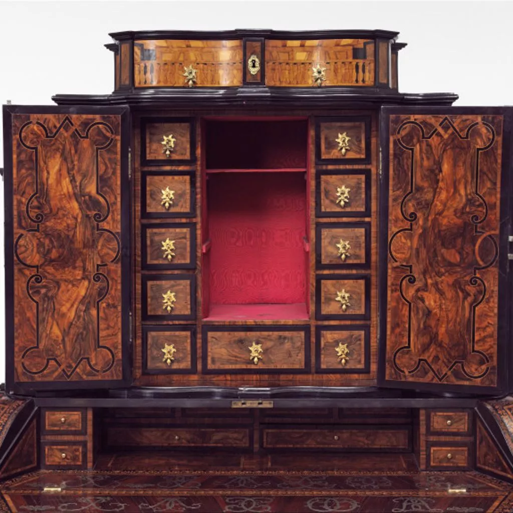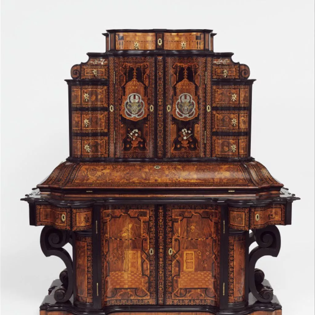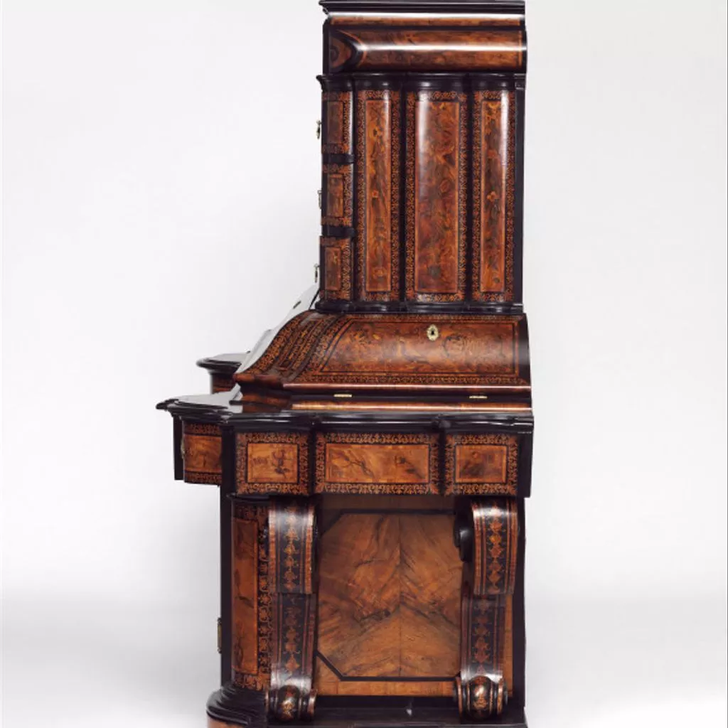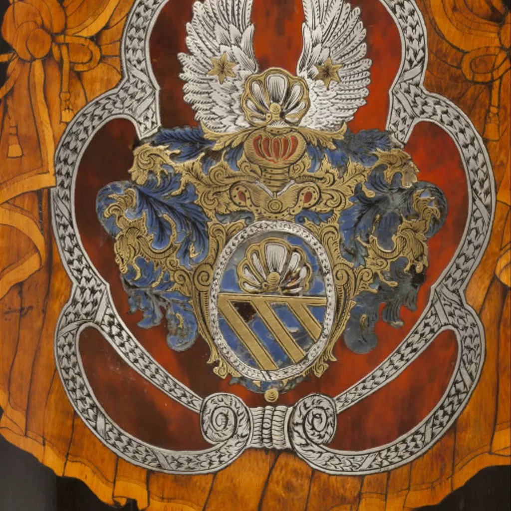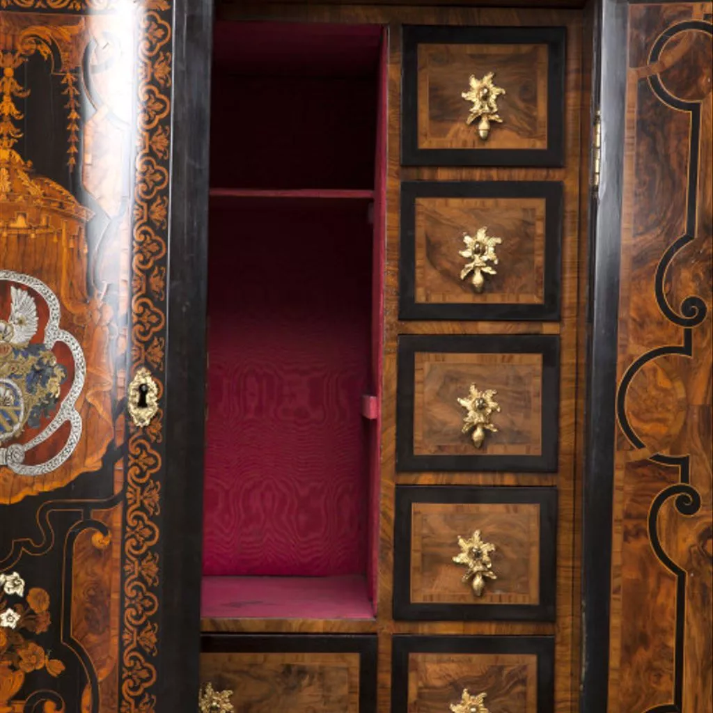Writing-cabinets were fashionable furnishings for a library or study. They implied that their owner was both wealthy and educated, a person who needed a special place to house his papers and personal treasures. In Würzburg in Germany, a cabinet of this kind was called a Trisur, a term relating to 'treasure'. In the southern German states they were often decorated with boulle marquetry, which uses both woods and metals in its veneers, and takes its name from André-Charles Boulle, the best-known cabinet maker to Louis XIV in Paris. On this cabinet, a simplified version of the boulle technique is used to create the owner's arms on the main doors, standing out against the more traditional wooden marquetry which shows flowers and scenes of interiors. The rather piecemeal design of the marquetry may have been the result of young craftsmen wishing to demonstrate that they could undertake a variety of work, from floral marquetry and scenes of interiors, to marquetry of birds, and the use of metals and other materials such as horn.