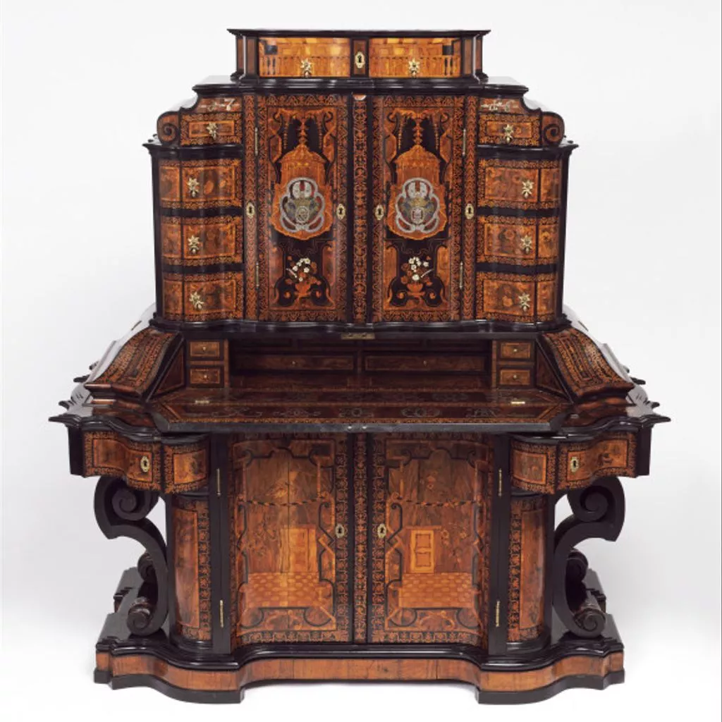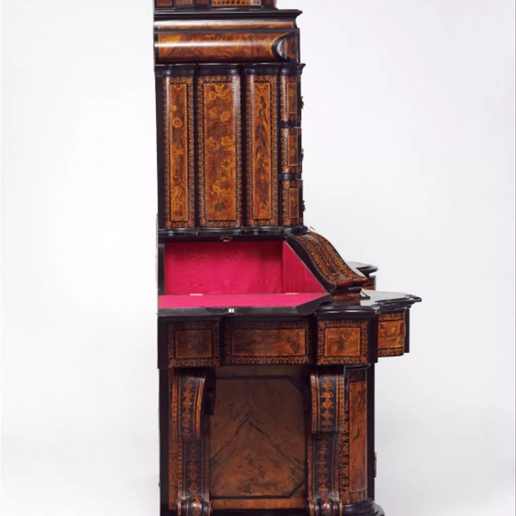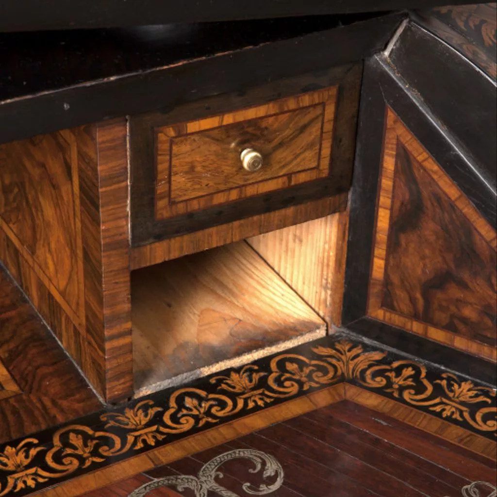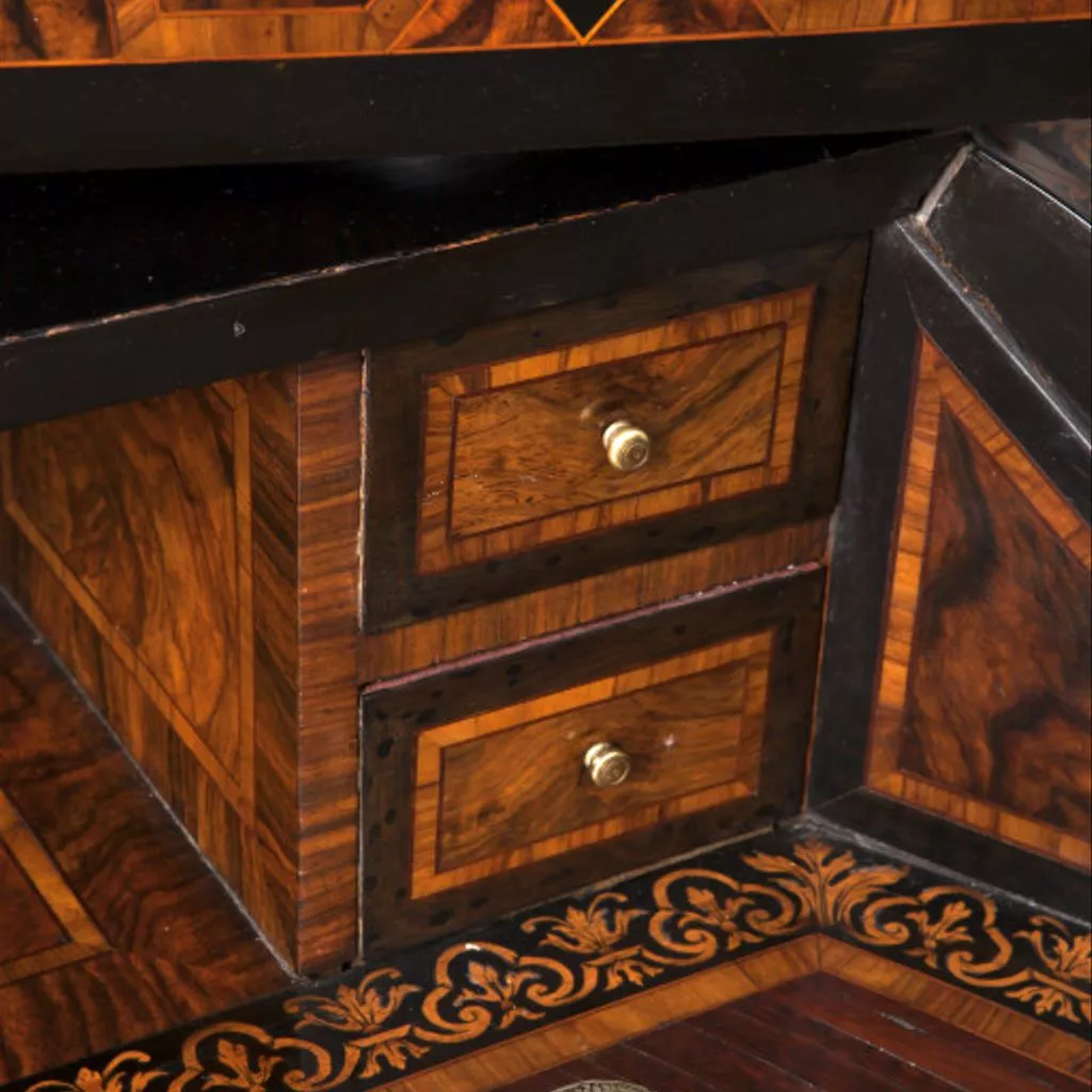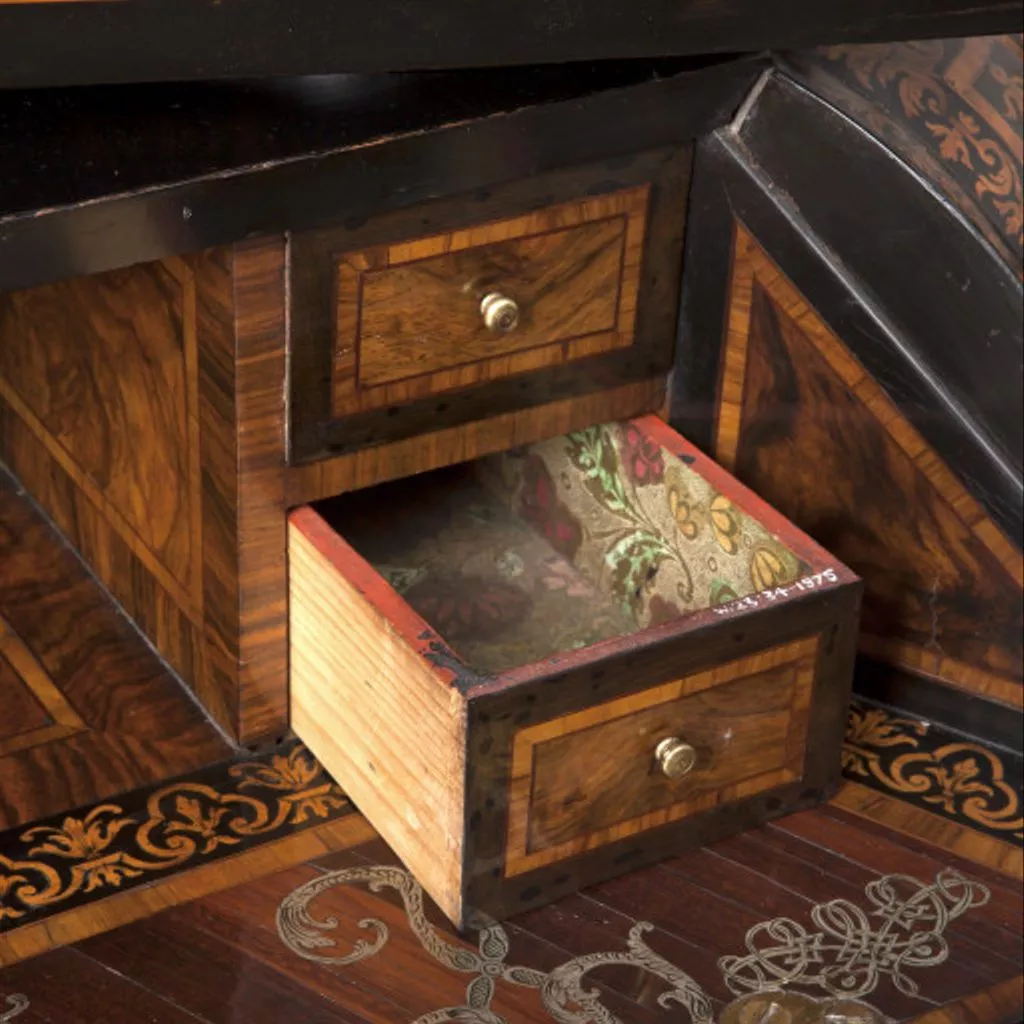 Writing-cabinets were fashionable furnishings for a library or study. They implied that their owner was both wealthy and educated, a person who needed a special place to house his papers and personal treasures. In Würzburg in Germany, a cabinet of this kind was called a Trisur, a term relating to 'treasure'. In the southern German states they were often decorated with boulle marquetry, which uses both woods and metals in its veneers, and takes its name from André-Charles Boulle, the best-known cabinet maker to Louis XIV in Paris. On this cabinet, a simplified version of the boulle technique is used to create the owner's arms on the main doors, standing out against the more traditional wooden marquetry which shows flowers and scenes of interiors. The rather piecemeal design of the marquetry may have been the result of young craftsmen wishing to demonstrate that they could undertake a variety of work, from floral marquetry and scenes of interiors, to marquetry of birds, and the use of metals and other materials such as horn.