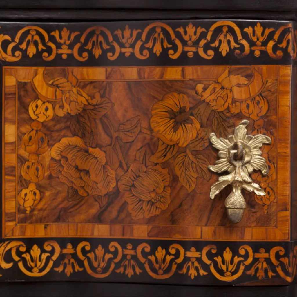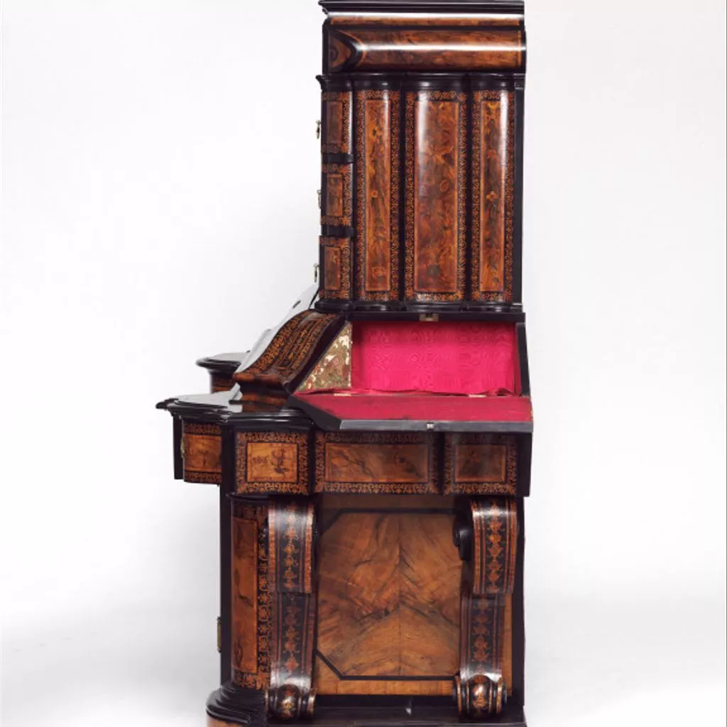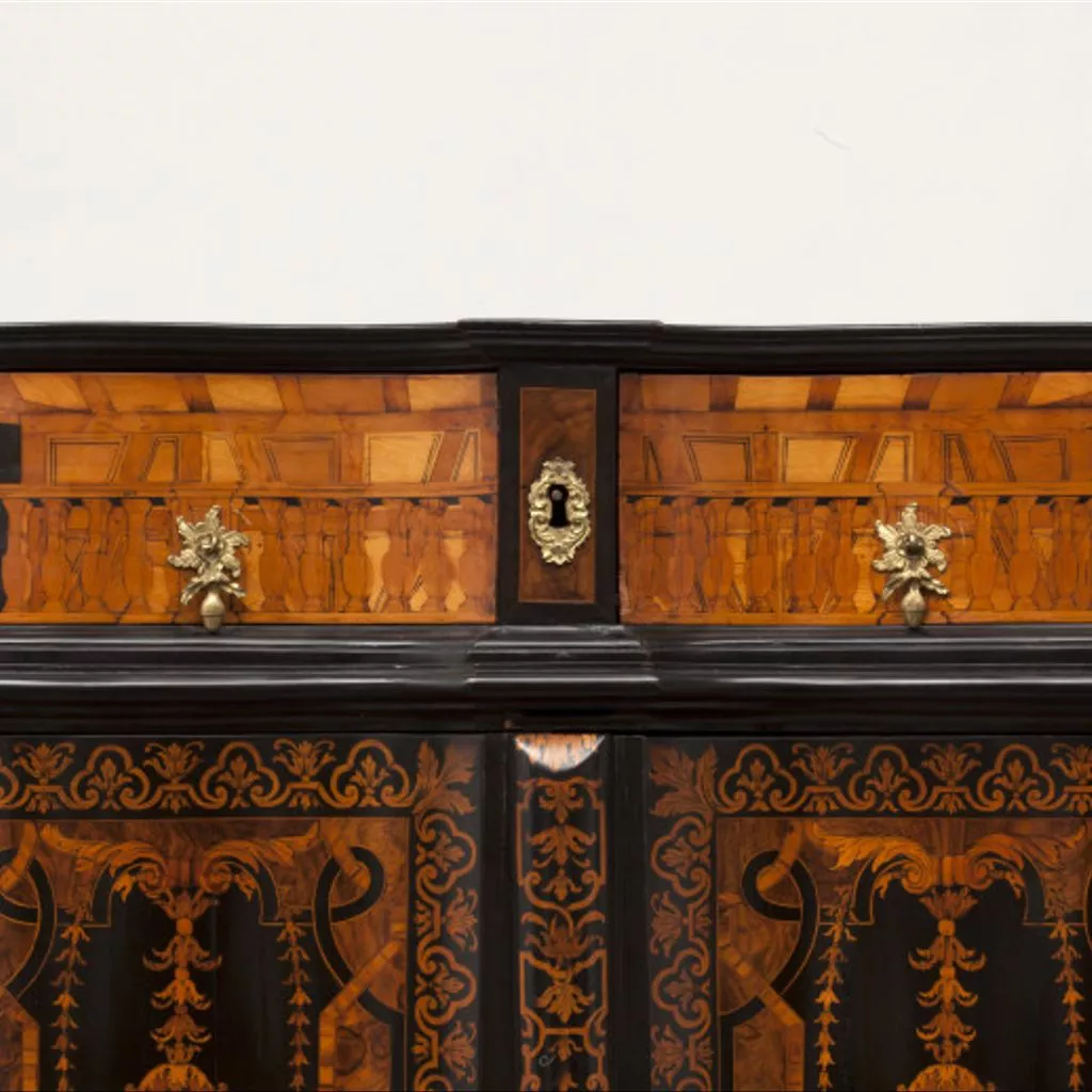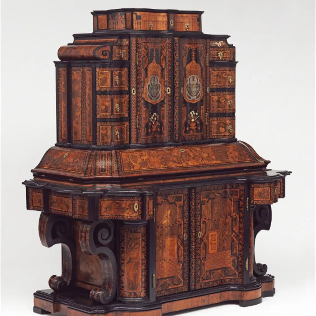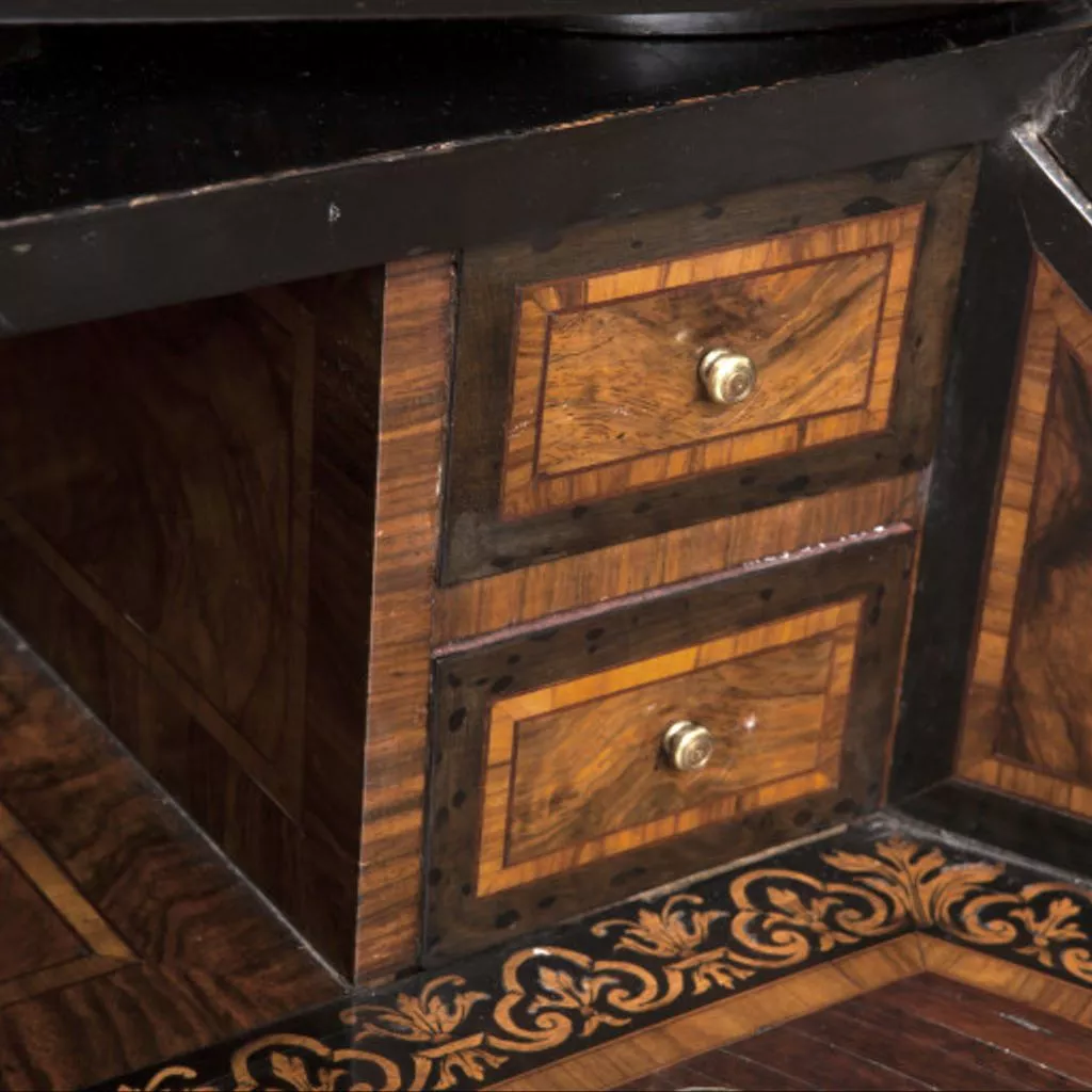 Writing-cabinets were fashionable furnishings for a library or study. They implied that their owner was both wealthy and educated, a person who needed a special place to house his papers and personal treasures. In Würzburg in Germany, a cabinet of this kind was called a Trisur, a term relating to 'treasure'. In the southern German states they were often decorated with boulle marquetry, which uses both woods and metals in its veneers, and takes its name from André-Charles Boulle, the best-known cabinet maker to Louis XIV in Paris. On this cabinet, a simplified version of the boulle technique is used to create the owner's arms on the main doors, standing out against the more traditional wooden marquetry which shows flowers and scenes of interiors. The rather piecemeal design of the marquetry may have been the result of young craftsmen wishing to demonstrate that they could undertake a variety of work, from floral marquetry and scenes of interiors, to marquetry of birds, and the use of metals and other materials such as horn.