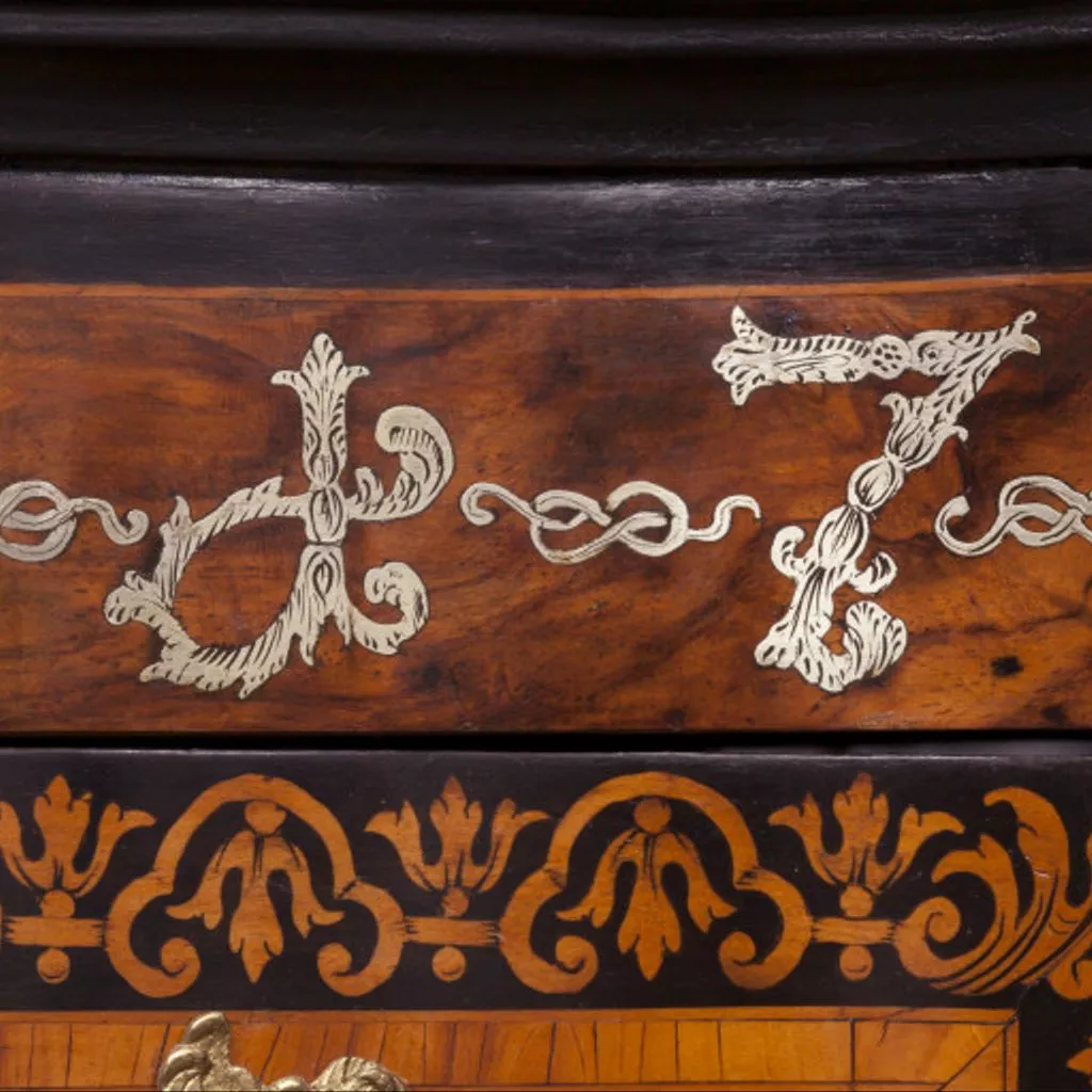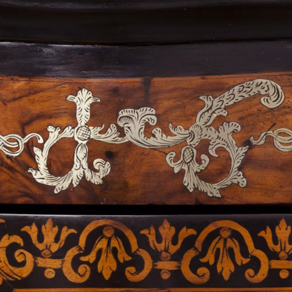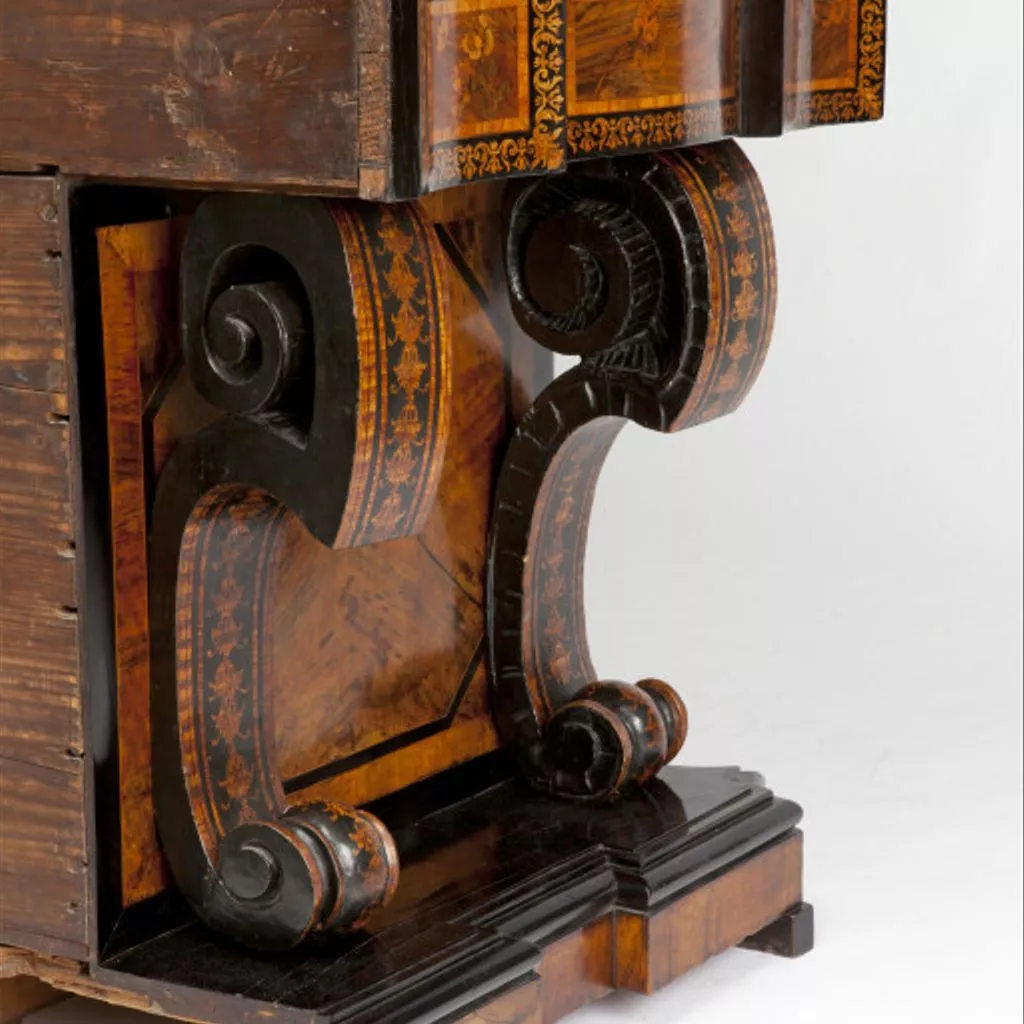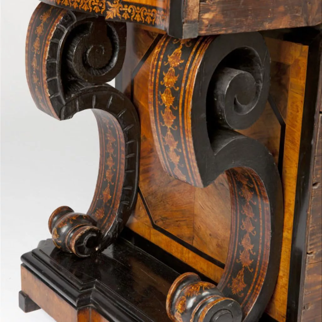 Pine veneered with walnut, ebony and ebonised wood; marquetry in turtle shell, horn, brass, pewter, ivory and several woods; copper alloy mounts [09.12.2015]