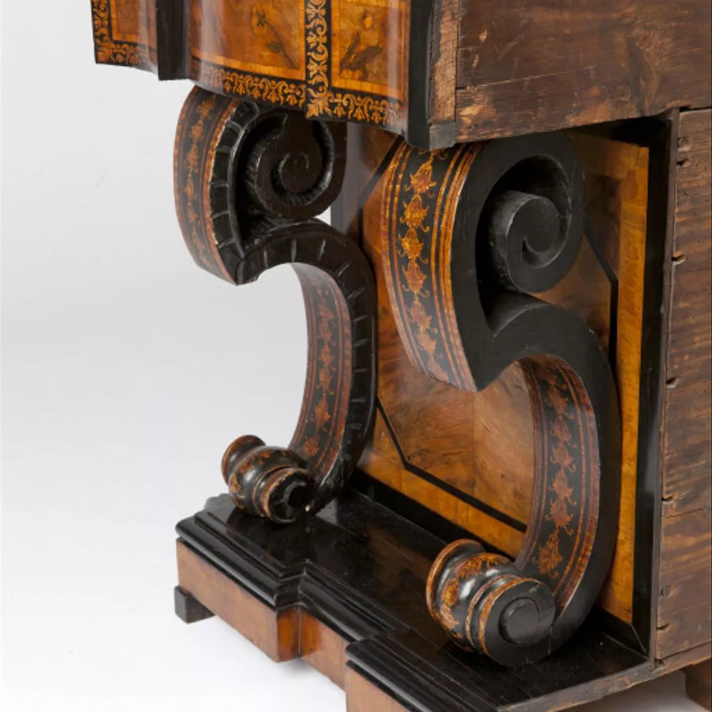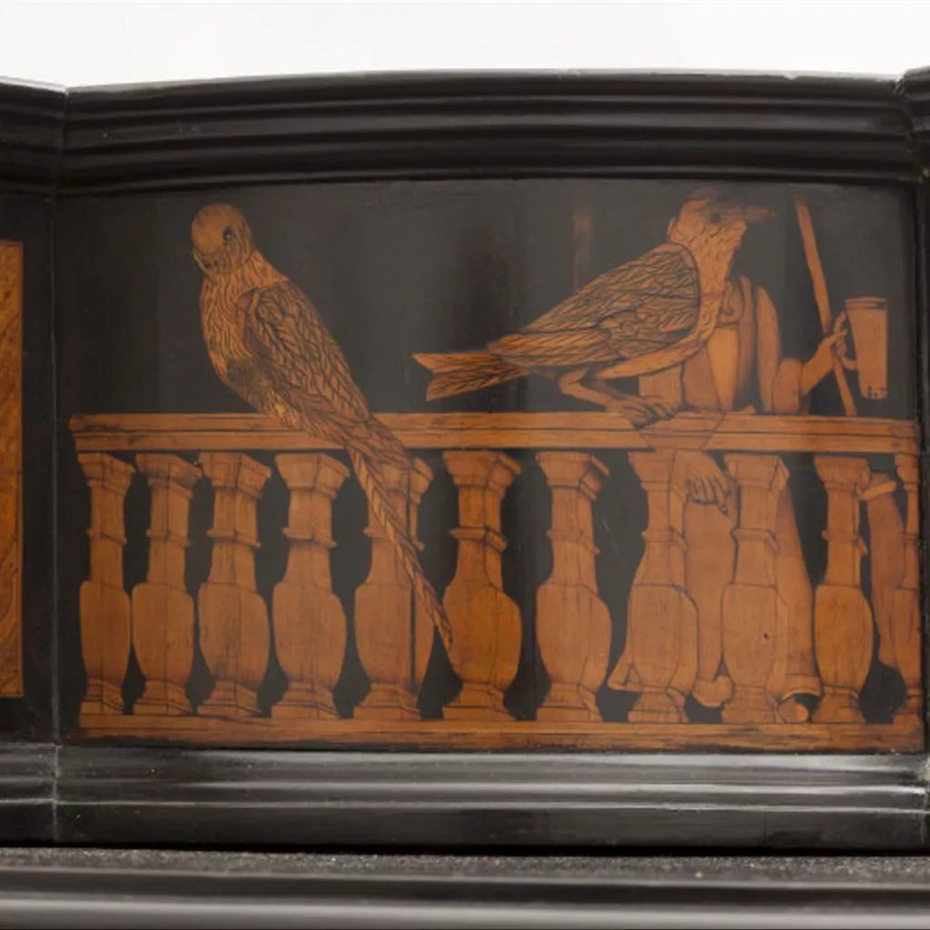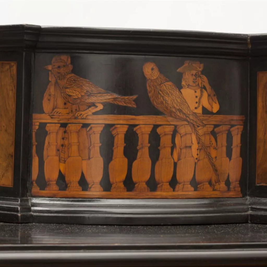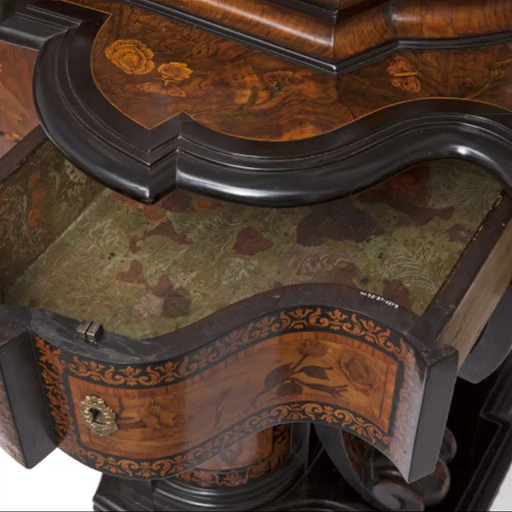 The panels on the doors, the quadrant panels, the shaped drawers and shaped panels at the drawer height on the sides, are outlined with bands of ebonized wood set with continuous bands of ornament in light-coloured sycamore (upright anthemion and formal foliage), suggesting similar banding on boulle marquetry. The grounds of all the panels except the doors are veneered with burr walnut, inlaid with naturalistic flowers. The doors are inlaid with interior scenes (mirrored on the two panels), suggesting a theatre set with a single door, a tripod table in the foreground with a top of alternate dark and light squares, all enclosed in a strapwork border, from which hangs a striped rope on which sits a parrot and from which hangs a bunch of flowers. These panels are an odd mixture of elements. They appear to have been designed to show all the aspects of marquetry in which the makers had experience - perspective, flowers, birds and textiles.