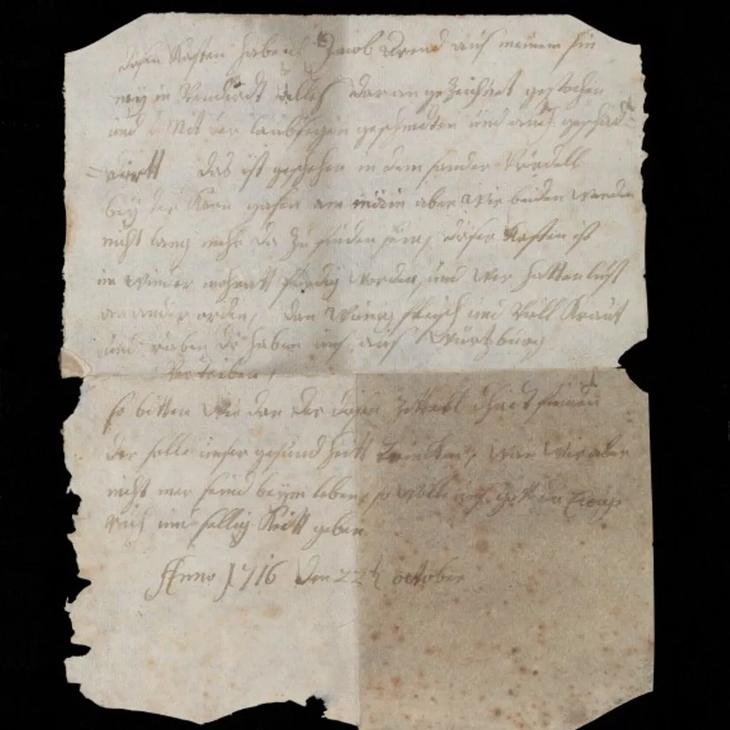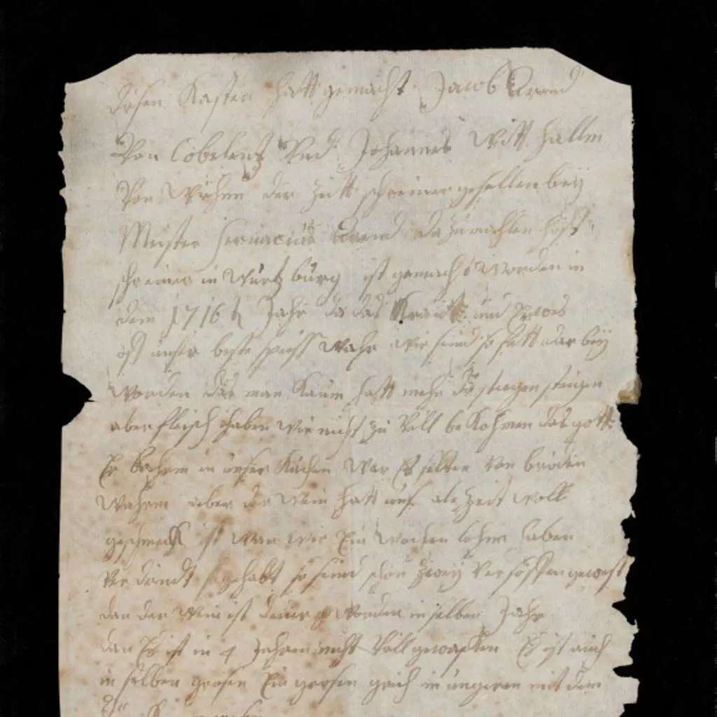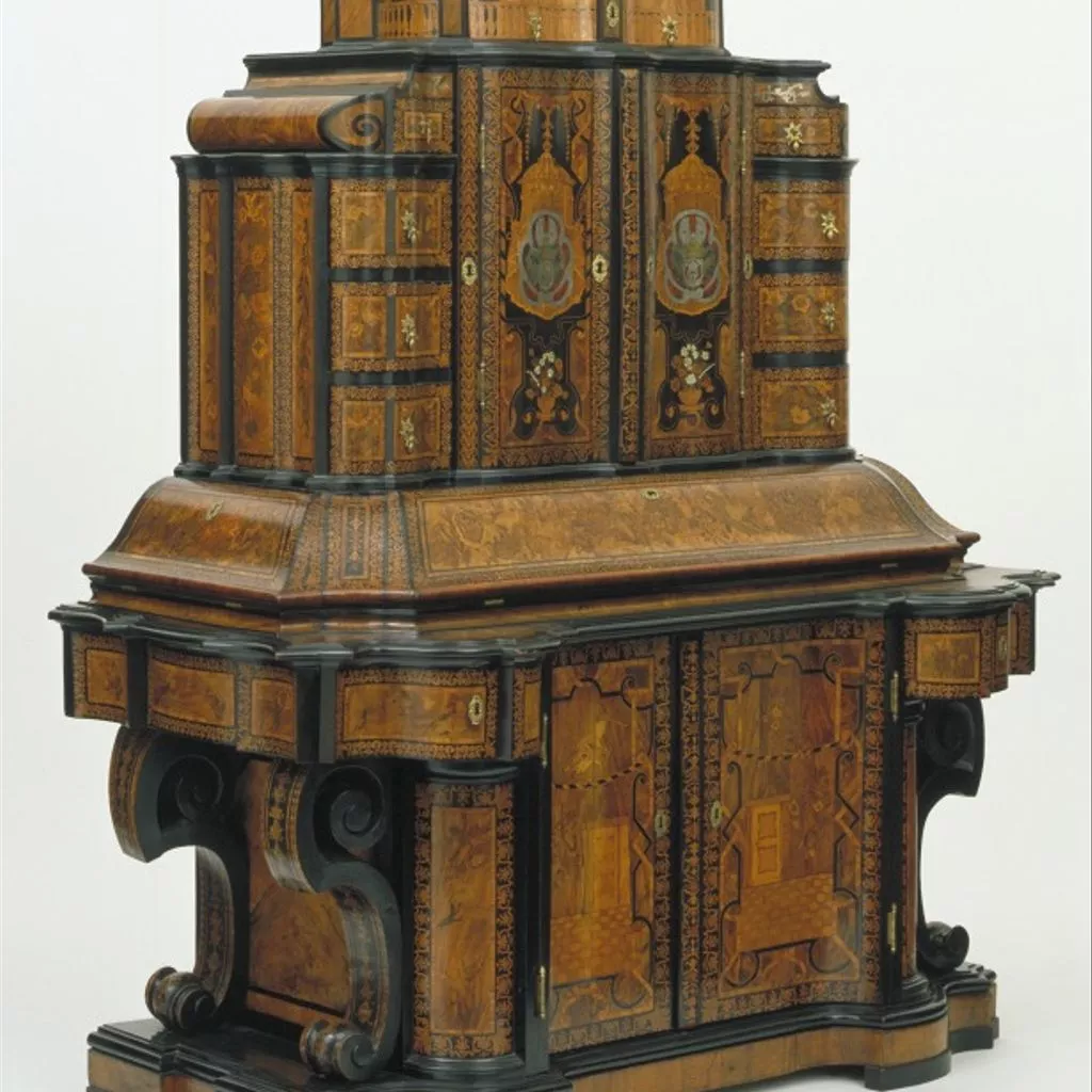 Writing cabinets in libraries or studies were status symbols for wealthy and noble men. This cabinet has a complex form and is clad in fashionable marquetry. The decoration incorporates the arms of its powerful owner, Gallus Jacob, finance minister to the Prince Bishop of Würzburg. The craftsmen who made the cabinet left a document inside it that gives a vivid description of the turbulent times in which they were working.