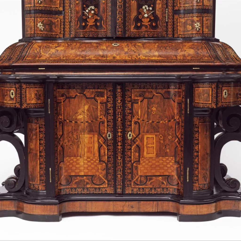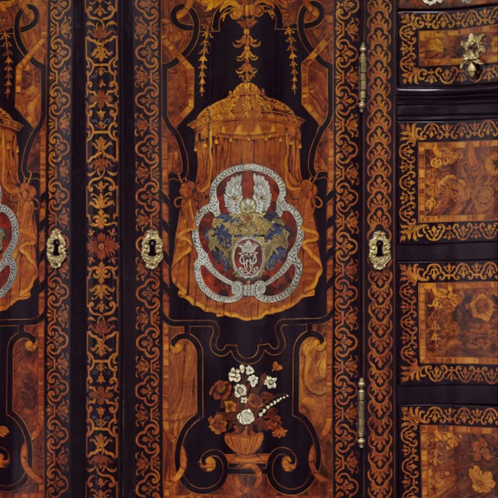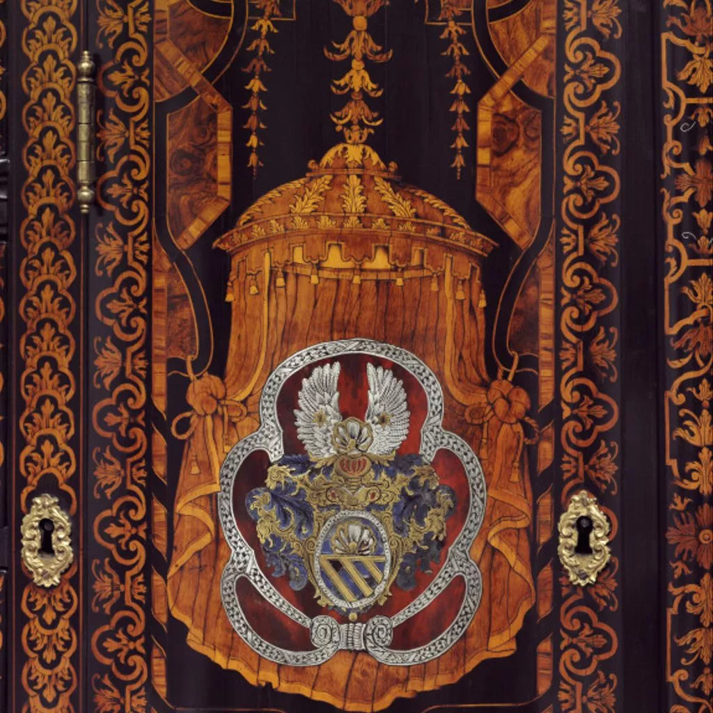 Writing cabinet(called in Würzburg a trisur) of bureau form, with cupboard above, veneered in walnut and other woods, with turtle shell, horn, pewter, brass and ivory, the marquetry including the date, 1716 and the arms and cypher of Jacob Gallus von Hohlach (1665-1724). Made in Würzburg, 1716 by Jacob Arend of Koblenz and Johannes Wittalm of Vienna, working for Servatius Arend, the court cabinet-maker in Würzburg.