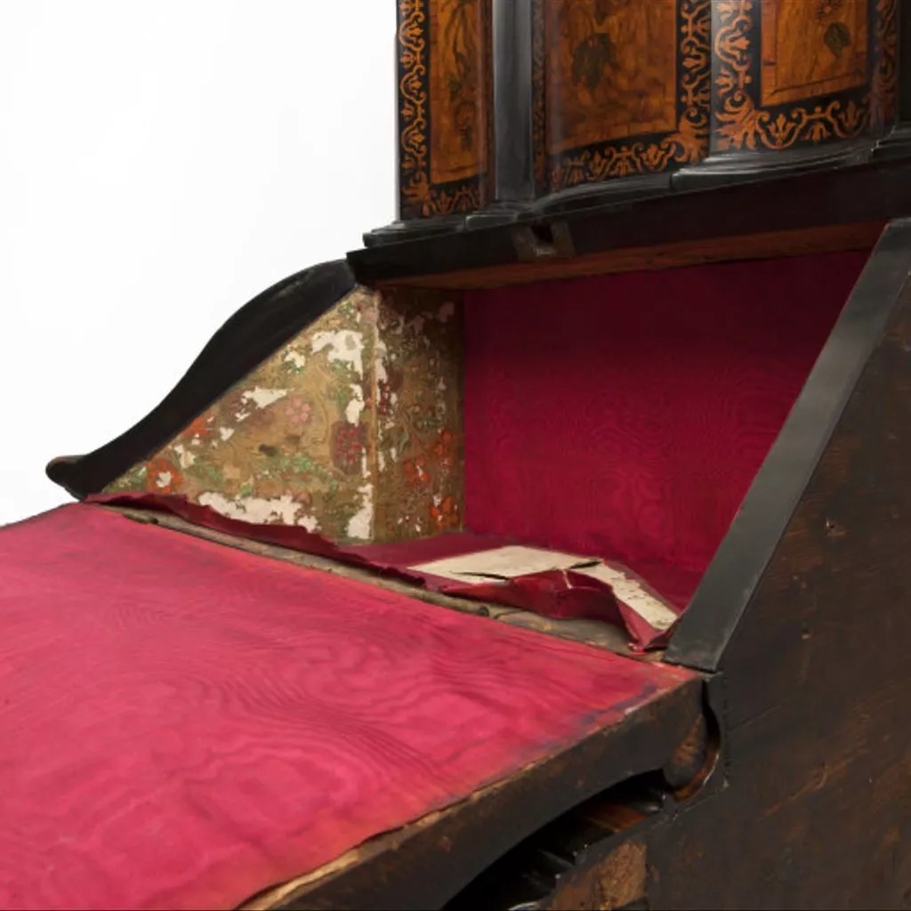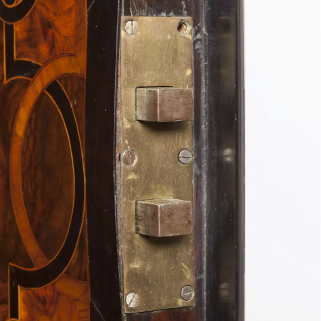 The upper part of the lower tier is composed of three writing compartments, the two side ones set at right angles to the main compartment. The hinged flaps of these, and the stepped panels at the front corners, are outlined with versions of the repeating patterns in light and ebonized wood, surrounding grounds of burr walnut. On the flaps only these bandings surround panels of burr walnut, outlined with tulipwood cross-banding, and set wtih floral marquetry in naturalistically stained woods (now faded), including tulips, roses and rosebuds and carnations, and with parrots and insects and butterflies, the antennae of these in pewter. The ledges in front of the side flaps show flowers and butterflies, also with antennae in pewter. The two side compartments were originally lined with stamped, printed paper, now covered with watered red silk over panels of cardboard. Each is set with a steel lock with double bolts, spring locks with a single throw.