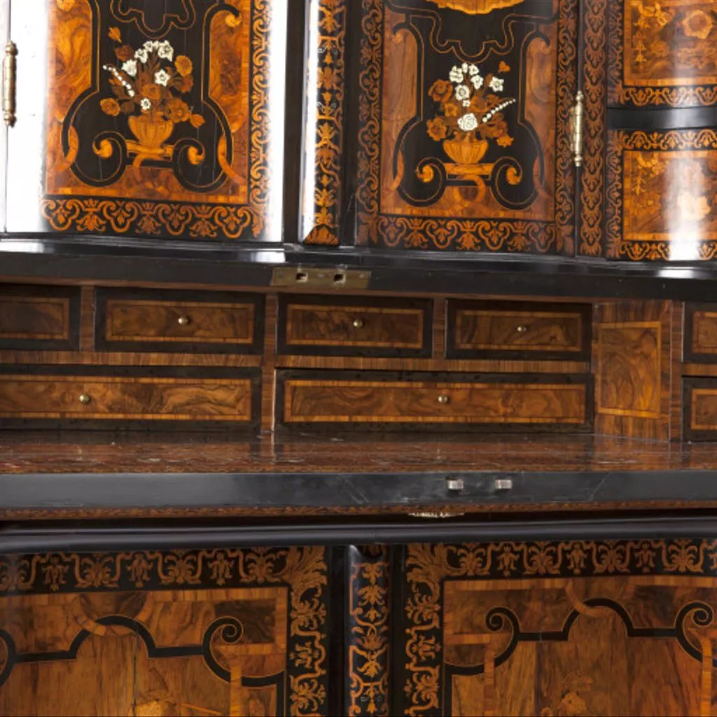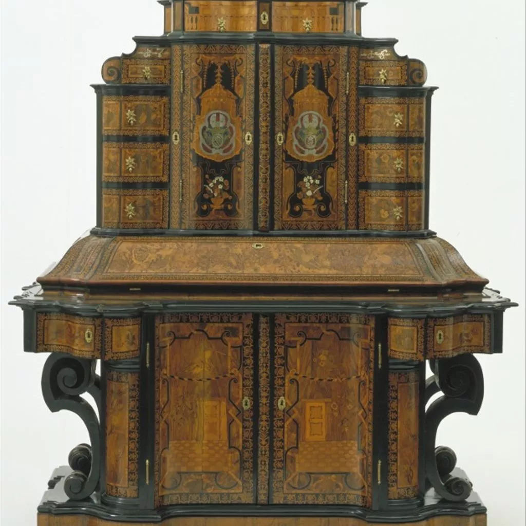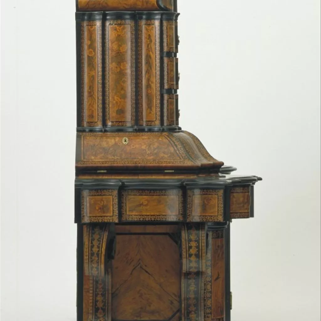 Writing cabinet, apparently in three sections (actually two), veneered in walnut, with marquetry of turtle shell, horn, brass, pewter, ivory and various woods, including snakewood, on a carcase of pine, the drawers lined with embossed gilded and colour-printed paper; mounts of lacquered brass. The cabinet takes the form of an English bureau with an integral cupboard above. The cabinet is inlaid with the date 1716 in pewter on the frieze and inside the writing flap is inlaid the cyper of Jacob Gallus von Hohlach (1665-1724), whose arms appear in the marquetry of the upper doors.