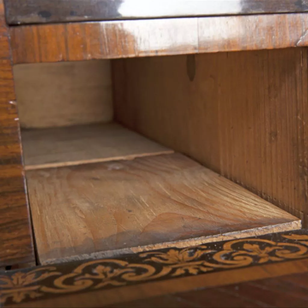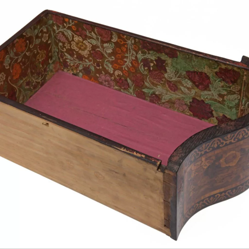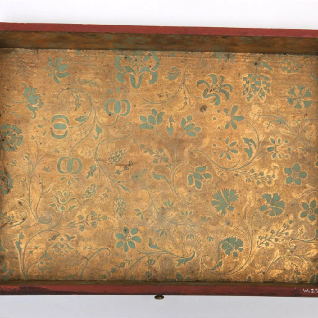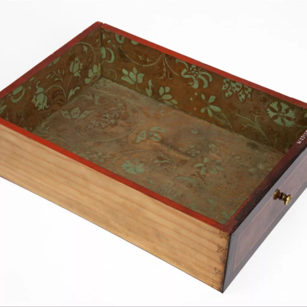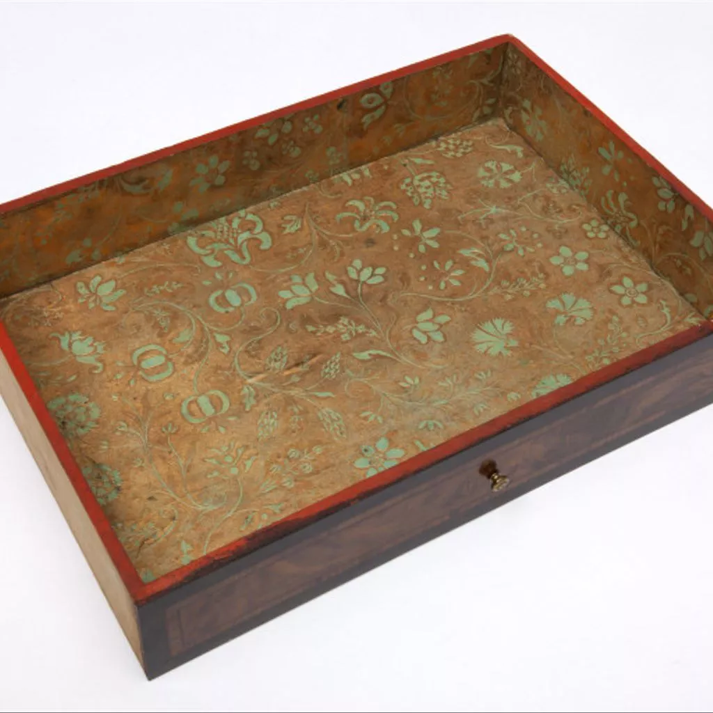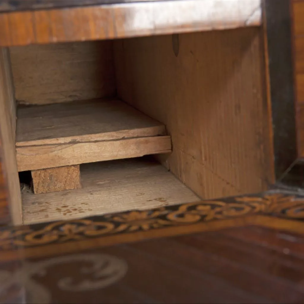 The drawers and the side writing compartments are lined with decorative papers, in four different patterns embossed and printed with bronze powders and with coloured block prints of flowers and leaves. The disposition of the papers does not seem to follow any particular pattern. These papers are of the kind first made in Augsburg and Southern Germany, which later became used throughout Europe. None of the drawers are large enough to use a single sheet whole, so the dimensions of the sheets cannot be checked and none carry a maker’s name. Such papers were called ‘bronze-varnished papers’ or ‘brocade papers’. Those with an embossed ground were a recognized type, known as ‘spotted or stippled brocade papers’. Some of the interior drawers are additionally lined inside the base only with a plain red paper, presumably added in the 1840s, at the same time as the silk lining of the side compartments and the upper cupboard was done.