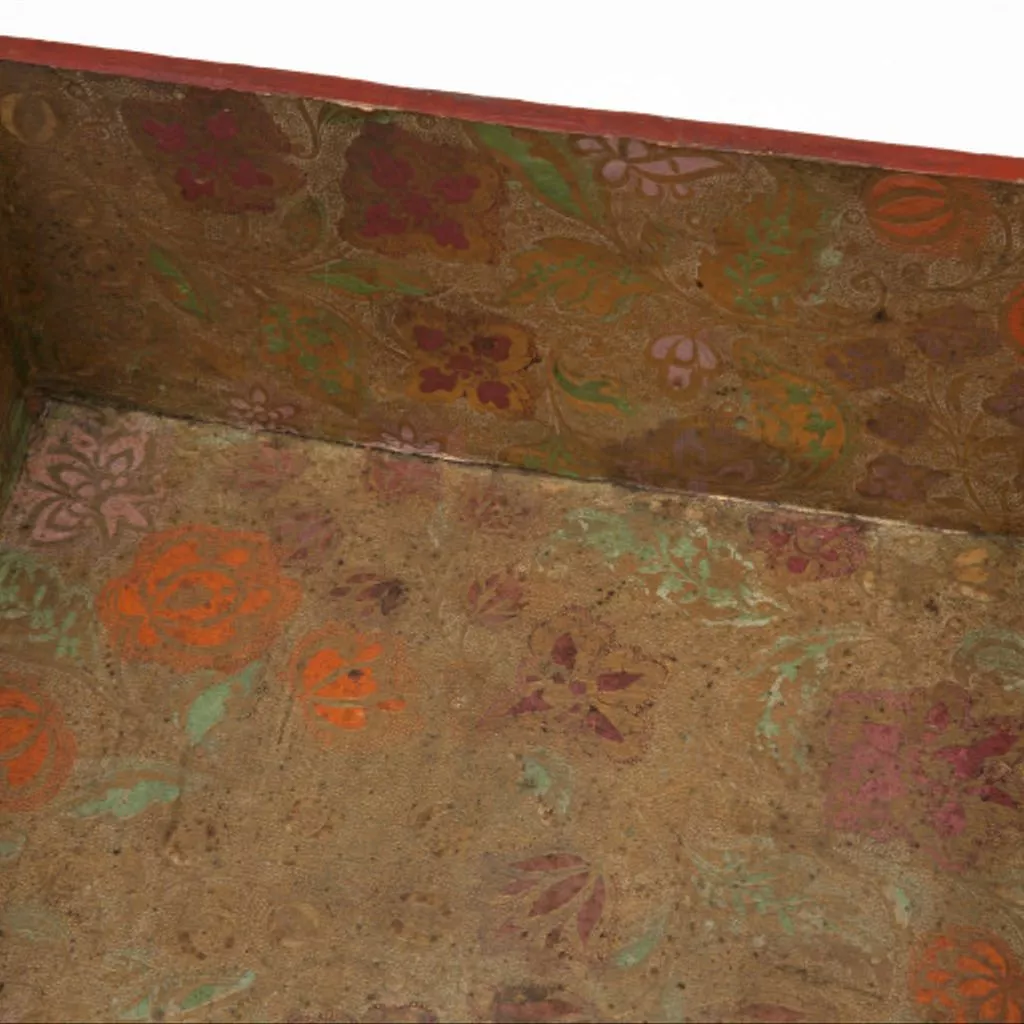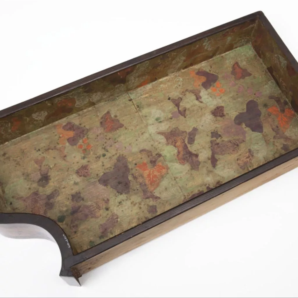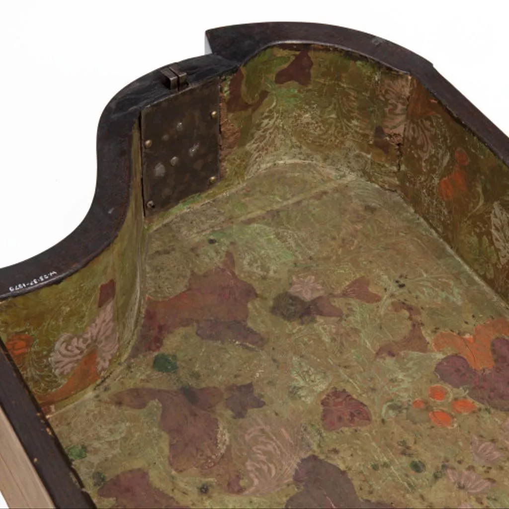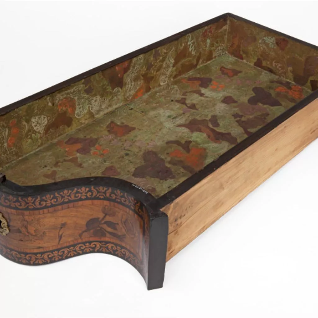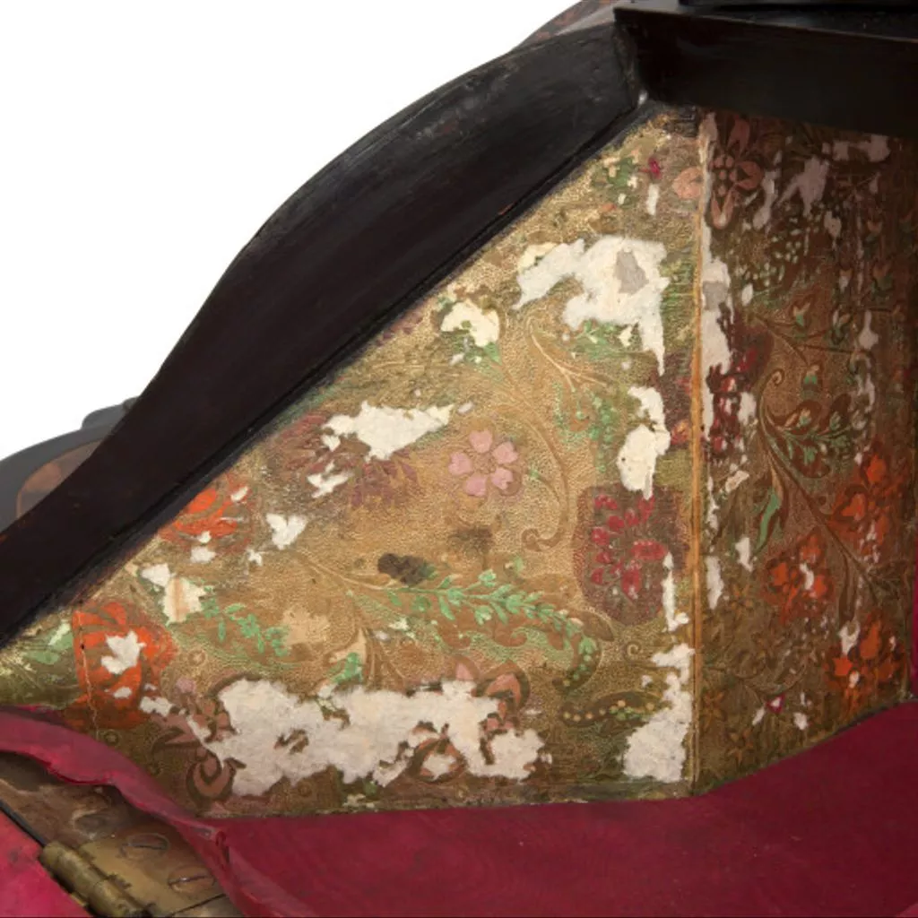 The drawers and the side writing compartments are lined with decorative papers, in four different patterns embossed and printed with bronze powders and with coloured block prints of flowers and leaves. The disposition of the papers does not seem to follow any particular pattern. These papers are of the kind first made in Augsburg and Southern Germany, which later became used throughout Europe. None of the drawers are large enough to use a single sheet whole, so the dimensions of the sheets cannot be checked and none carry a maker’s name. Such papers were called ‘bronze-varnished papers’ or ‘brocade papers’. Those with an embossed ground were a recognized type, known as ‘spotted or stippled brocade papers’. Some of the interior drawers are additionally lined inside the base only with a plain red paper, presumably added in the 1840s, at the same time as the silk lining of the side compartments and the upper cupboard was done.