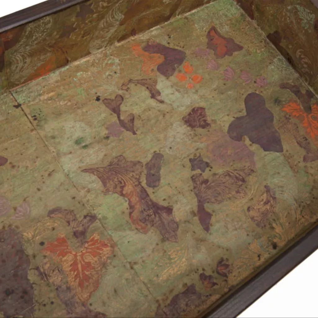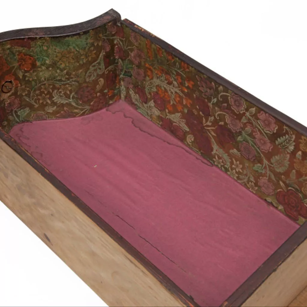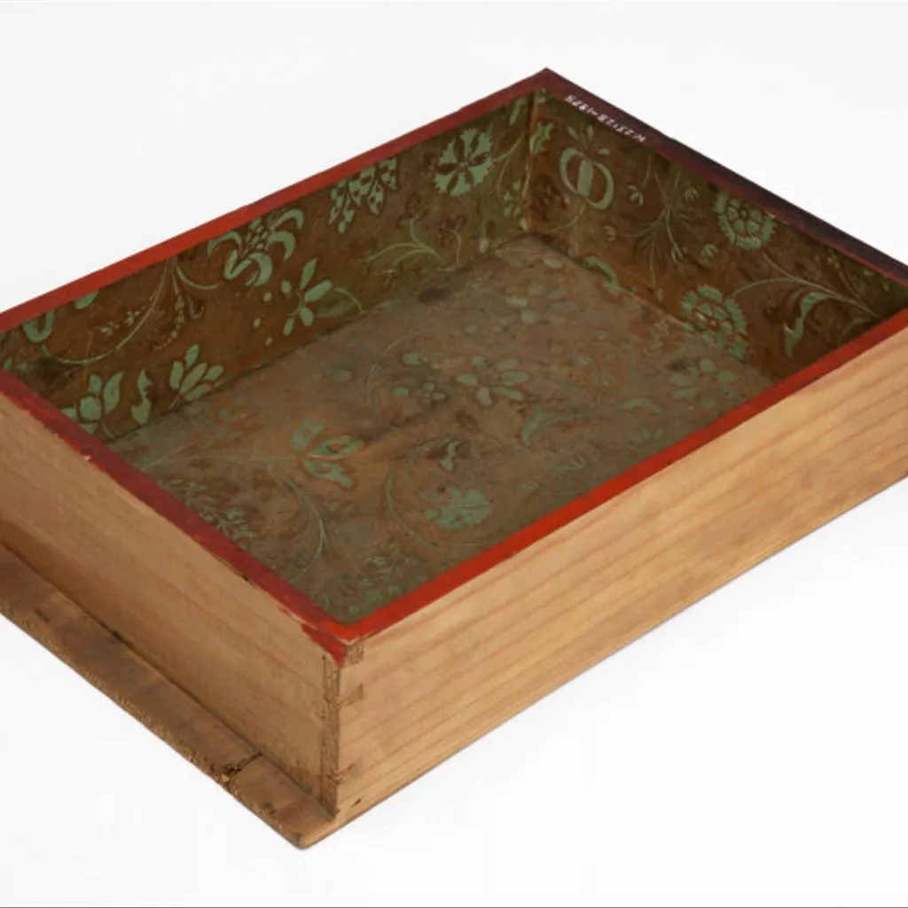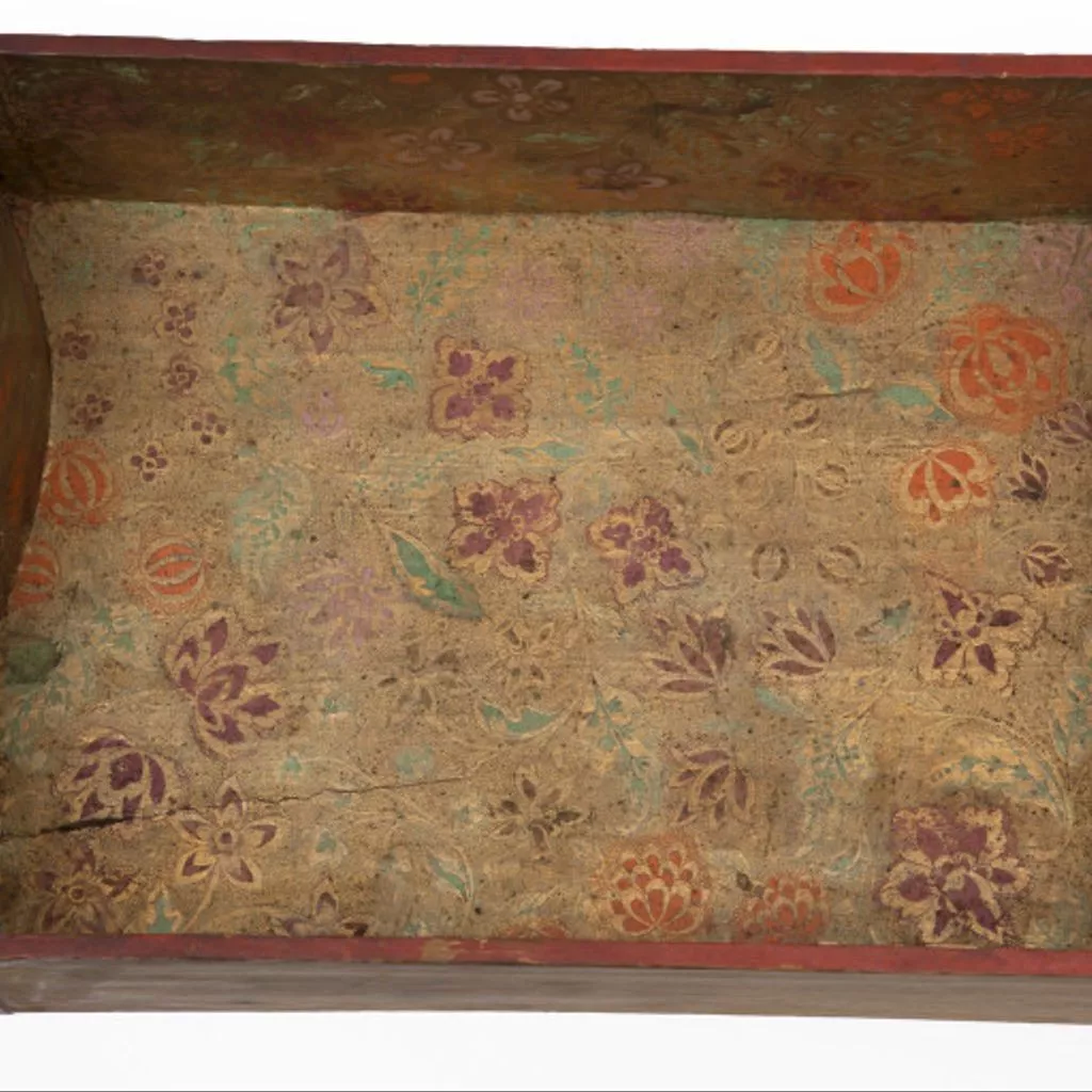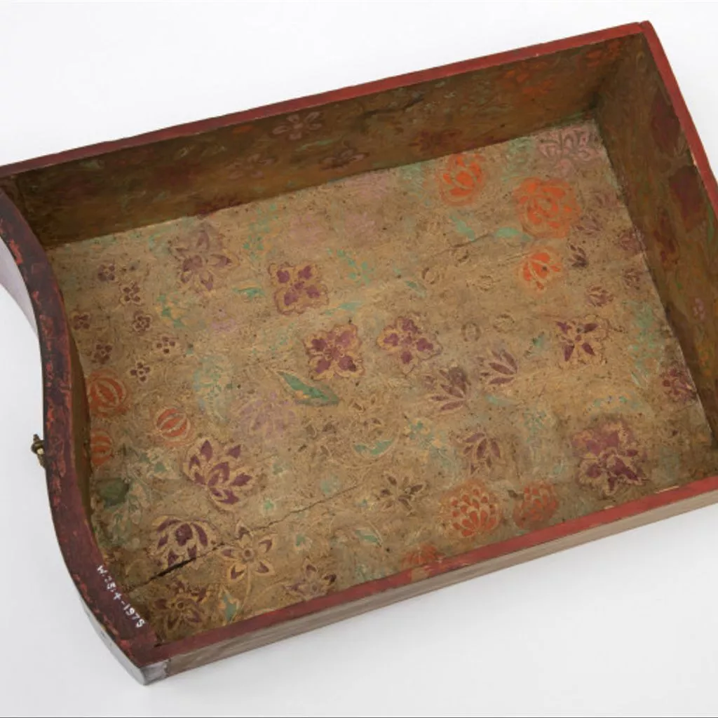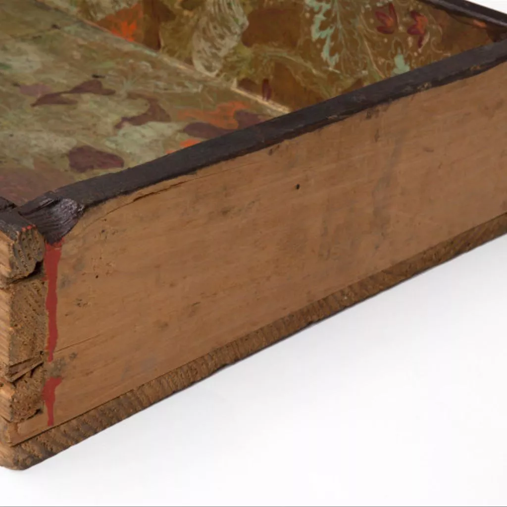 The drawers and the side writing compartments are lined with decorative papers, in four different patterns embossed and printed with bronze powders and with coloured block prints of flowers and leaves. The disposition of the papers does not seem to follow any particular pattern. These papers are of the kind first made in Augsburg and Southern Germany, which later became used throughout Europe. None of the drawers are large enough to use a single sheet whole, so the dimensions of the sheets cannot be checked and none carry a maker’s name. Such papers were called ‘bronze-varnished papers’ or ‘brocade papers’. Those with an embossed ground were a recognized type, known as ‘spotted or stippled brocade papers’. Some of the interior drawers are additionally lined inside the base only with a plain red paper, presumably added in the 1840s, at the same time as the silk lining of the side compartments and the upper cupboard was done.