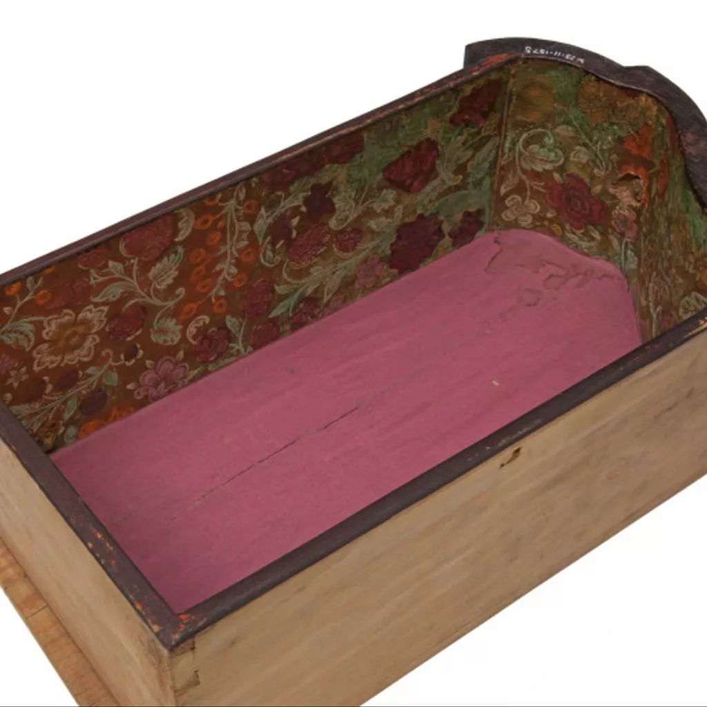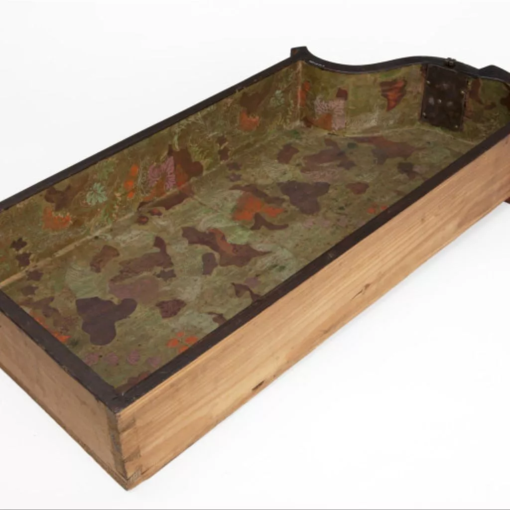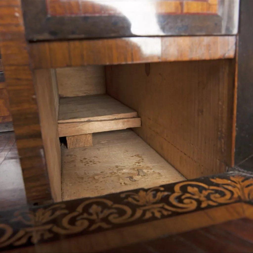 If you remove the lower right drawer the floor of the compartment can be removed at the front as a single block of pine, revealing a recess under the back half of the floor. It is assumed that this is where the letter from the makers (see below) was found. A similar arrangement is visible under the lower left drawer but, although it is clear that strenuous efforts had been made to lift it before the cabinet came to the Museum, it has not proved possible to remove it safely.