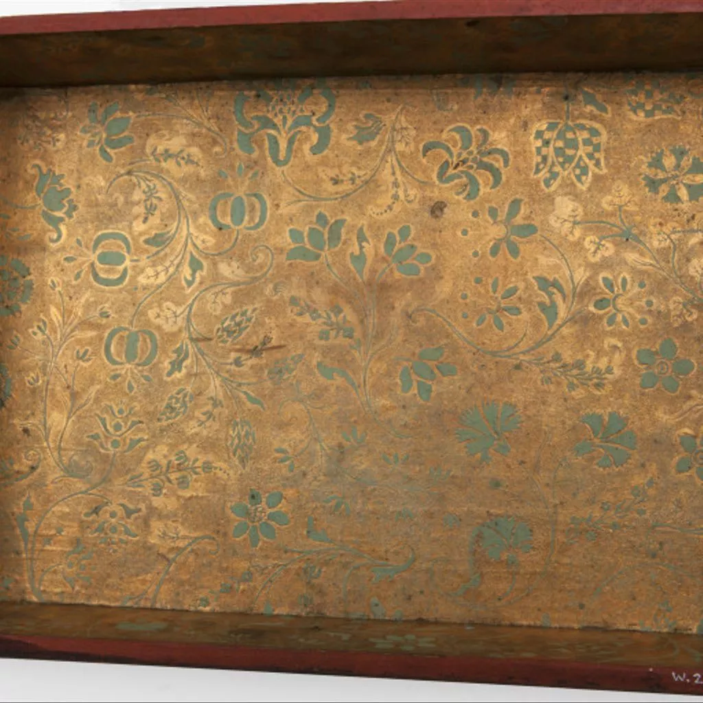 This is the most commonly used. It is printed in a bronze powder with a spotted, embossed ground and embossed outlines of stems, leaves and flowers in gold powder around unprinted areas. The flower heads, groups of small flowers, and foliage areas, are over-printed with blocks of green, scarlet, pink, yellow or crimson. These do not cover the printed designs with any precision. One flower type has a trumpet centre, similar to a daffodil. This paper is used in drawers :3 to :10; :12; :26; :34 and in the right (PL) writing compartment