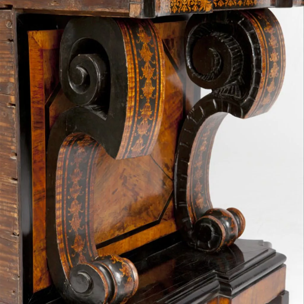 The sides of the upper section are each set with three panels showing floral marquetry against a ground of burr walnut, outlined with bands of repeating ornament in dark and light woods. Above, the side of console scrolls are veneered in burr walnut, outlined with ebonized bandings. The stepped panels of the attic section at each side are similarly veneered, with a central long panel on each side showing a continuation of the balustrade of the front, with parrots perched on it.