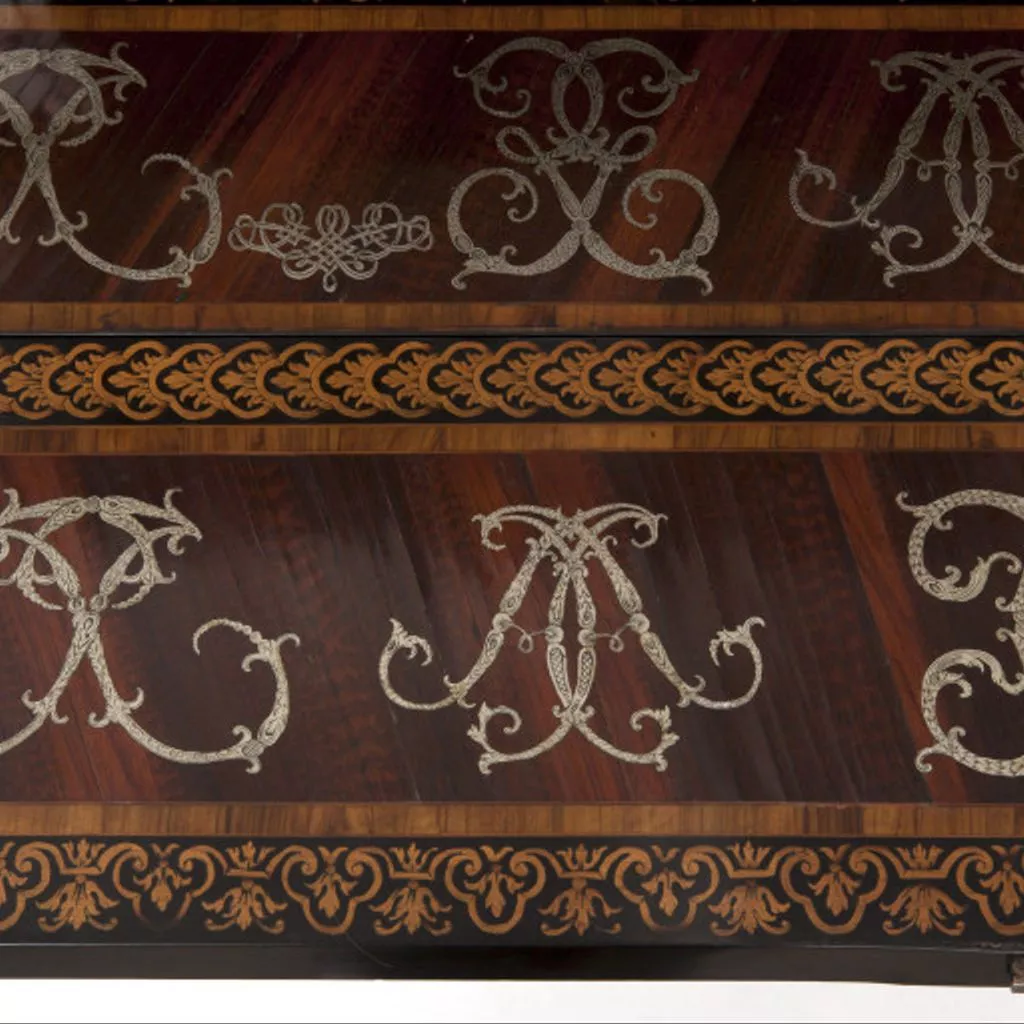 The main compartment is highly decorated within. The flap and the base panel just behind it are each trapezoidal in shape and mirror each other in design, providing a frame for the owner's cypher, set in engraved pewter in a ground of snakewood, set with the grain running front to back, within bands of ornament in light and ebonized wood showing three-lobed motifs taken from boulle marquetry, in two patterns and edged with cross-banding in tulipwood and stringing in light and dark woods. The cypher, with calligraphic flourishes at either end on each line, is composed of addorsed pairs of letters forming monograms, together reading:
