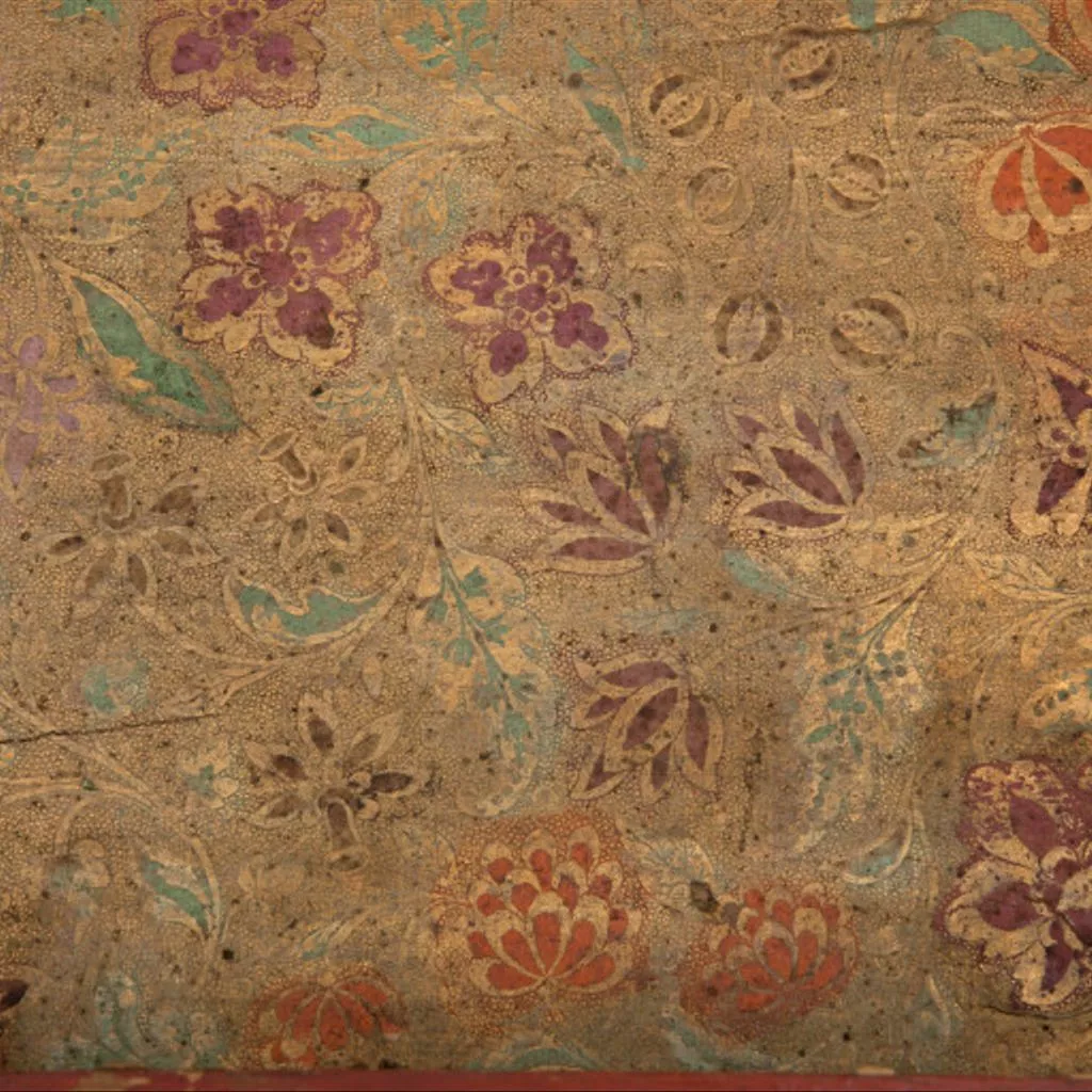 The ground is not stippled but printed with bronze powder, over a white ground that is printed with blotchy patches of several shades of pinky purple, an orangey red, yellow and pink. Recognizable flowers include fritillary, tudor-type roses and daffodils, with poppy seed heads and bunches of grapes. Paper 2 is used in drawers:17 to :18; :24; :27 to :32; 36-:37.