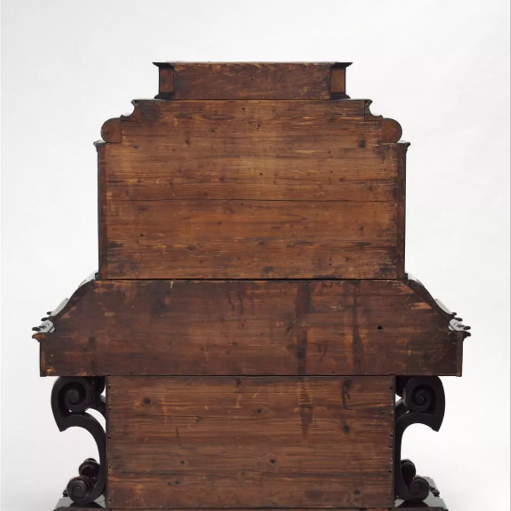The cabinet appears to be in three sections, with a central, sloping, flap-fronted writing compartment extending wider than the upper and lower cupboards, each accessed by two doors.The lower cupboard is buttressed on each side by a pair of stepped, S-scrolled consoles that support the outer drawers on each side, just below the writing compartment. This compartment is in three sections, with smaller flaps on the sides as well as the front. The cupboard doors of the upper tier are flanked by a bank of four drawers on either side, the topmost drawers stepping inwards with scrolling consoles at the outer ends. A frieze of two drawers forms a cresting to the cupboard.