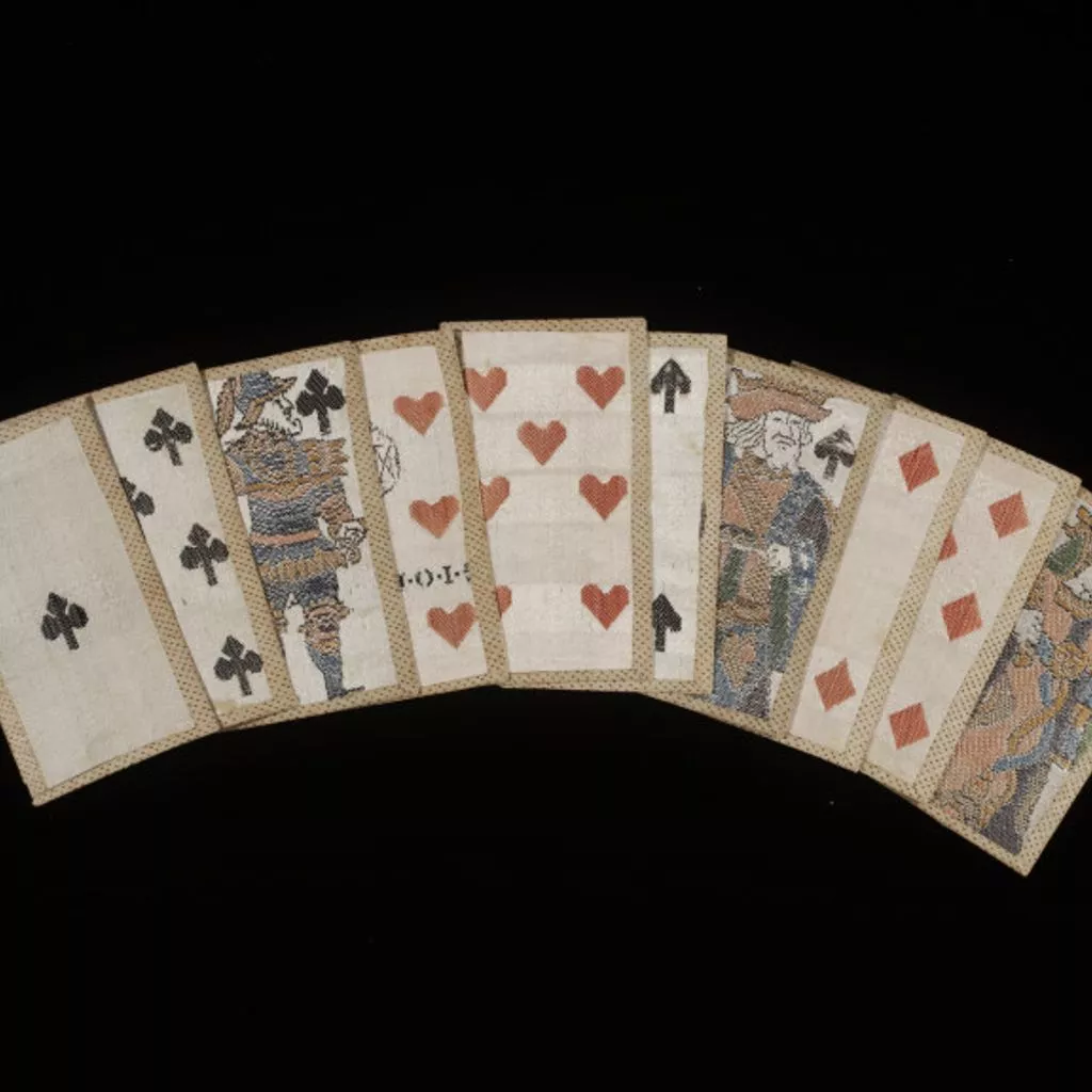 One of a set of playing cards in woven silk with a print of a halbedier supporting the arms of the Grand Dukes of Tuscany on the reverse This card in woven silk comes from a pack of forty eight (all the tens are missing). The backs of the cards in the pack, which are all identical, are covered with a seventeenth century print of a halbedier holding a shield bearing the arms of the Grand Dukes of Tuscany. The backs are wrapped around the edge of the woven image, a characteristic of Italian packs of the period. The Court cards (King, Queen and Knave) are based on a French design known as the Auvergne pattern. These cards may have been made as a gift, possibly a wedding present. The six of Hearts has the name of the maker, Giovanni Panichi, and his weavers’ mark, woven into the design. Six of Hearts; playing card with makers name and makers mark in woven silk with print of a halbedier used as the back from a pack of forty eight; Florentine; circa 1730-40.