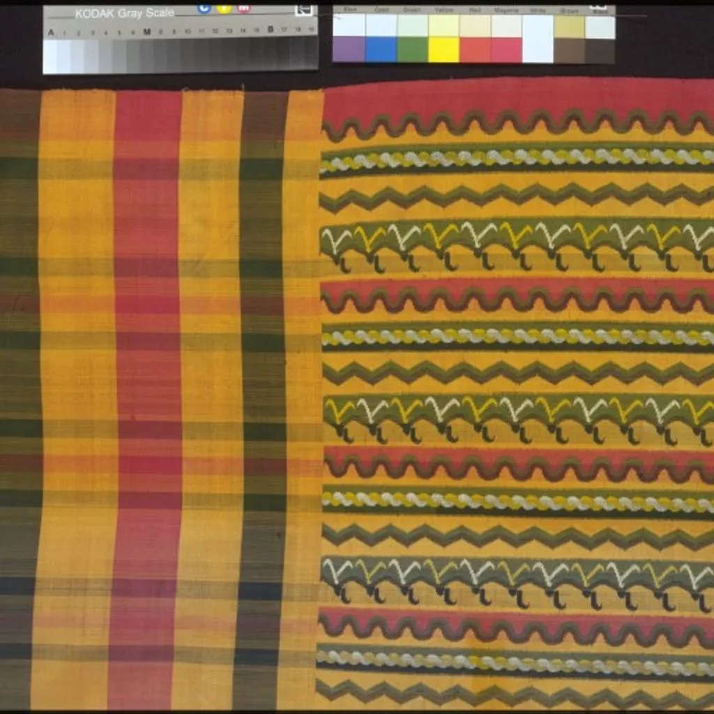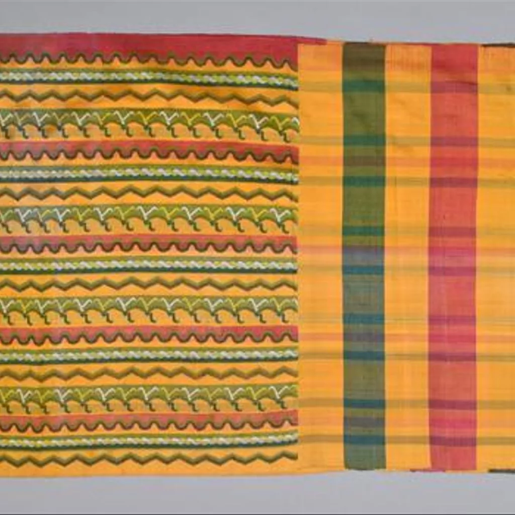 Part of a man's skirt (pah-soe), Burmese silk pah-soe piece. Konbaung Dynasty (1752-1885). ca. 1880. Acheik-luntaya patterns in various colours. A piece made up of four and a half repeats of various weft acheik (horizontal wave) patterns with checkered end borders in a subtle variation of tones including deep pink, gold colour, two shades of green, maroon and white. This length would have formed half a pah-soe. This detail shows the long edge of a silk piece intended to form part of a pah-soe, the voluminous wrapped and draped skirt worn by fashionably dressed Burmese gentlemen on festive occasions. Typical of such a garment this piece displays the unique Burmese pattern called '100 shuttles' in an interlocking tapestry weave known as acheik-luntaya in a design and colours reserved for men's clothing.