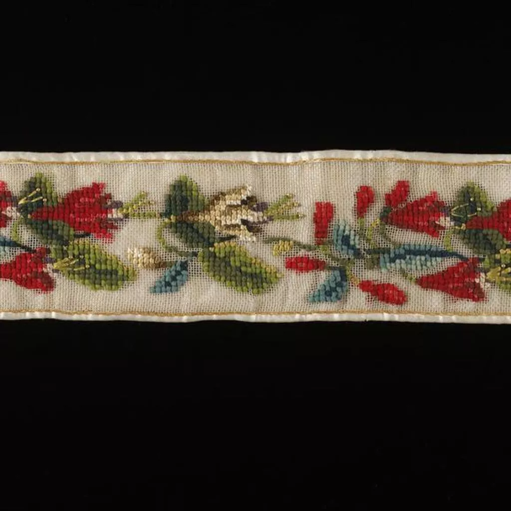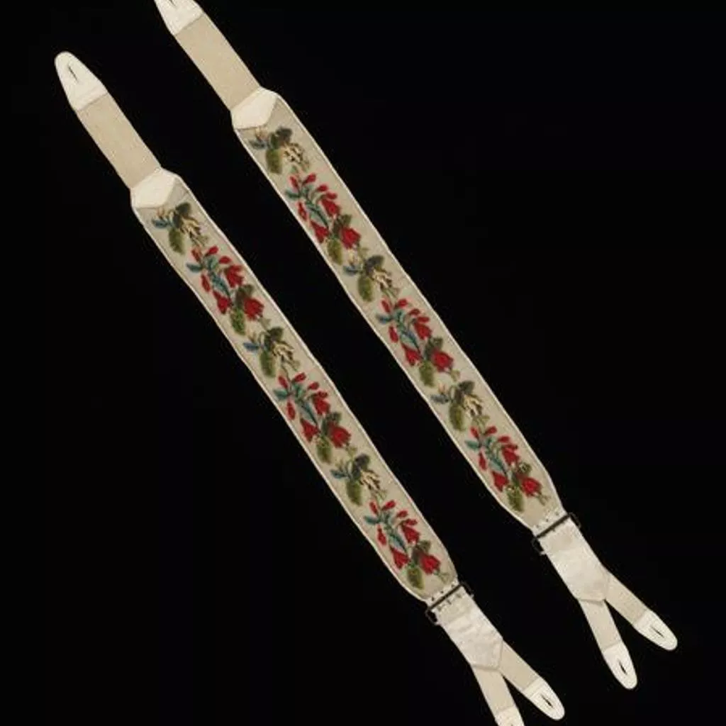 Braces were introduced with trousers in the early 19th century. Trousers were fairly loose at the waist and braces provided necessary support. They were often elaborately decorated, as in this example, which is covered with net and embroidered in a variety of materials. The first elastics, made of rubber, were introduced in the 1830s and often used on braces.