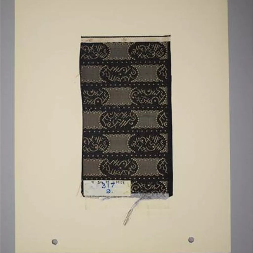 Textile sample of Jacquard-woven silk, Derby, 1830 Textile sample of Jacquard-woven silk. With a design in cream on a black ground of 0.75 inch wide bands in which motifs, possibly inspired by Chinese or Arabic caligraphy, alternate with plain panels of concaved outline.