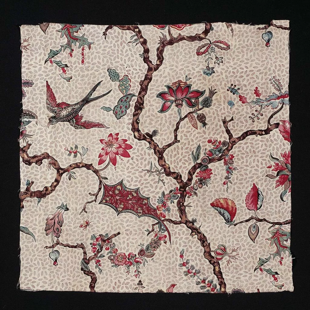 Natural cotton ground powdered with small pointed ovals composed of red dots. Partial repeat; shows undulating brown branches bearing a variety of pink, red, blue and light ochre blossoms and leaves. A swallow in flight, upper left. Two repaired breaks at left.