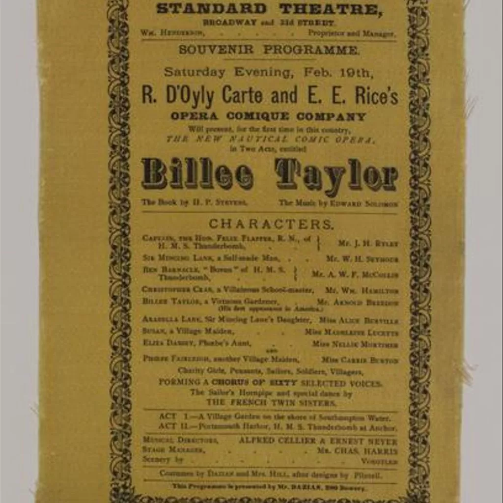 Silk programme for Billie Taylor, Standard Theatre, 1881 Yellow silk programme printed with black typographical ink, mounted on cream cardboard. Although Billee Taylor opened in New York after a successful run in London, American reviews compared it unfavourably to the works of Gilbert and Sullivan. The comic opera, based on a poem and song by the eighteenth-century playwright Richard Brinsley Sheridan, follows the story of how a gardener and his sweetheart become embroiled in the romantic complications of a Captain and his crew. The Standard Theatre in New York opened as the Eagle Theatre in 1875. After its re-naming in 1878, it played host to several American premieres of Gilbert & Sullivan's operas, earning $100,000 from its run of Patience. In 1898 William Brady and Florenz Ziegfeld took over management, re-christening the theatre once again as the Manhattan Theatre.