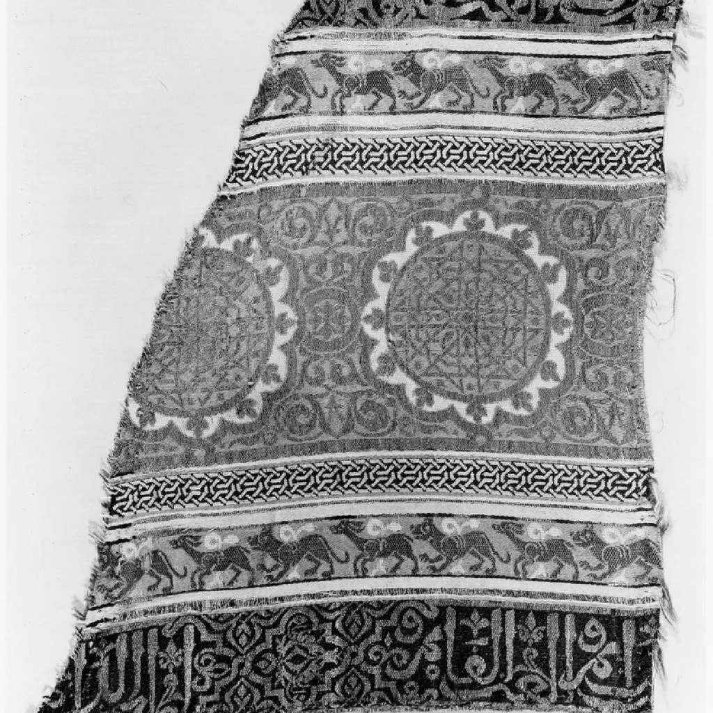 Fragment of pinkish red silk with repeat of 12-lobed circular medallions woven with white silk and gold thread (yellow silk wound with golded skin) enclosing interlacing star form, surrounded by curving arabesques, both woven with gold. Above and below: narrow band of red with running animals woven with green; part of 2 borders with calligraphic designs woven with gold thread -- one on blue, one on black silk ground.
