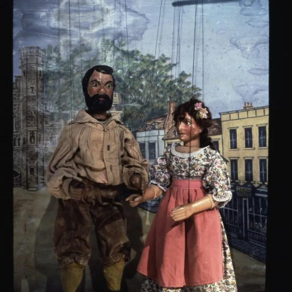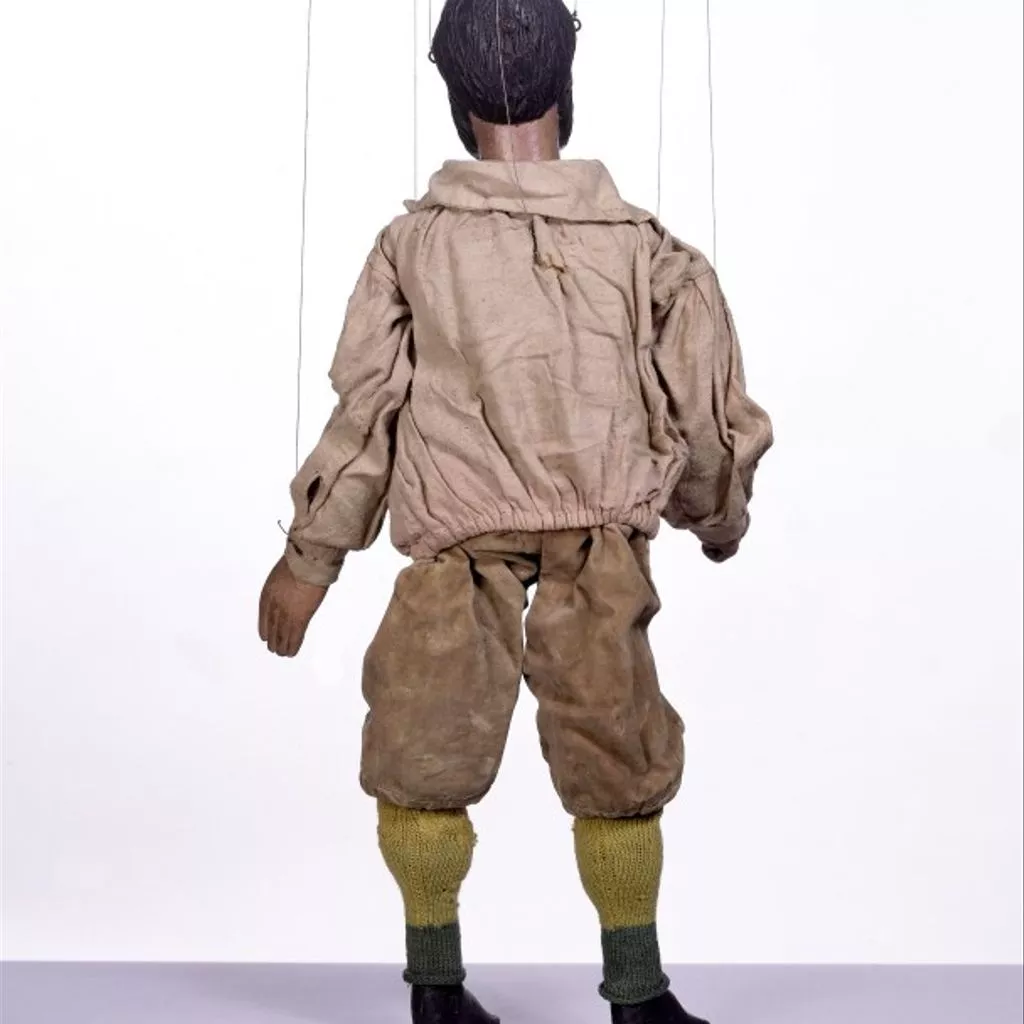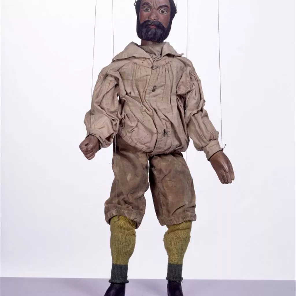 This is one of 35 marionettes from the Tiller-Clowes troupe, one of the last Victorian marionette troupes in England. Marionette shows were a popular form of entertainment for adults in the 19th century, many of them family concerns which travelled around the country long before the advent of film and television, presenting shortened versions of London's latest popular entertainment from melodramas and pantomimes to minstrel shows and music hall. In the 18th and early 19th centuries their theatres were relatively makeshift, but after about 1860 many became quite elaborate, with walls constructed from wooden shutters, seating made from tiered planks of wood, and canvas roofs.