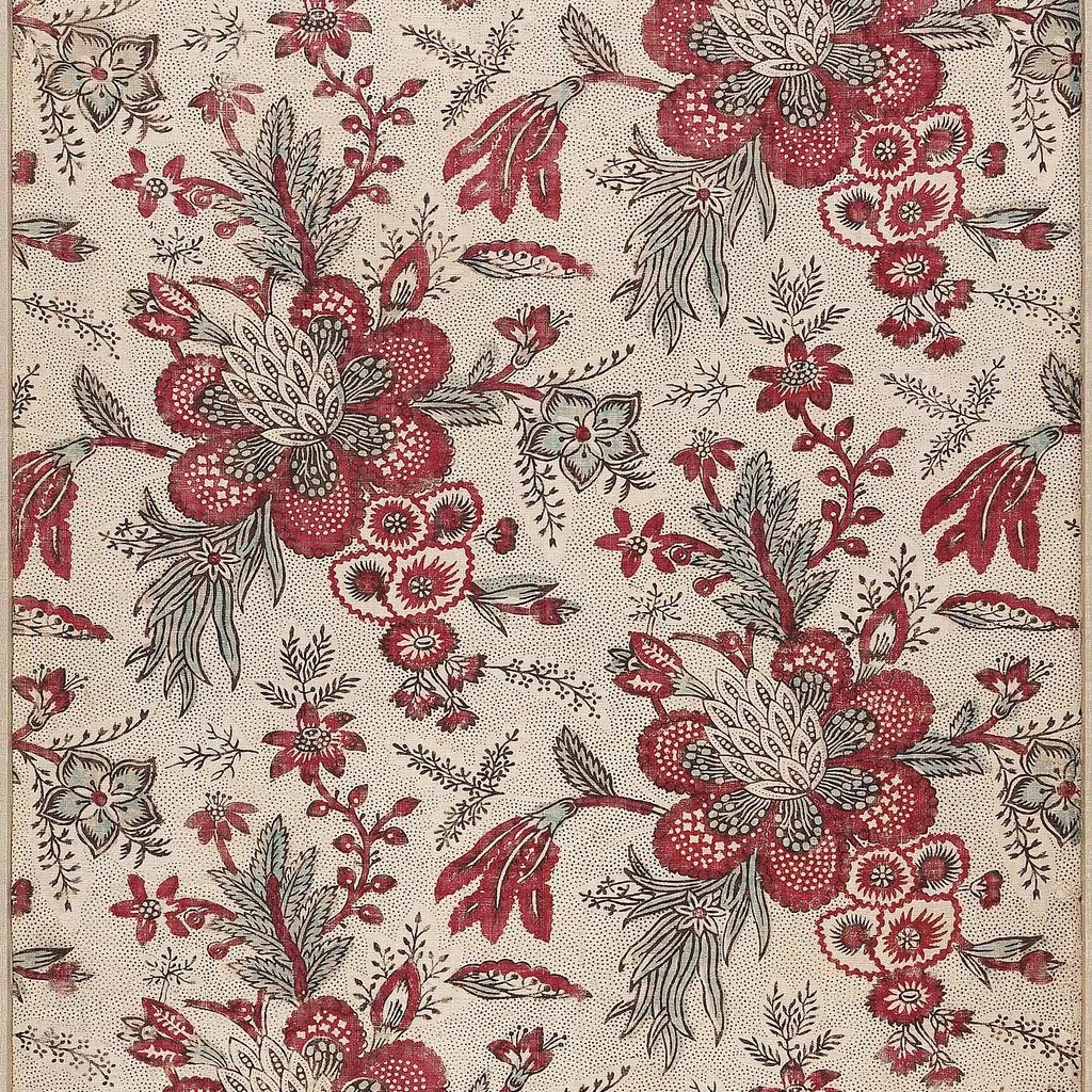 Woodblock print on coarse cotton, in red, blue and purplish-black. On ground covered with black dots is an all-over design showing a single repeating motif: a bouquet of real and fantastic flowers, branches and leaves. Selvedge on right side. A few small holes.