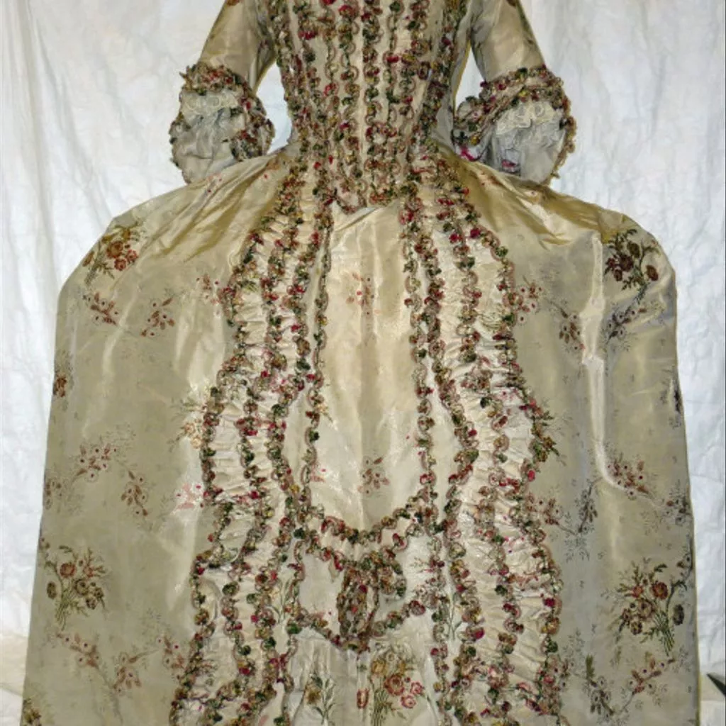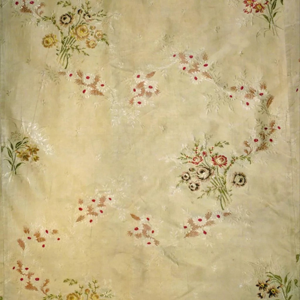 A woman's sack, petticoat and stomacher of ivory figured silk, brocaded in floral motifs in pink, maroon, green silks. The sack is open at the front with robings to the waist and elbow-length sleeves with triple, scalloped sleeve ruffles. The bodice and sleeves are lined with linen. At the back are two double box pleats stitched at the neckline. The sack is made of 6 widths of silk; there is a waist seam running from front edge to the bodice side-back seams. The skirts are pleated on either side of the pocket openings in the skirt side seams. Down the robings and around the back neck is a box-pleated ruching, edged with a fringe of white silk gimp, maroon silk and pink, white & green floss knots. This continues down the skirt fronts in a serpentine line, with a second line of ruching. The gimp and floss fringe edges the skirt fronts and the sleeve ruffles.