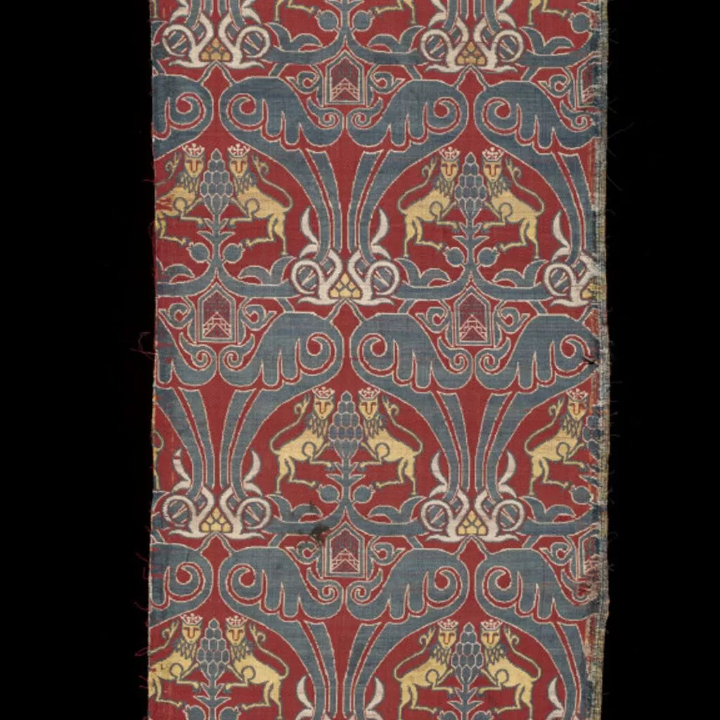 Textile fragment with crowned lions within a network of swooping half-palmettes, in red, blue and yellow.