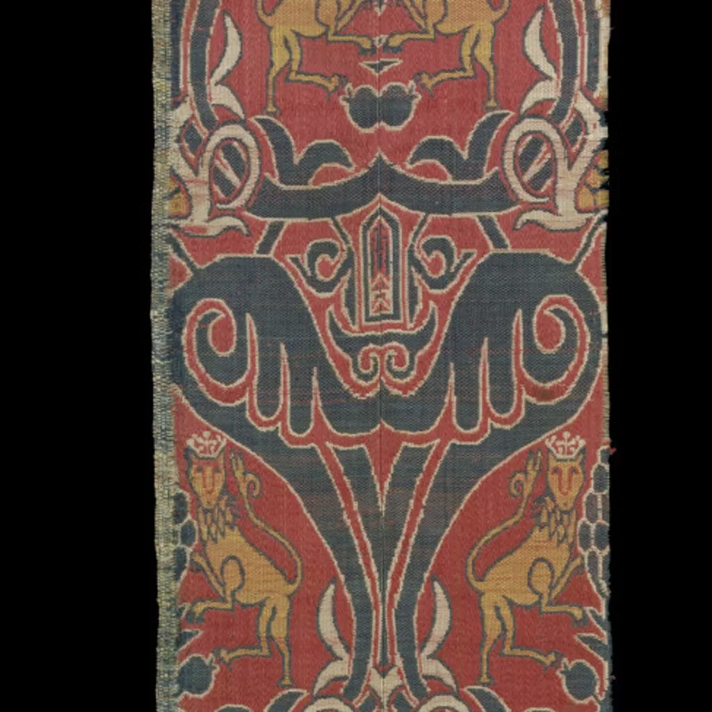 This design was popular with Christian patrons and survives in numbers that imply it was made in quantity. It may have originated as a simplified form of the lion-on-lotus design in Nasrid brocades. The iconography may suggest a desire to promote the propagandistic message of the triumph of Christianity over Islam - the lions stand above an upturned shield and trample on pomegranates. (M. Rosser-Owen, 2010).