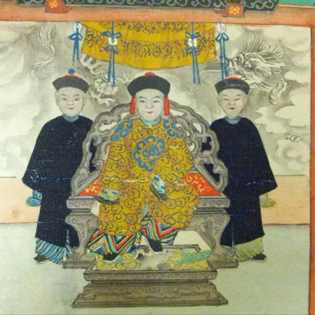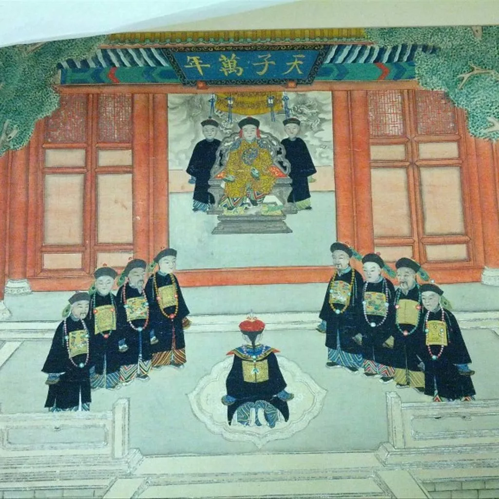 The Emperor Holding an Audience with Officials, Zhejiang province, Pap, China, paintings and drawings Scene of nine officials holding an audience with the Emperor. The officials are identifiable by their rank badges, sewn onto the front of their robes. At the lower centre of the painting one official is kneeling at the centre of a platform outside the building in which the emperor sits. The kneeling official is flanked by two groups of four other officials on either side. The emperor is seated in a relaxed posture on a throne within the building. Two figures without rank badges stand behind the throne, and behind them is a screen painted with a dragon among clouds. The sign board at the top of the building reads: "Long live the Son of Heaven" (Tianzi Wannian 天子萬年). The entire silk surface of the silk painting is filled, instead of following conventions of Chinese visual culture and leaving blank space known as reserve white (liubai ) . The image conspicuously experiments with single point perspective, seen in the diagonal arrangement of the standing officials, and the left and right edges of the sign board.