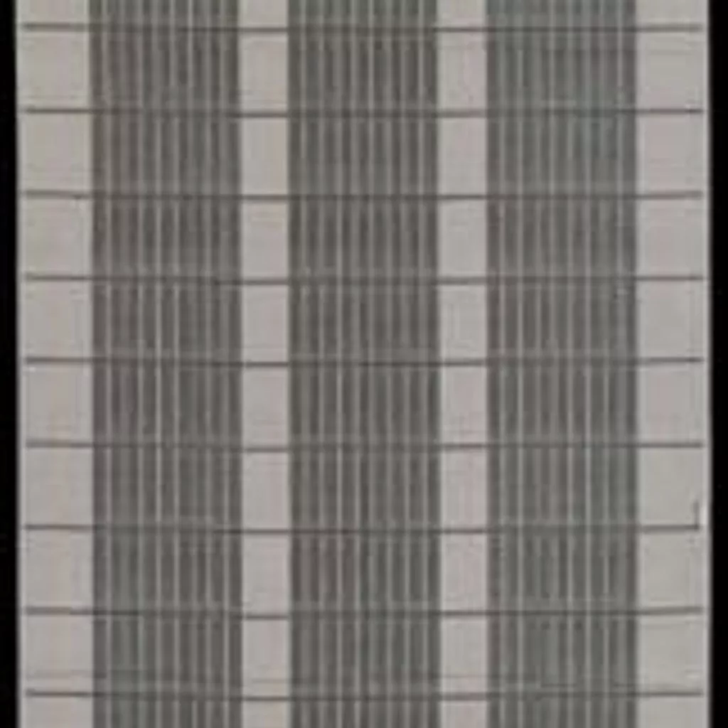 Rectangular linen damask tablecloth with pattern of wide vertical lines and narrow horizontal ones, in two tones of gray. Tampella mark ("TL" in circle) in each corner, in mirror-image. Adhesive paper labels: Tampella / Made in Finland / Linen Damask Tablecloth / No. 577, 1/1 bl./black / 59" x 94", and "Made in Finland."