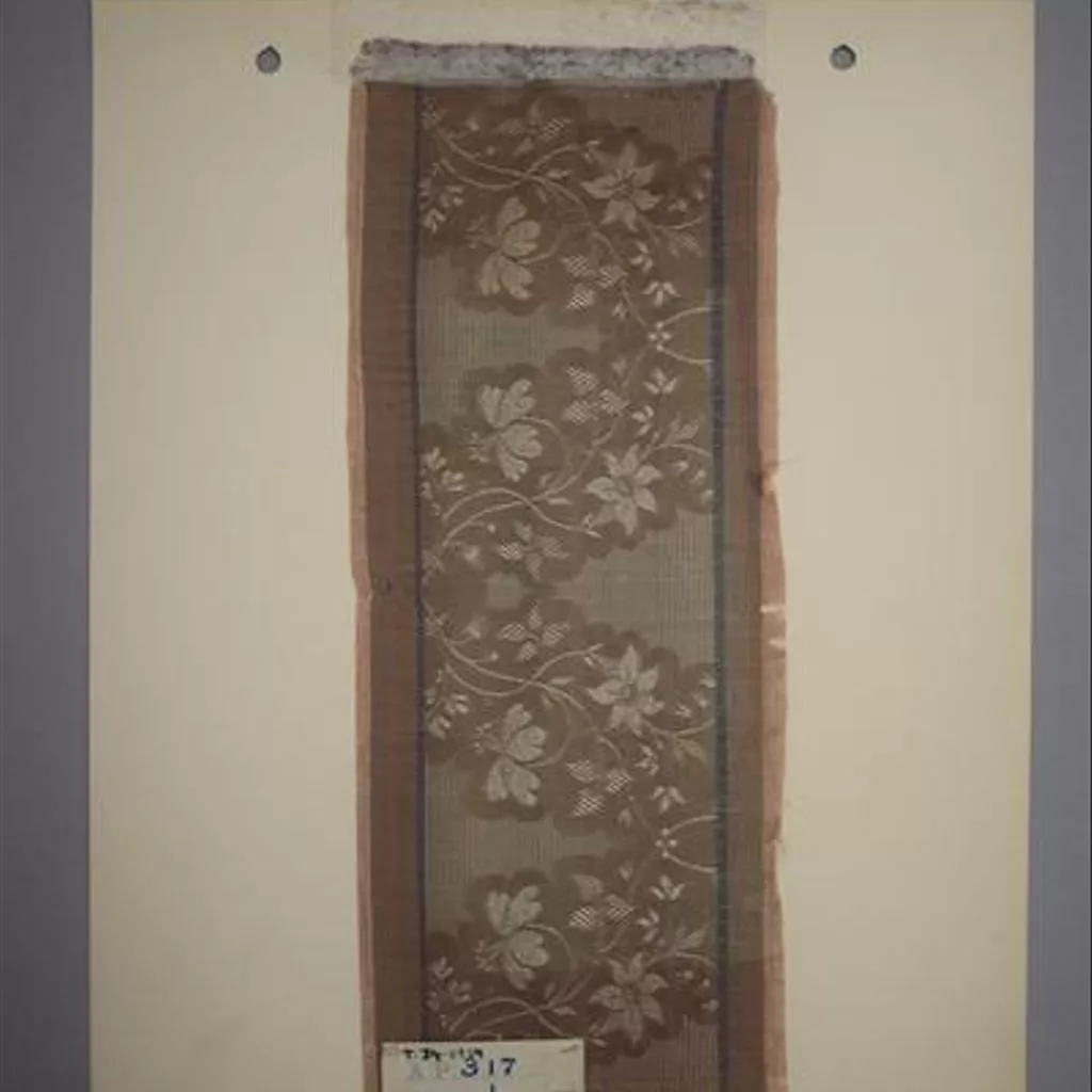Textile sample of Jacquard-woven silk, Derby, 1830 Textile sample of Jacquard-woven silk. With a two-inch wide design of trailing stems, leaves and flowers. Reddish-brown silk and with the pattern edged with a thin blue line on either side.